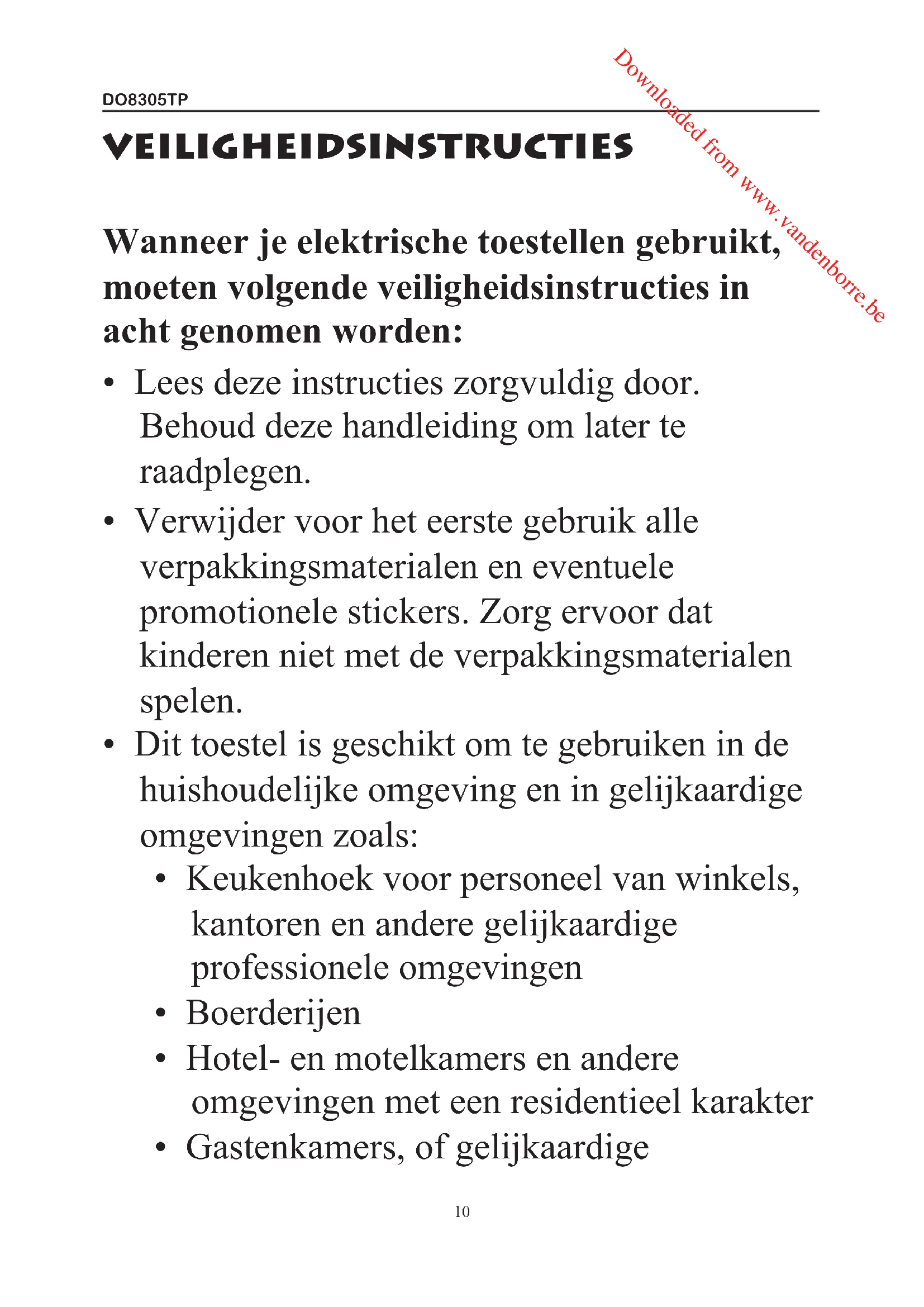 - Dit toestel is voorzien met een korte voedingskabel, om het risico te verminderen dat personen of objecten vast komen zitten of vallen over een Downloaded from www.vandenborre.beDO8305TP