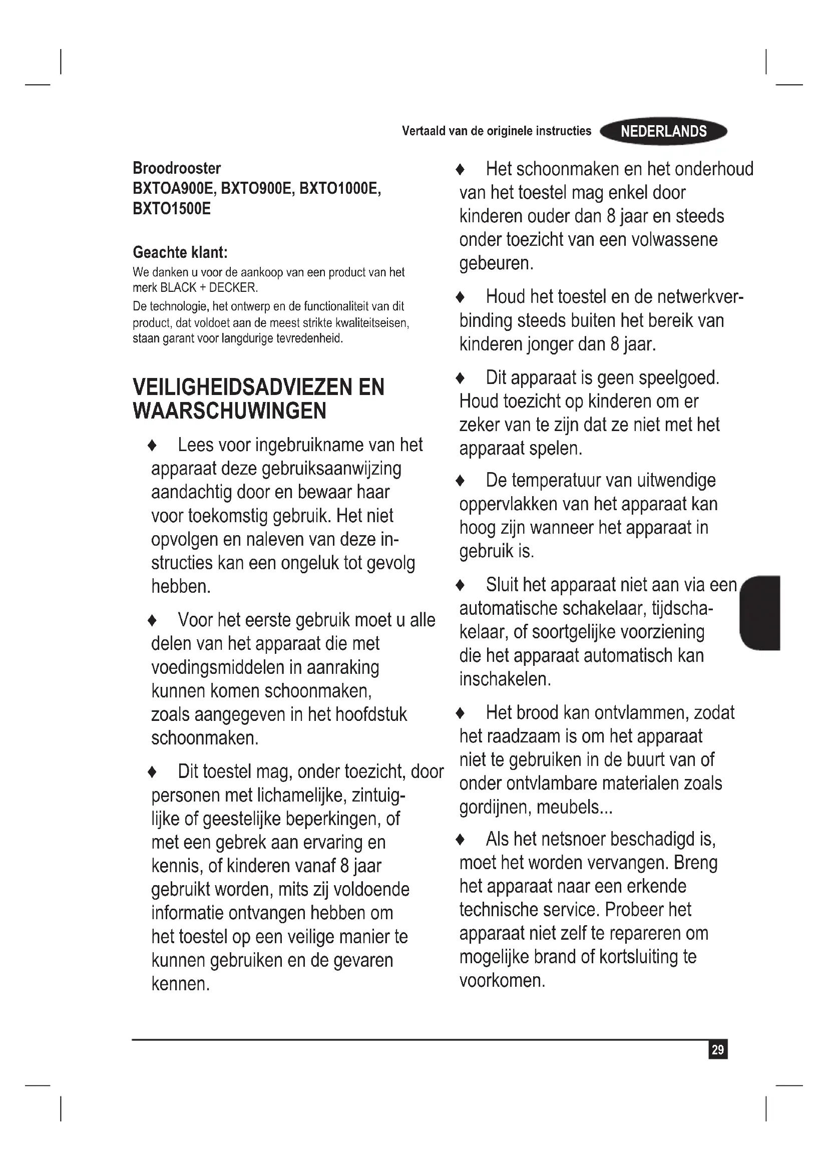 Broodrooster BXTOA900E, BXTO900E, BXTO1000E, BXTO1500E Geachte klant: We danken u voor de aankoop van een product van het merk BLACK + DECKER. De technologie, het ontwerp en de functionaliteit van dit product, dat voldoet aan de meest strikte kwaliteitseisen, staan garant voor langdurige tevredenheid. VEILIGHEIDSADVIEZEN EN WAARSCHUWINGEN ♦ Lees voor ingebruikname van het apparaat deze gebruiksaanwijzing aandachtig door en bewaar haar voor toekomstig gebruik. Het niet opvolgen en naleven van deze in- structies kan een ongeluk tot gevolg hebben. ♦ Voor het eerste gebruik moet u alle delen van het apparaat die met voedingsmiddelen in aanraking kunnen komen schoonmaken, zoals aangegeven in het hoofdstuk schoonmaken. ♦ Dit toestel mag, onder toezicht, door personen met lichamelijke, zintuig- lijke of geestelijke beperkingen, of met een gebrek aan ervaring en kennis, of kinderen vanaf 8 jaar gebruikt worden, mits zij voldoende informatie ontvangen hebben om het toestel op een veilige manier te kunnen gebruiken en de gevaren kennen. ♦ Het schoonmaken en het onderhoud van het toestel mag enkel door kinderen ouder dan 8 jaar en steeds onder toezicht van een volwassene gebeuren. ♦ Houd het toestel en de netwerkver- binding steeds buiten het bereik van kinderen jonger dan 8 jaar. ♦ Dit apparaat is geen speelgoed. Houd toezicht op kinderen om er zeker van te zijn dat ze niet met het apparaat spelen. ♦ De temperatuur van uitwendige oppervlakken van het apparaat kan hoog zijn wanneer het apparaat in gebruik is. ♦ Sluit het apparaat niet aan via een automatische schakelaar, tijdscha- kelaar, of soortgelijke voorziening die het apparaat automatisch kan inschakelen. ♦ Het brood kan ontvlammen, zodat het raadzaam is om het apparaat niet te gebruiken in de buurt van of onder ontvlambare materialen zoals gordijnen, meubels... ♦ Als het netsnoer beschadigd is, moet het worden vervangen. Breng het apparaat naar een erkende technische service. Probeer het apparaat niet zelf te repareren om mogelijke brand of kortsluiting te voorkomen.NEDERLANDS Vertaald van de originele instructies
