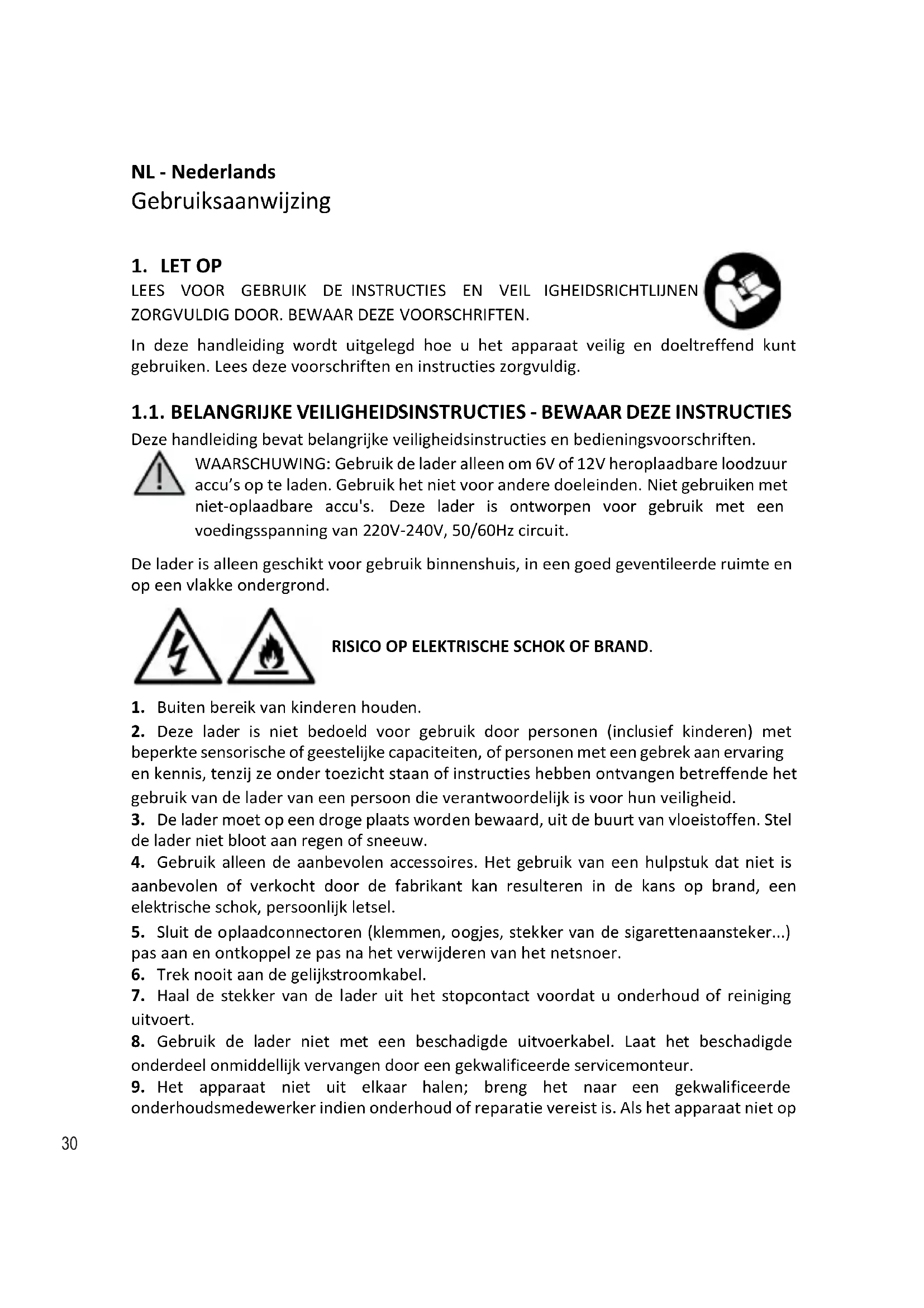 Deze handleiding bevat belangrijke veiligheidsinstructies en bedieningsvoorschriften. WAARSCHUWING: Gebruik de lader alleen om 6V of 12V heroplaadbare loodzuur accu’s op te laden. Gebruik het niet voor andere doeleinden. Niet gebruiken met niet-oplaadbare accu's. Deze lader is ontworpen voor gebruik met een voedingsspanning van 220V-240V, 50/60Hz circuit.