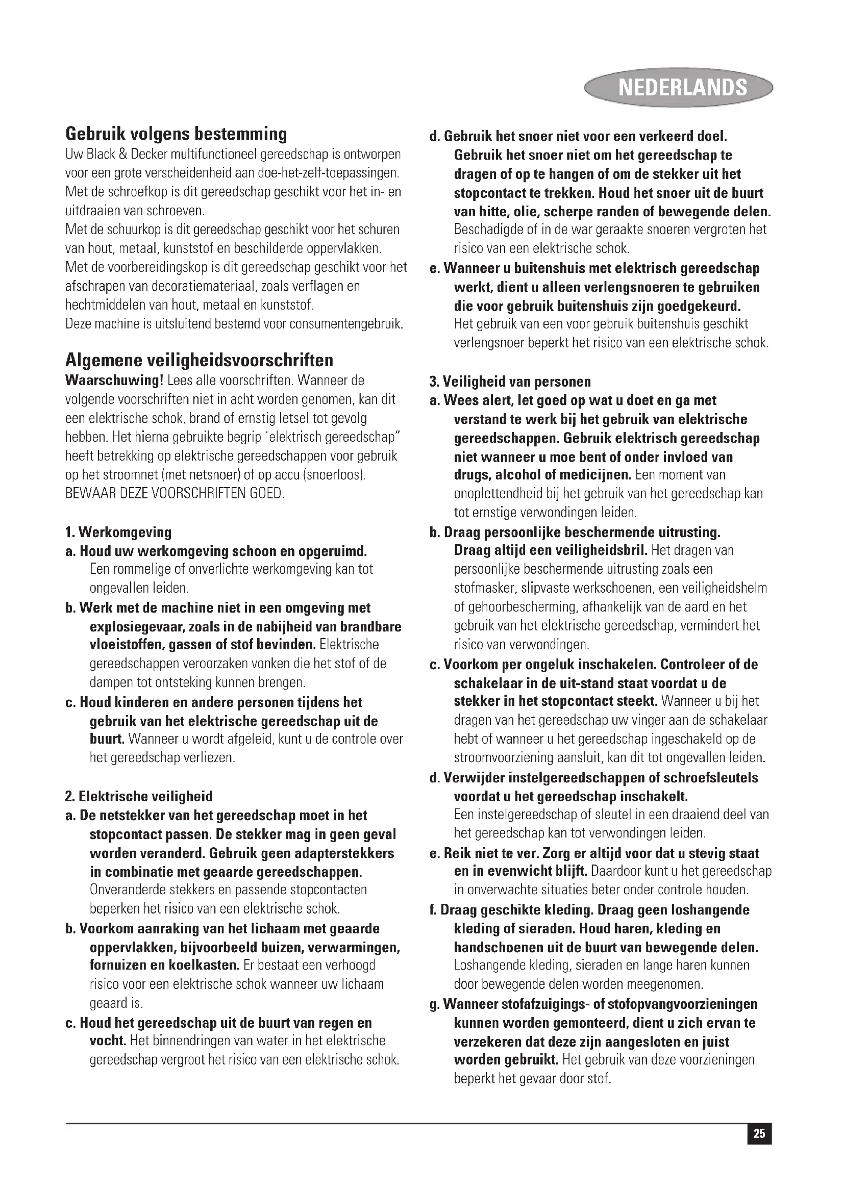 (meetonzekerheid geluidsvermogen) 3 dB(A) Kevin Hewitt Director of Consumer Engineering Spennymoor, County Durham DL16 6JG, Verenigd Koninkrijk 1-12-2004 Garantie Black & Decker heeft vertrouwen in zijn producten en biedt een uitstekende garantie. Deze garantiebepalingen vormen een aanvulling op uw wettelijke rechten en beperken deze niet. De garantie geldt in de lidstaten van de Europese Unie en de Europese Vrijhandelsassociatie. Mocht uw Black & Decker product binnen 24 maanden na datum van aankoop defect raken tengevolge van materiaal- of constructiefouten, dan garanderen wij de kosteloze vervanging van defecte onderdelen, de reparatie van het product of de vervanging van het product, tenzij: ◆ Het product is gebruikt voor handelsdoeleinden, professionele toepassingen of verhuurdoeleinden; ◆ Het product onoordeelkundig is gebruikt; ◆ Het product is beschadigd door invloeden van buitenaf of door een ongeval; ◆ Reparaties zijn uitgevoerd door anderen dan onze servicecentra of Black & Decker personeel. Om een beroep op de garantie te doen, dient u een aankoopbewijs te overhandigen aan de verkoper of een van onze servicecentra. U kunt het adres van het dichtstbijzijnde servicecentrum opvragen via de adressen op de achterzijde van deze handleiding. U kunt ook een lijst van onze servicecentra en meer informatie m.b.t. onze klantenservice vinden op het volgende Internet-adres: www.2helpU.com Meld u aan op onze website www.blackanddecker.nl om te worden geïnformeerd over nieuwe producten en speciale aanbiedingen. Verdere informatie over het merk Black & Decker en onze producten vindt u op www.blackanddecker.nl30 ESPAÑOL Uso previsto Su herramienta multifunción de Black & Decker está diseñada para una amplia gama de tareas de bricolaje. Usando el cabezal atornillador, la herramienta puede emplearse para tareas de atornillado/desatornillado. Usando el cabezal lijador, la herramienta puede emplearse para lijar madera, metales, plásticos y superficies pintadas. Usando el cabezal de preparación, la herramienta puede emplearse para decapar materiales decorativos, como capas de pintura y adhesivos, de madera, metal y plásticos. Esta herramienta está pensada únicamente para uso doméstico. Normas de seguridad generales ¡Advertencia! Lea íntegramente estas instrucciones. En caso de no atenerse a las instrucciones de seguridad siguientes, ello puede dar lugar a una descarga eléctrica, incendio o lesión grave. El término “herramienta eléctrica” empleado en las advertencias indicadas a continuación se refiere a la herramienta eléctrica con alimentación de red (con cable) o alimentada por batería (sin cable). GUARDE ESTAS INSTRUCCIONES EN UN LUGAR SEGURO.