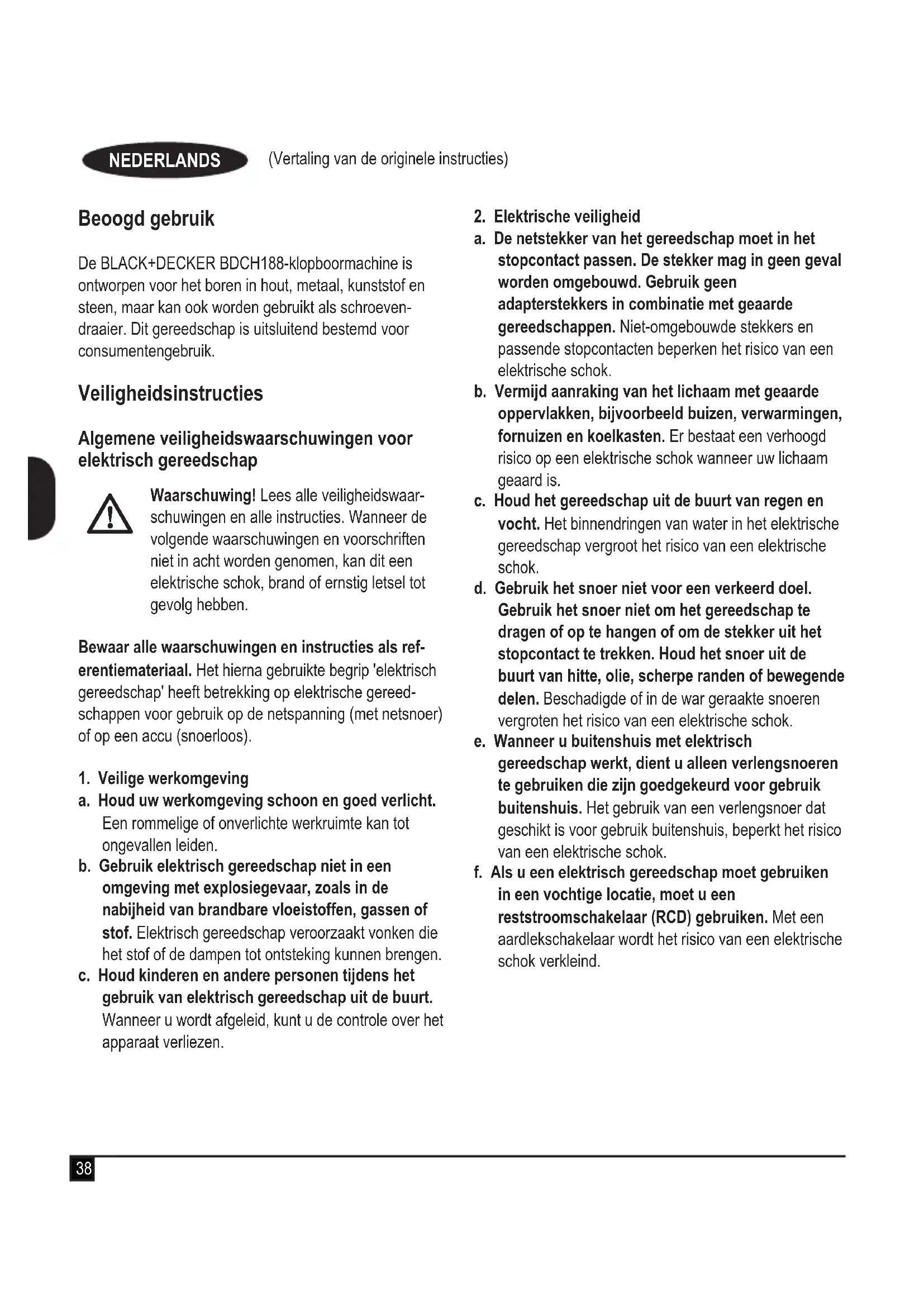 BDCH188-klopboormachine Black & Decker verklaart dat deze producten, die zijn beschreven bij 'Technische gegevens', voldoen aan: 2006/42/EG, EN 60745-1, EN 60745-2-1 Deze producten voldoen tevens aan richtlijn 2004/108/ EG (tot 19/04/2016) 2014/30/EU (vanaf 20/04/2016) en 2011/65/EU. Neem voor meer informatie contact op met Black & Decker op het volgende adres of raadpleeg de achterzijde van de handleiding. Ondergetekende is verantwoordelijk voor de compilatie van het technische bestand en doet deze verklaring namens Black & Decker. R. Laverick Engineering Manager Black & Decker Europe, 210 Bath Road, Slough, Berkshire, SL1 3YD Verenigd Koninkrijk 24/03/2015 Garantie Black & Decker heeft vertrouwen in haar producten en biedt een uitstekende garantie. Deze garantiebepalingen vormen een aanvulling op uw wettelijke rechten en be- perken deze niet. De garantie geldt in de lidstaten van de Europese Unie en de Europese Vrijhandelsassociatie. Mocht uw Black & Decker product binnen 24 maanden na de datum van aankoop defect raken ten gevolge van materiaal- of constructiefouten, dan garanderen wij de kosteloze vervanging van defecte onderdelen, de reparatie van het product of de vervanging van het product, tenzij: u Het product is gebruikt voor handelsdoeleinden, professionele toepassingen of verhuurdoeleinden. u Het product onoordeelkundig is gebruikt. u Het product is beschadigd door invloeden van buitenaf of door een ongeval. u Reparaties zijn uitgevoerd door anderen dan onze servicecentra of Black & Decker-personeel. Om een beroep te doen op de garantie, dient u een aankoopbewijs te overhandigen aan de verkoper of een van onze servicecentra. U kunt het adres van het dichtstbijzijnde Black & Decker-servicecentrum opvragen via de adressen op de achterzijde van deze handleiding. U kunt ook een lijst van Black & Decker-servicecentra en meer informatie m.b.t. onze klantenservice vinden op het volgende internetadres: www.2helpU.com Meld u aan op onze website www.blackanddecker.nl om uw nieuwe BLACK+DECKER-product te registreren en om te worden geïnformeerd over nieuwe producten en speciale aanbiedingen. Verdere informatie over het merk BLACK+DECKER en onze producten vindt u op www. blackanddecker.nl.(Traducción de las instrucciones originales)