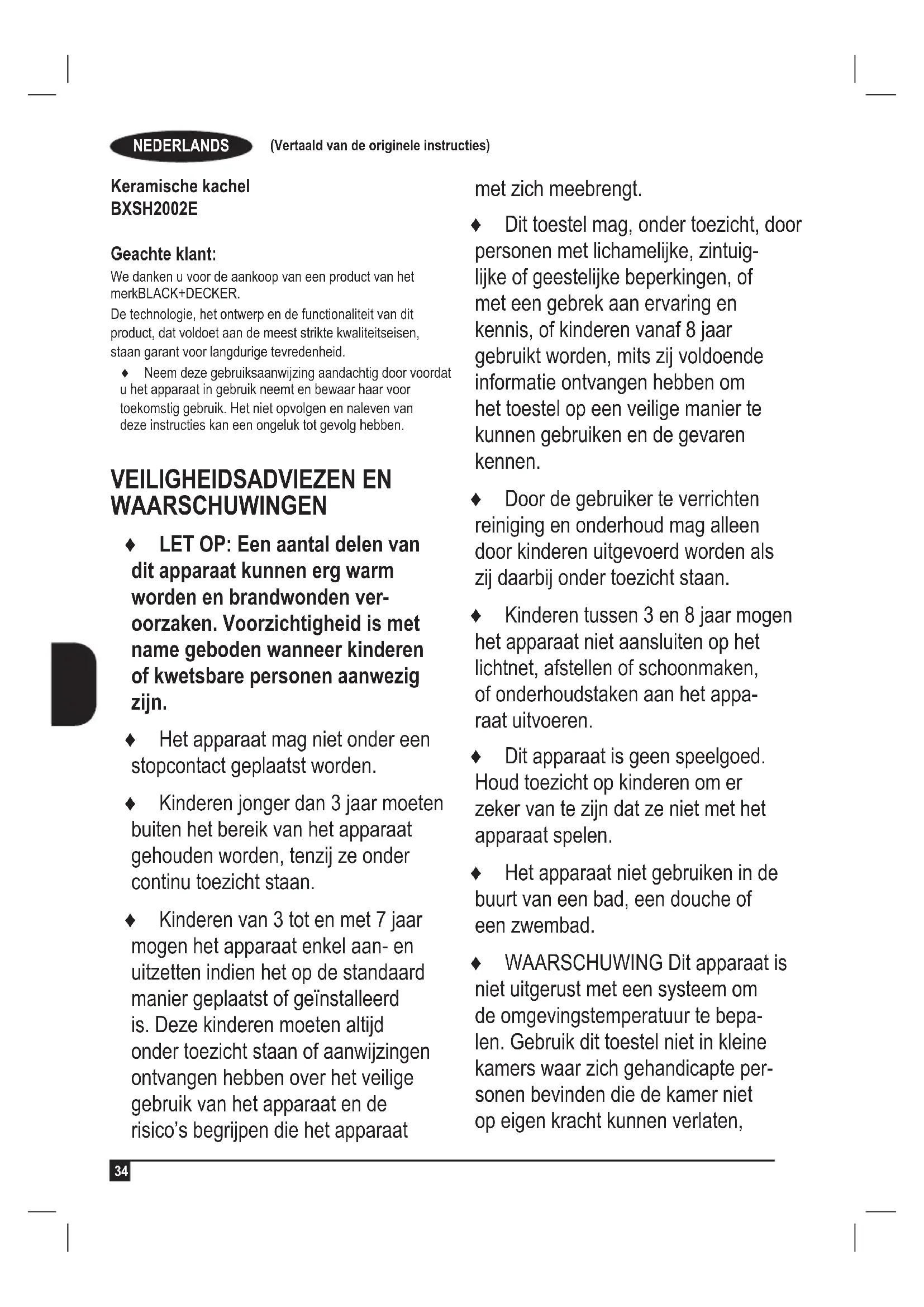 Keramische kachel BXSH2002E Geachte klant: We danken u voor de aankoop van een product van het merkBLACK+DECKER. De technologie, het ontwerp en de functionaliteit van dit product, dat voldoet aan de meest strikte kwaliteitseisen, staan garant voor langdurige tevredenheid. ♦ Neem deze gebruiksaanwijzing aandachtig door voordat u het apparaat in gebruik neemt en bewaar haar voor toekomstig gebruik. Het niet opvolgen en naleven van deze instructies kan een ongeluk tot gevolg hebben. VEILIGHEIDSADVIEZEN EN WAARSCHUWINGEN ♦ LET OP: Een aantal delen van dit apparaat kunnen erg warm worden en brandwonden ver- oorzaken. Voorzichtigheid is met name geboden wanneer kinderen of kwetsbare personen aanwezig zijn. ♦ Het apparaat mag niet onder een stopcontact geplaatst worden. ♦ Kinderen jonger dan 3 jaar moeten buiten het bereik van het apparaat gehouden worden, tenzij ze onder continu toezicht staan. ♦ Kinderen van 3 tot en met 7 jaar mogen het apparaat enkel aan- en uitzetten indien het op de standaard manier geplaatst of geïnstalleerd is. Deze kinderen moeten altijd onder toezicht staan of aanwijzingen ontvangen hebben over het veilige gebruik van het apparaat en de risico’s begrijpen die het apparaat met zich meebrengt. ♦ Dit toestel mag, onder toezicht, door personen met lichamelijke, zintuig- lijke of geestelijke beperkingen, of met een gebrek aan ervaring en kennis, of kinderen vanaf 8 jaar gebruikt worden, mits zij voldoende informatie ontvangen hebben om het toestel op een veilige manier te kunnen gebruiken en de gevaren kennen. ♦ Door de gebruiker te verrichten reiniging en onderhoud mag alleen door kinderen uitgevoerd worden als zij daarbij onder toezicht staan. ♦ Kinderen tussen 3 en 8 jaar mogen het apparaat niet aansluiten op het lichtnet, afstellen of schoonmaken, of onderhoudstaken aan het appa- raat uitvoeren. ♦ Dit apparaat is geen speelgoed. Houd toezicht op kinderen om er zeker van te zijn dat ze niet met het apparaat spelen. ♦ Het apparaat niet gebruiken in de buurt van een bad, een douche of een zwembad. ♦ WAARSCHUWING Dit apparaat is niet uitgerust met een systeem om de omgevingstemperatuur te bepa- len. Gebruik dit toestel niet in kleine kamers waar zich gehandicapte per- sonen bevinden die de kamer niet op eigen kracht kunnen verlaten,NEDERLANDS (Vertaald van de originele instructies)
