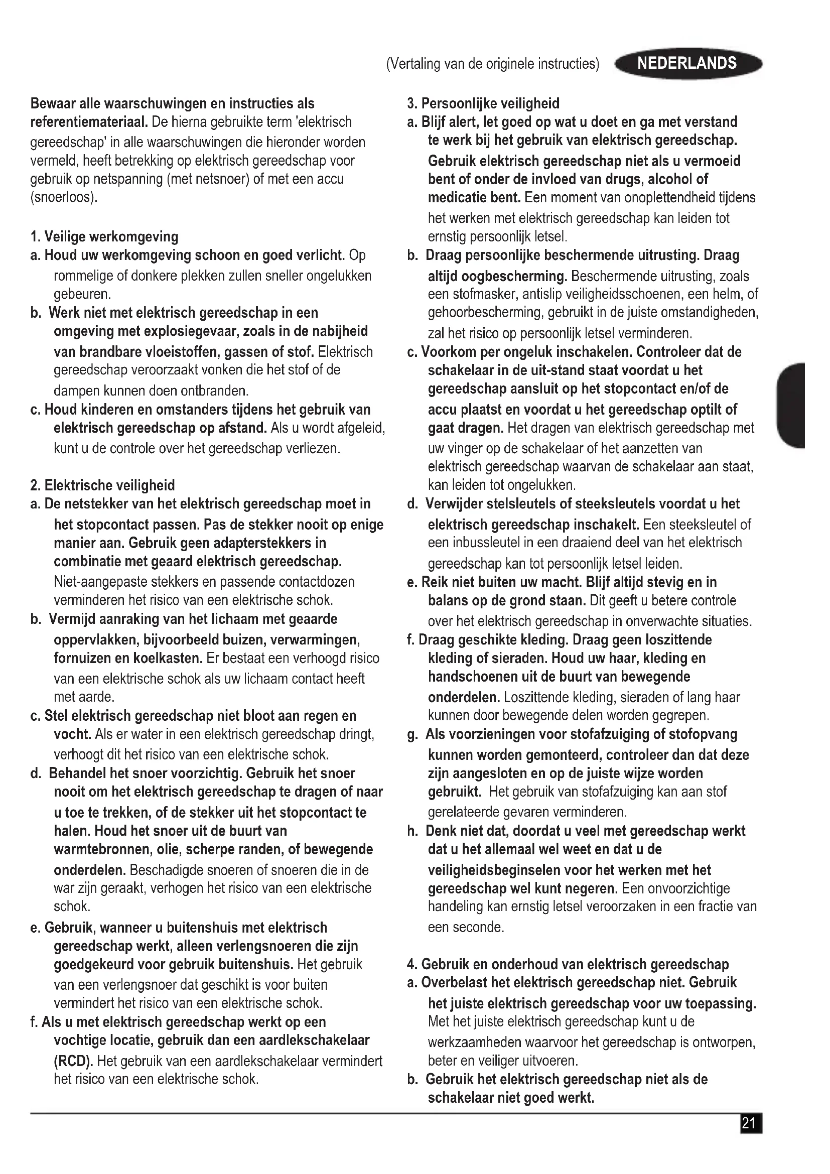 a. Overbelast het elektrisch gereedschap niet. Gebruik het juiste elektrisch gereedschap voor uw toepassing. Met het juiste elektrisch gereedschap kunt u de werkzaamheden waarvoor het gereedschap is ontworpen, beter en veiliger uitvoeren. b. Gebruik het elektrisch gereedschap niet als de schakelaar niet goed werkt.22 (Vertaling van de originele instructies) NEDERLANDS Ieder elektrisch gereedschap dat niet met de schakelaar kan worden bediend, is gevaarlijk en moet worden gerepareerd. c. Trek de stekker uit het stopcontact en/of de accu uit het elektrisch gereedschap voordat u het gereedschap instelt, accessoires wisselt of het elektrisch gereedschap opbergt. Dergelijke preventieve veiligheidsmaatregelen verminderen het risico dat het elektrisch gereedschap per ongeluk wordt gestart. d. Bewaar elektrisch gereedschap dat niet wordt gebruikt, buiten bereik van kinderen. Laat niet personen die er niet vertrouwd mee zijn en deze aanwijzingen niet hebben gelezen met het gereedschap werken. Elektrisch gereedschap is gevaarlijk in handen van ongetrainde gebruikers. e. Onderhoud elektrisch gereedschap en accessoires goed. Controleer dat bewegende delen van het elektrisch gereedschap wel goed functioneren en niet klemmen, en dat er niet onderdelen zodanig zijn gebroken of beschadigd dat de werking van het gereedschap nadelig wordt beïnvloed. Laat het gereedschap voor gebruik repareren als het beschadigd is. Veel ongelukken worden veroorzaakt door slecht onderhouden elektrisch gereedschap. f. Houd zaag- en snijgereedschap scherp en schoon. Goed onderhouden zaaggereedschap met scherpe snijvlakken loopt minder snel vast en is gemakkelijker onder controle te houden. g. Gebruik elektrisch gereedschap, accessoires, zaagjes en boortjes, enz., volgens deze aanwijzingen. Let daarbij op de arbeidsomstandigheden en de uit te voeren werkzaamheden. Gebruik van het elektrisch gereedschap voor werkzaamheden die anders zijn dan bedoeld, kan leiden tot een gevaarlijke situatie. h. Houd de handgrepen en oppervlak die u vastpakt, droog, schoon en vrij van olie en vet. Wanneer handgrepen en oppervlakken die u vastpakt, glad zijn, zijn veilig werken en goede controle over gereedschap in onverwachte situaties niet mogelijk.