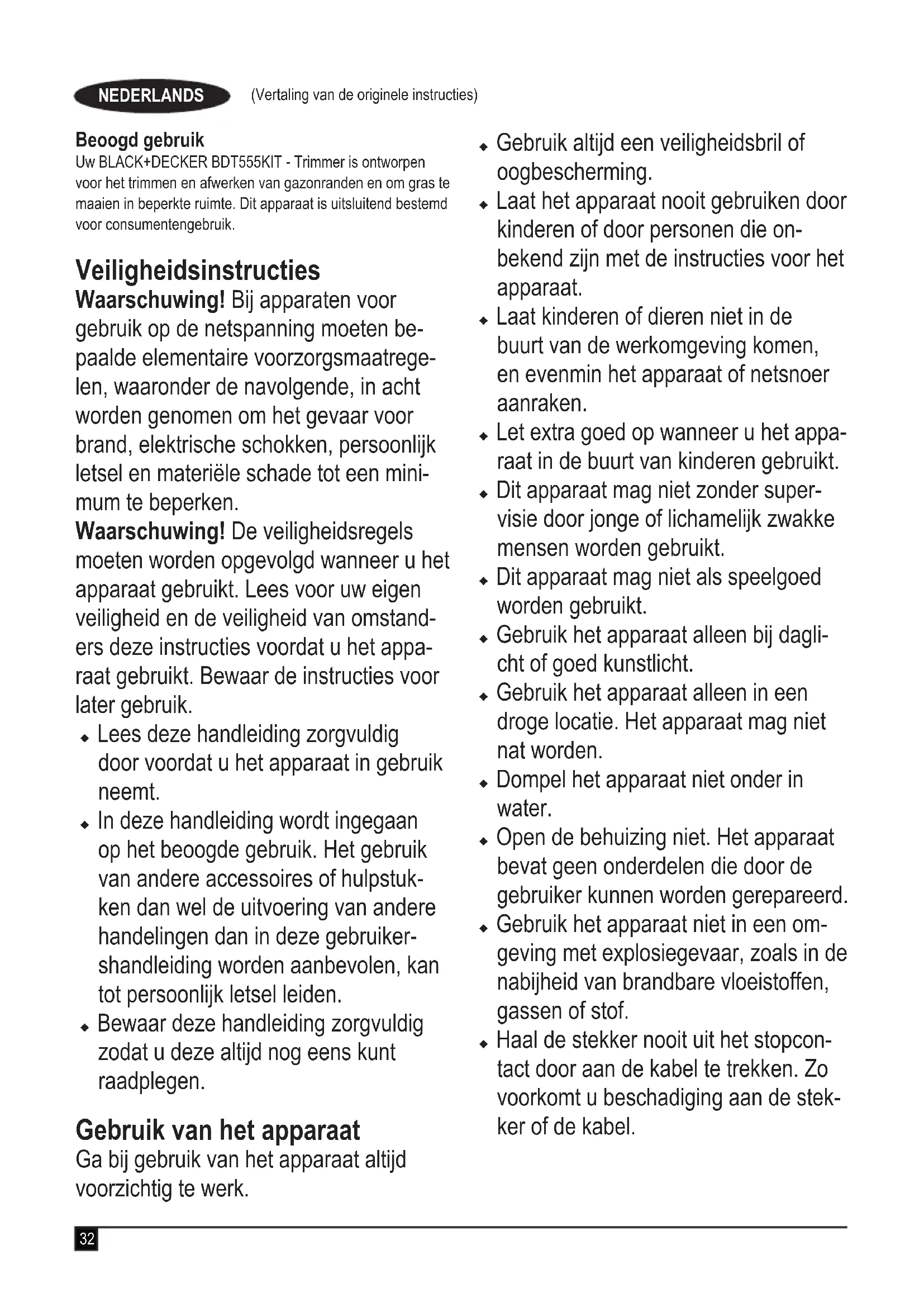 (pressione sonora garantita) 95 dB(A) Questi prodotti sono conformi alla Direttiva 2006/42/EC, 2014/108/UE e 2011/65/UE. Per ulteriori informazioni, contattare Black & Decker al seguente indirizzo oppure consultare l’ultima di copertina del manuale. Il sottoscritto è responsabile della redazione di questo documento tecnico e rilascia questa dichiarazione per conto di Black & Decker. R.Laverick Engineering Manager Black & Decker Europe, 210 Bath Road, Slough, Berkshire, SL1 3YD United Kingdom 27/11/2018 Garanzia Black & Decker è certa della qualità dei propri prodotti e offre ai consumatori una garanzia di 24 mesi dalla data di acquisto. Il presente certicato di garanzia è complementare ai diritti legali e non li pregiudica in alcun modo. La garanzia è valida sui territori degli Stati membri dell’Unione Europea o dell’EFTA (Associazione europea di libero scambio). Per attivare la garanzia, la richiesta di intervento e riparazione in garanzia deve essere effettuata in accordo con i Termini e condizioni Black & Decker e sarà necessario presentare la prova di acquisto al venditore o all’agente di riparazione autorizzato. I Termini e condizioni della garanzia Black & Decker di 2 anni e la sede dell’agente di riparazione autorizzato più vicino sono consultabili su Internet all’indirizzo www.2helpU.com oppure è possibile contattare l’ufcio Black & Decker di zona all’indirizzo indicato in questo manuale. Visitare il nostro sito www.blackanddecker.it per registrare il prodotto Black & Decker appena acquistato e ricevere gli aggiornamenti su nuovi prodotti e offerte speciali.32 (Vertaling van de originele instructies) NEDERLANDS Beoogd gebruik Uw BLACK+DECKER BDT555KIT - Trimmer is ontworpen voor het trimmen en afwerken van gazonranden en om gras te maaien in beperkte ruimte. Dit apparaat is uitsluitend bestemd voor consumentengebruik. Veiligheidsinstructies Waarschuwing! Bij apparaten voor gebruik op de netspanning moeten be- paalde elementaire voorzorgsmaatrege- len, waaronder de navolgende, in acht worden genomen om het gevaar voor brand, elektrische schokken, persoonlijk letsel en materiële schade tot een mini- mum te beperken. Waarschuwing! De veiligheidsregels moeten worden opgevolgd wanneer u het apparaat gebruikt. Lees voor uw eigen veiligheid en de veiligheid van omstand- ers deze instructies voordat u het appa- raat gebruikt. Bewaar de instructies voor later gebruik. u Lees deze handleiding zorgvuldig door voordat u het apparaat in gebruik neemt. u In deze handleiding wordt ingegaan op het beoogde gebruik. Het gebruik van andere accessoires of hulpstuk- ken dan wel de uitvoering van andere handelingen dan in deze gebruiker- shandleiding worden aanbevolen, kan tot persoonlijk letsel leiden. u Bewaar deze handleiding zorgvuldig zodat u deze altijd nog eens kunt raadplegen. Gebruik van het apparaat Ga bij gebruik van het apparaat altijd voorzichtig te werk. u Gebruik altijd een veiligheidsbril of oogbescherming. u Laat het apparaat nooit gebruiken door kinderen of door personen die on- bekend zijn met de instructies voor het apparaat. u Laat kinderen of dieren niet in de buurt van de werkomgeving komen, en evenmin het apparaat of netsnoer aanraken. u Let extra goed op wanneer u het appa- raat in de buurt van kinderen gebruikt. u Dit apparaat mag niet zonder super- visie door jonge of lichamelijk zwakke mensen worden gebruikt. u Dit apparaat mag niet als speelgoed worden gebruikt. u Gebruik het apparaat alleen bij dagli- cht of goed kunstlicht. u Gebruik het apparaat alleen in een droge locatie. Het apparaat mag niet nat worden. u Dompel het apparaat niet onder in water. u Open de behuizing niet. Het apparaat bevat geen onderdelen die door de gebruiker kunnen worden gerepareerd. u Gebruik het apparaat niet in een om- geving met explosiegevaar, zoals in de nabijheid van brandbare vloeistoffen, gassen of stof. u Haal de stekker nooit uit het stopcon- tact door aan de kabel te trekken. Zo voorkomt u beschadiging aan de stek- ker of de kabel.33 (Vertaling van de originele instructies) NEDERLANDS Veiligheid van anderen u Dit apparaat mag niet worden gebruikt door personen (waaronder kinderen) met een lichamelijke of geestelijke beperking of die geen ervaring met of kennis van dit apparaat hebben, tenzij ze onder toezicht staan of instructies krijgen wat betreft het gebruik van het apparaat van een persoon die verant- woordelijk is voor hun veiligheid. u Er moet toezicht worden gehouden op kinderen om ervoor te zorgen dat deze niet met het gereedschap spelen. Overige risico's Er kunnen zich tijdens het gebruik van het gereedschap ook andere risico's voordoen, die misschien niet in de bijgevoegde veiligheidswaarschuwingen worden vermeld. Deze risico's kunnen zich voordoen als gevolg van onoor- deelkundig gebruik, langdurig gebruik, enz. Zelfs als de veiligheidsvoorschriften in acht worden genomen en de veiligheids- voorzieningen worden geïmplementeerd, kunnen bepaalde risico's niet worden vermeden. Deze omvatten: u Verwondingen die worden veroorzaakt door het aanraken van draaiende of bewegende onderdelen. u Verwondingen die worden veroorzaakt bij het vervangen van onderdelen, bladen of accessoires. u Verwondingen die worden veroorzaakt door langdurig gebruik van het gereed- schap. Als u langere periodes met het gereedschap werkt, is het raadzaam om regelmatig een pauze in te lassen. u Gehoorbeschadiging. u Gezondheidsrisico's als gevolg van het inademen van stof dat door gebruik van het gereedschap wordt veroor- zaakt (bijvoorbeeld tijdens het werken met hout, vooral eiken, beuken en MDF.) Na gebruik u Bewaar het apparaat na gebruik op een droge, goed geventileerde plaats, buiten het bereik van kinderen. u Zorg dat het bewaarde apparaat niet toegankelijk is voor kinderen. u Wanneer het apparaat in de auto ligt, moet u het apparaat in de kofferruimte plaatsen of goed vastzetten, zodat het apparaat niet kan wegschieten bij plotselinge veranderingen in snelheid of richting. 