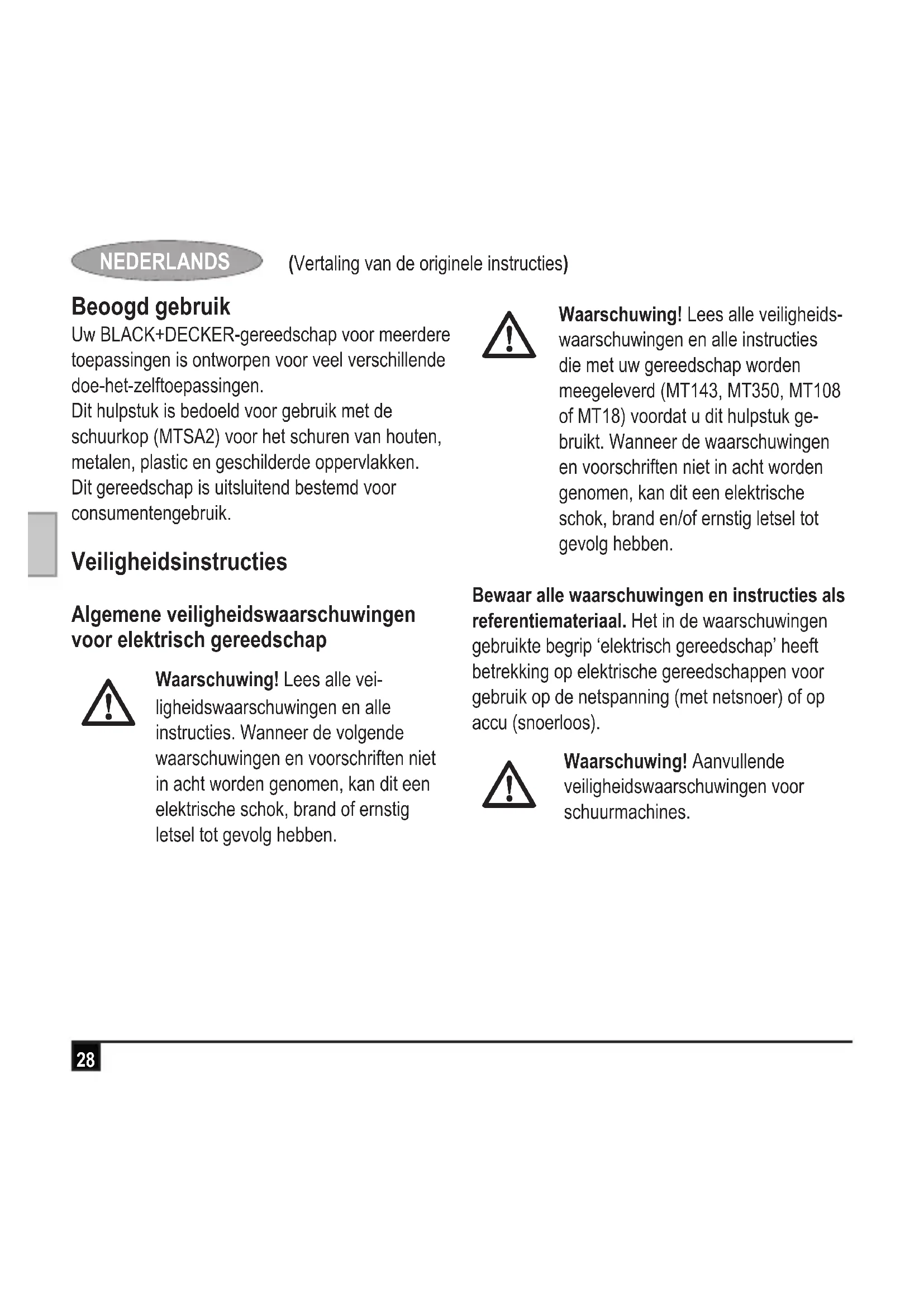 Waarschuwing! Lees alle veiligheids- waarschuwingen en alle instructies die met uw gereedschap worden meegeleverd (MT143, MT350, MT108 of MT18) voordat u dit hulpstuk ge- bruikt. Wanneer de waarschuwingen en voorschriften niet in acht worden genomen, kan dit een elektrische schok, brand en/of ernstig letsel tot gevolg hebben. Bewaar alle waarschuwingen en instructies als referentiemateriaal. Het in de waarschuwingen gebruikte begrip ‘elektrisch gereedschap’ heeft betrekking op elektrische gereedschappen voor gebruik op de netspanning (met netsnoer) of op accu (snoerloos).