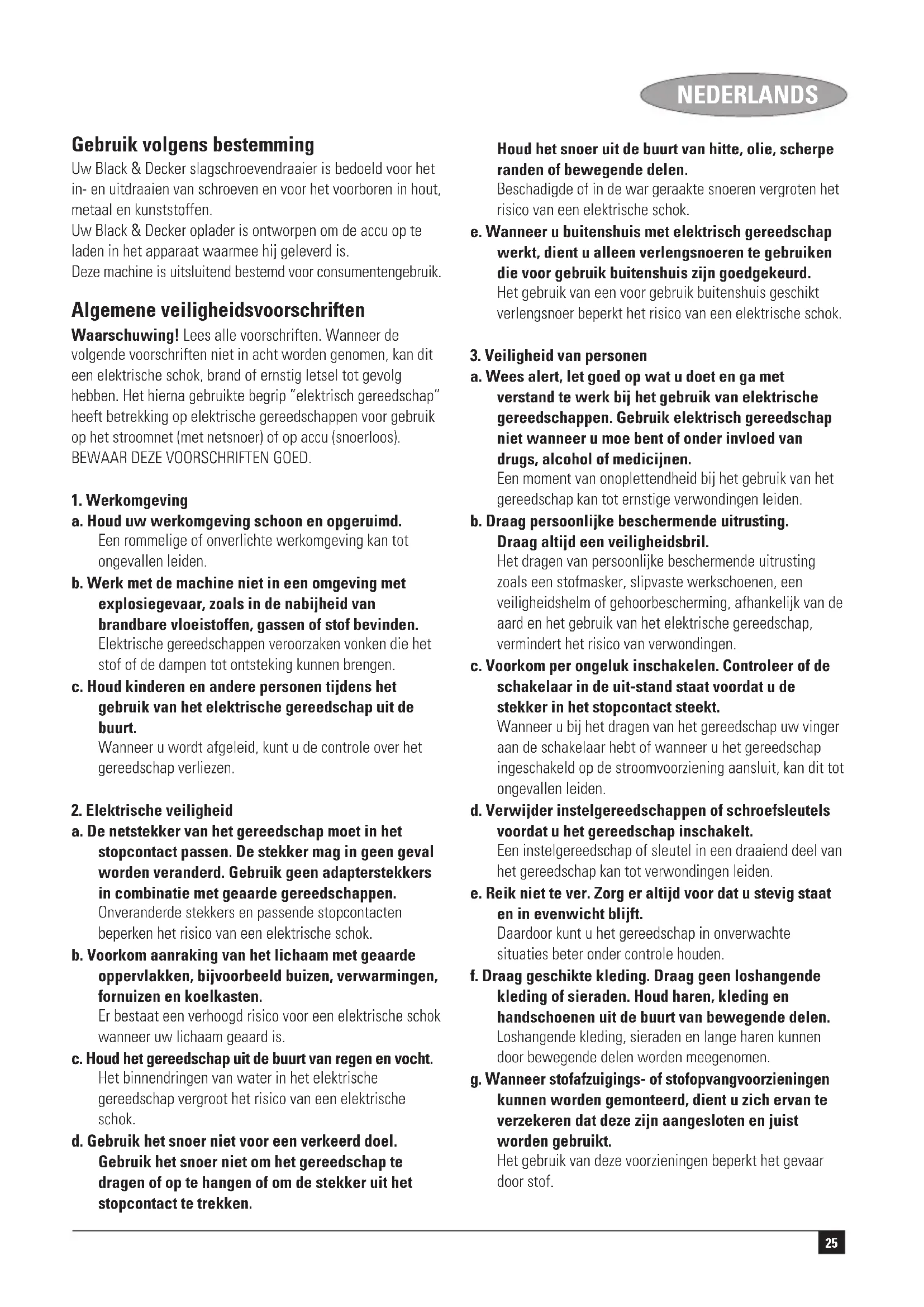 a. Laat het gereedschap alleen repareren door gekwalificeerd en vakkundig personeel en alleen met originele vervangingsonderdelen. Daarmee wordt de veiligheid van het gereedschap gewaarborgd. Aanvullende veiligheidsinstructies voor klopboormachines ◆ Draag oorbeschermers bij klopboormachines. Blootstelling aan geluid kan leiden tot gehoorbeschadiging. ◆ Gebruik de handgrepen die met de machine zijn meegeleverd. Het niet in bedwang kunnen houden van de machine kan leiden tot ongelukken. Aanvullende veiligheidsinstructies voor schroef/ boormachines ◆ Houd de machine alleen aan de geïsoleerde greepvlakken vast als u werkzaamheden uitvoert waarbij het zaagblad verborgen stroomleidingen of de eigen machinekabel kan raken. Het contact met een onder spanning staande leiding zet de zichtbare metalen machinedelen onder spanning en leidt tot een elektrische schok. ◆ Hanteer klemmen of een andere praktische manier om het werkstuk op een stabiele ondergrond vast te klemmen en te ondersteunen. Het werkstuk met de hand vasthouden of tegen het lichaam houden zorgt voor instabiliteit en kan leiden tot controleverlies.27 NEDERLANDS ◆ Controleer voordat u gaat boren in muren, vloeren of plafonds de locatie van eventueel aanwezige gas-, water- en elektriciteitsleidingen. ◆ Vermijd aanraking met de punt van de boor vlak na het boren, omdat deze heet kan zijn. Aanvullende veiligheidsvoorschriften voor accu’s en opladers Accu’s ◆ Probeer nooit een accu te openen. ◆ Stel de accu niet aan water bloot. ◆ Bewaar accu’s niet op plaatsen waar de temperatuur 40 °C kan overschrijden. ◆ Laad accu’s uitsluitend op bij een omgevingstemperatuur tussen 10 °C en 40 °C. ◆ Laad accu’s uitsluitend op met behulp van de meegeleverde oplader. ◆ Volg bij het afdanken van accu’s de instructies in de paragraaf “Milieu” op. Opladers ◆ Gebruik uw Black & Decker oplader uitsluitend voor het opladen van accu’s van het meegeleverde type. Andere accu’s kunnen barsten, waardoor letsel en materiële schade kunnen ontstaan. ◆ Probeer nooit om niet oplaadbare accu’s op te laden. ◆ Laat een defect netsnoer onmiddellijk vervangen. ◆ Stel de oplader niet aan water bloot. ◆ Open de oplader niet. ◆ Steek geen voorwerpen in het inwendige van de oplader. De oplader is uitsluitend bedoeld voor gebruik binnenshuis. Lees de gebruiksaanwijzing voor gebruik. Storingbestendige scheidingstransformator. De netspanning is elektrisch gescheiden van de uitgangsspanning van de transformator. De oplader sluit automatisch af als de omgevingstemperatuur te hoog wordt. Als een gevolg zal de oplader buiten werking raken. De eenheid moet van de netspanning worden ontkoppeld en voor reparatie naar een erkend servicecentrum worden gebracht. Elektrische veiligheid Uw oplader is dubbel geïsoleerd. Een aarddraad is daarom niet vereist. Controleer of de ingangsspanning van de oplader overeenkomt met de netspanning. Vervang de oplader nooit door een netstekker. ◆ Dit apparaat is niet bedoeld voor gebruik door jonge of lichamelijk zwakke personen zonder toezicht. Houd toezicht op kinderen om ervoor te zorgen dat zij niet met het apparaat gaan spelen. ◆ Indien het netsnoer is beschadigd, dient het ter voorkoming van gevaren te worden vervangen door de fabrikant of een erkend servicecentrum. Overzicht