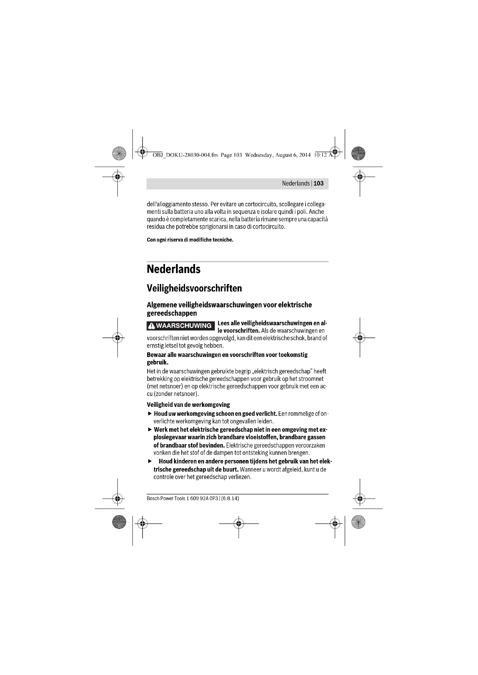 Wanneer stofafzuigings- of stofopvangvoorzieningen kunnen worden gemonteerd, dient u zich ervan te verzekeren dat deze zijn aangeslo- ten en juist worden gebruikt. Het gebruik van een stofafzuiging beperkt het gevaar door stof. Zorgvuldige omgang met en zorgvuldig gebruik van elektrische gereed- schappen Overbelast het gereedschap niet. Gebruik voor uw werkzaamheden het daarvoor bestemde elektrische gereedschap. Met het passende elektrische gereedschap werkt u beter en veiliger binnen het aangegeven capaciteitsbereik. Gebruik geen elektrisch gereedschap waarvan de schakelaar defect is. Elektrisch gereedschap dat niet meer kan worden in- of uitgeschakeld, is gevaarlijk en moet worden gerepareerd. Trek de stekker uit het stopcontact of neem de accu uit het elektri- sche gereedschap voordat u het gereedschap instelt, toebehoren wisselt of het gereedschap weglegt. Deze voorzorgsmaatregel voor- komt onbedoeld starten van het elektrische gereedschap. OBJ_DOKU-28030-004.fm Page 105 Wednesday, August 6, 2014 10:12 AM1 609 92A 0P3 | (6.8.14) Bosch Power Tools 106 | Nederlands Bewaar niet-gebruikte elektrische gereedschappen buiten bereik van kinderen. Laat het gereedschap niet gebruiken door personen die er niet mee vertrouwd zijn en deze aanwijzingen niet hebben gelezen. Elektrische gereedschappen zijn gevaarlijk wanneer deze door onervaren personen worden gebruikt. Verzorg het elektrische gereedschap zorgvuldig. Controleer of bewe- gende delen van het gereedschap correct functioneren en niet vast- klemmen en of onderdelen zodanig gebroken of beschadigd zijn dat de werking van het elektrische gereedschap nadelig wordt beïn- vloed. Laat deze beschadigde onderdelen voor het gebruik repare- ren. Veel ongevallen hebben hun oorzaak in slecht onderhouden elektri- sche gereedschappen. Houd snijdende inzetgereedschappen scherp en schoon. Zorgvuldig onderhouden snijdende inzetgereedschappen met scherpe snijkanten klemmen minder snel vast en zijn gemakkelijker te geleiden. Gebruik elektrisch gereedschap, toebehoren, inzetgereedschappen en dergelijke volgens deze aanwijzingen. Let daarbij op de arbeids- omstandigheden en de uit te voeren werkzaamheden. Het gebruik van elektrische gereedschappen voor andere dan de voorziene toepassingen kan tot gevaarlijke situaties leiden. Gebruik en onderhoud van accugereedschappen Laad accu’s alleen op in oplaadapparaten die door de fabrikant wor- den geadviseerd. Voor een oplaadapparaat dat voor een bepaald type accu geschikt is, bestaat brandgevaar wanneer het met andere accu’s wordt gebruikt. Gebruik alleen de daarvoor bedoelde accu’s in de elektrische gereed- schappen. Het gebruik van andere accu’s kan tot verwondingen en brand- gevaar leiden. Voorkom aanraking van de niet-gebruikte accu met paperclips, mun- ten, sleutels, spijkers, schroeven en andere kleine metalen voorwer- pen die overbrugging van de contacten kunnen veroorzaken. Kortslui- ting tussen de accucontacten kan brandwonden of brand tot gevolg hebben. Bij verkeerd gebruik kan vloeistof uit de accu lekken. Voorkom con- tact daarmee. Spoel bij onvoorzien contact met water af. Wanneer de OBJ_DOKU-28030-004.fm Page 106 Wednesday, August 6, 2014 10:12 AMBosch Power Tools 1 609 92A 0P3 | (6.8.14) Nederlands | 107 vloeistof in de ogen komt, dient u bovendien een arts te raadplegen. Gelekte accuvloeistof kan tot huidirritaties en verbrandingen leiden. Service Laat het elektrische gereedschap alleen repareren door gekwalifi- ceerd en vakkundig personeel en alleen met originele vervangings- onderdelen. Daarmee wordt gewaarborgd dat de veiligheid van het ge- reedschap in stand blijft. Veiligheidsvoorschriften voor schroevendraaiers Houd het gereedschap aan de geïsoleerde greepvlakken vast als u werkzaamheden uitvoert waarbij de schroef verborgen stroomleidin- gen kan raken. Contact van de schroef met een onder spanning staande leiding kan ook metalen delen van het gereedschap onder spanning zetten en tot een elektrische schok leiden. Houd het elektrische gereedschap goed vast. Bij het vast- of losdraaien van schroeven kunnen gedurende korte tijd grote reactiemomenten op- treden. Zet het werkstuk vast. Een met spanvoorzieningen of een bankschroef vastgehouden werkstuk wordt beter vastgehouden dan u met uw hand kunt doen. Wacht tot het elektrische gereedschap tot stilstand is gekomen voor- dat u het neerlegt. Het inzetgereedschap kan vasthaken en dit kan tot het verlies van de controle over het elektrische gereedschap leiden. Zet de draairichtingomschakelaar in de middelste stand voor werk- zaamheden aan het elektrische gereedschap (zoals het uitvoeren van onderhoud en het wisselen van inzetgereedschap) en voordat u het gereedschap vervoert of opbergt. Bij per ongeluk bedienen van de aan/uit-schakelaar bestaat verwondingsgevaar. Bescherm het elektrische gereedschap tegen hitte, bijvoor- beeld ook tegen voortdurend zonlicht, vuur, water en vocht. Er bestaat explosiegevaar. Bij beschadiging en onjuist gebruik van de accu kunnen er dampen vrijkomen. Zorg voor frisse lucht en raadpleeg bij klachten een arts. De dampen kunnen de luchtwegen irriteren. OBJ_DOKU-28030-004.fm Page 107 Wednesday, August 6, 2014 10:12 AM1 609 92A 0P3 | (6.8.14) Bosch Power Tools 108 | Nederlands Veiligheidsvoorschriften voor oplaadapparaten Dit oplaadapparaat is niet bestemd voor het gebruik door kinderen en personen met be- perkte fysieke, sensorische of geestelijke capaciteiten of gebrekkige ervaring en ken- nis. Dit laadapparaat kan door kinderen van- af 8 jaar alsook door personen met beperkte fysieke, sensorische of geestelijke capaci- teiten of ontbrekende ervaring en kennis gebruikt worden als deze onder toezicht staan van een voor hun veiligheid verant- woordelijke persoon of over het veilige ge- bruik van het laadapparaat geïnformeerd werden en de hiermee gepaard gaande ge- varen verstaan. Anders bestaat er gevaar voor foute bediening en verwondingen. Houd toezicht op kinderen. Daarmee wordt gewaarborgd dat kinderen niet met
