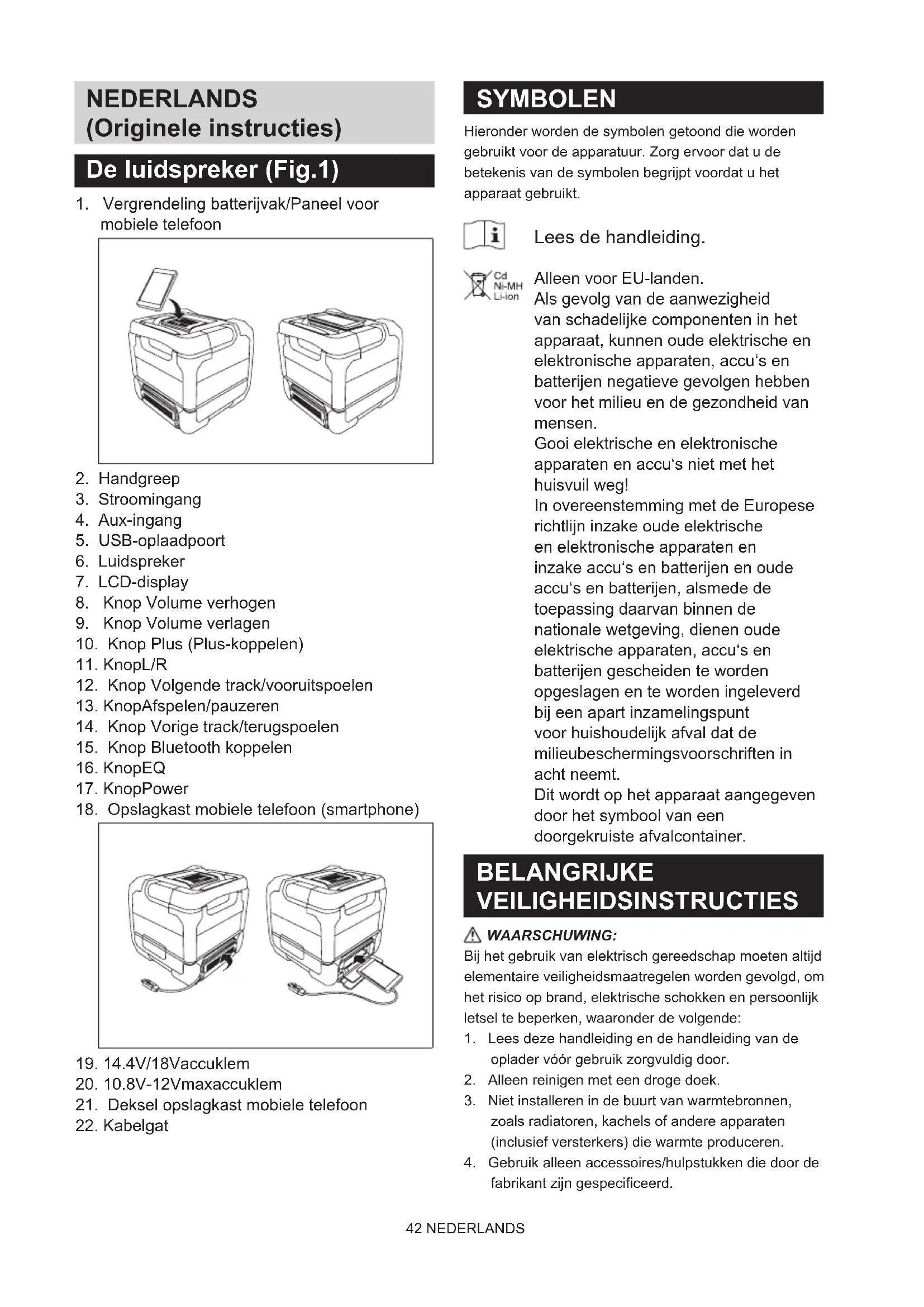 -woordmerk en -logo’s zijn gedeponeerde handelsmerken in eigendom van Bluetooth SIG, Inc.) Bluetooth-versie 5.0 gecerticeerd Bluetooth-proel A2DP/SCMS-T/AVRCP Zendvermogen Vermogensklasse 2 Zendbereik Optimaal: Max.10 meter (33 voet) Mogelijk: Max. 30 meter (100 voet) (varieert afhankelijk van gebruiksomstandigheden) Ondersteunde codec SBC Compatibel Bluetooth-proel A2DP/AVRCP Maximaal luidsprekerfrequentievermogen BT EDR: 3.08dBm BT LE: 3.88dBm Bedrijfsfrequentie 2402MHz~2480MHz USB-oplaadport Maximale voedingsstroom van USB-poort 5V, 2,1A Algemeen Netadapter DC in 12V 1.5A, middelste pin positief Accu Schuifaccu: 10.8V-12Vmax 14,4V 18V Afmetingen (B x H x D) 206mm × 199mm × 217mm Gewicht 2,7KG (zonder accu) Het bedrijf behoudt zich het recht voor om de specicaties te wijzigen zonder voorafgaande kennisgeving.52 ESPAÑOL ESPAÑOL (Instrucciones originales)