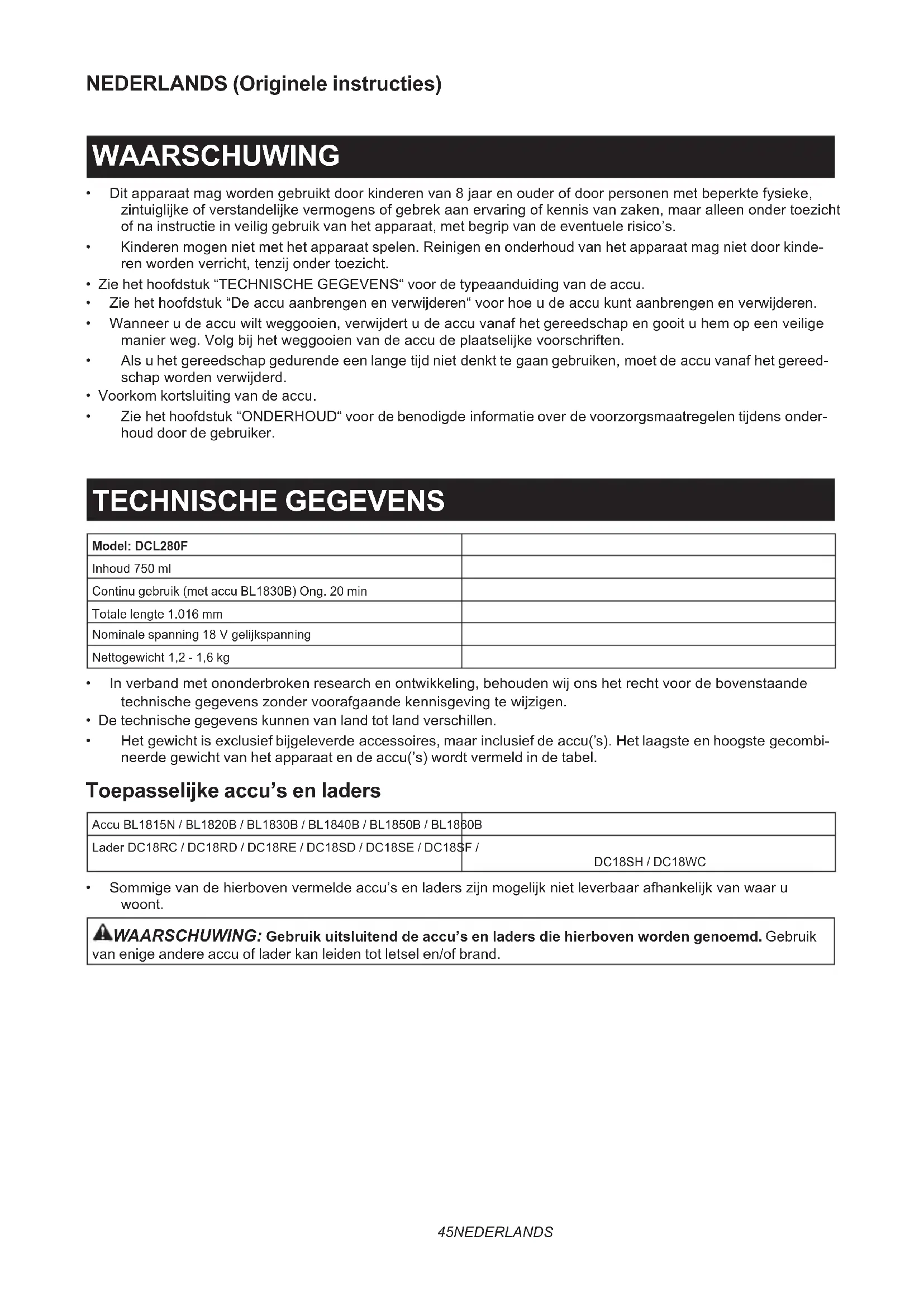 - Ziehethoofdstuk“ONDERHOUD“voordebenodigdeinformatieoverdevoorzorgsmaatregelentijdensonder- houd door de gebruiker. TECHNISCHE GEGEVENS Model: DCL280F Inhoud 750 ml Continu gebruik (met accu BL1830B) Ong. 20 min Totale lengte 1.016 mm Nominale spanning 18Vgelijkspanning Nettogewicht 1,2 - 1,6 kg