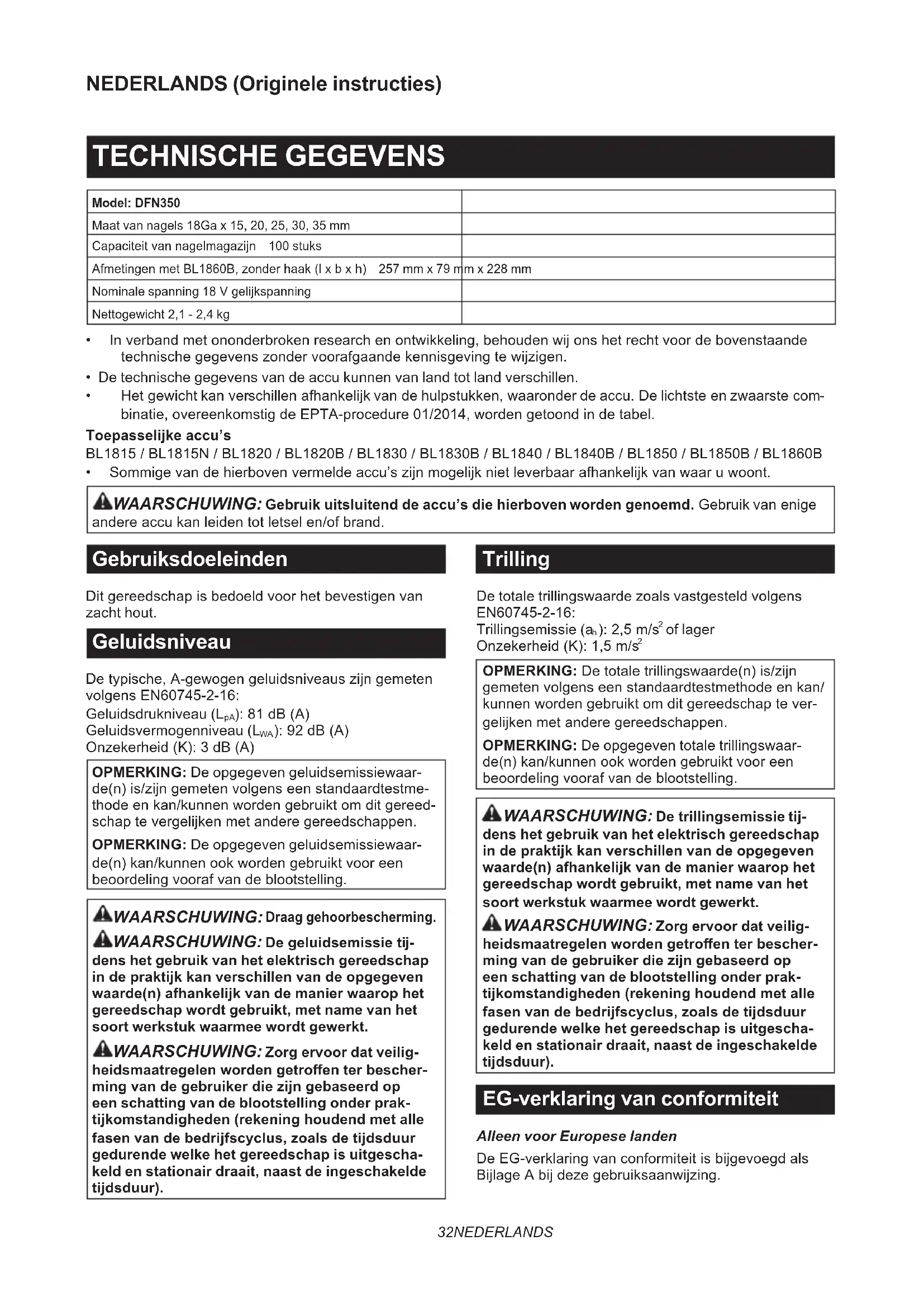 OPMERKING:Detotaletrillingswaarde(n)is/zijn gemetenvolgenseenstandaardtestmethodeenkan/ kunnenwordengebruiktomditgereedschaptever- gelijkenmetanderegereedschappen. OPMERKING: De opgegeven totale trillingswaar- de(n)kan/kunnenookwordengebruiktvooreen beoordelingvoorafvandeblootstelling. WAARSCHUWING: De trillingsemissie tij- dens het gebruik van het elektrisch gereedschap in de praktijk kan verschillen van de opgegeven waarde(n) afhankelijk van de manier waarop het gereedschap wordt gebruikt, met name van het soort werkstuk waarmee wordt gewerkt. WAARSCHUWING: Zorg ervoor dat veilig- heidsmaatregelen worden getroen ter bescher- ming van de gebruiker die zijn gebaseerd op een schatting van de blootstelling onder prak- tijkomstandigheden (rekening houdend met alle fasen van de bedrijfscyclus, zoals de tijdsduur gedurende welke het gereedschap is uitgescha- keld en stationair draait, naast de ingeschakelde tijdsduur). EG-verklaring van conformiteit Alleen voor Europese landen DeEG-verklaringvanconformiteitisbijgevoegdals BijlageAbijdezegebruiksaanwijzing.33 NEDERLANDS VEILIGHEIDSWAAR- SCHUWINGEN Algemene veiligheidswaarschuwingen voor elektrisch gereedschap WAARSCHUWING: Lees alle veiligheids- waarschuwingen, aanwijzingen, afbeeldingen en technische gegevens behorend bij dit elektrische gereedschap aandachtig door.Alsunietalleonder- staandeaanwijzingennaleeft,kandatresulterenin brand,elektrischeschokkenen/ofernstigletsel. Bewaar alle waarschuwingen en instructies om in de toekomst te kunnen raadplegen. De term "elektrisch gereedschap" in de veiligheidsvoor- schriften duidt op gereedschappen die op stroom van het lichtnet werken (met snoer) of gereedschappen met een accu (snoerloos). Veiligheidswaarschuwingen voor een accunagelpistool