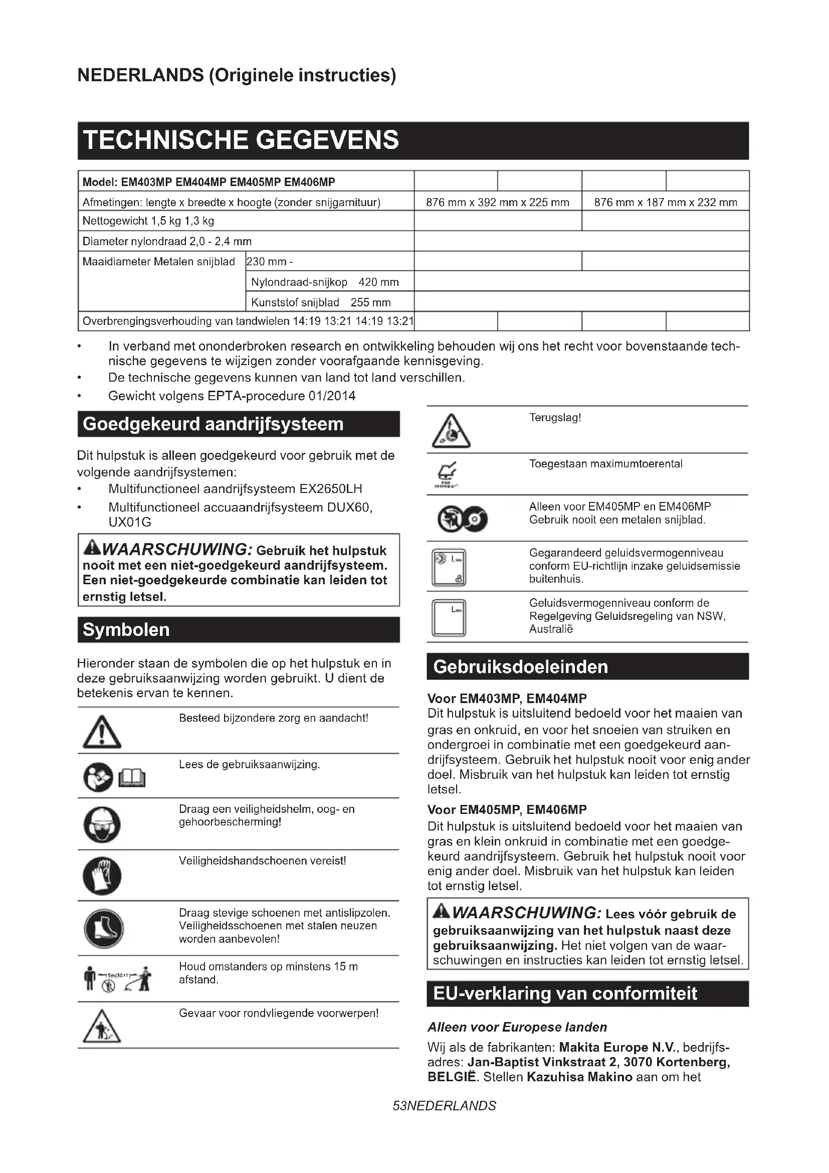 Houd omstanders op minstens 15 m afstand. Gevaar voor rondvliegende voorwerpen! Terugslag! Toegestaan maximumtoerental Alleen voor EM405MP en EM406MP Gebruiknooiteenmetalensnijblad. Gegarandeerd geluidsvermogenniveau conformEU-richtlijninzakegeluidsemissie buitenhuis. Geluidsvermogenniveau conform de Regelgeving Geluidsregeling van NSW, Australië Gebruiksdoeleinden Voor EM403MP, EM404MP Dit hulpstuk is uitsluitend bedoeld voor het maaien van gras en onkruid, en voor het snoeien van struiken en ondergroei in combinatie met een goedgekeurd aan- drijfsysteem.Gebruikhethulpstuknooitvoorenigander doel. Misbruik van het hulpstuk kan leiden tot ernstig letsel. Voor EM405MP, EM406MP Dit hulpstuk is uitsluitend bedoeld voor het maaien van gras en klein onkruid in combinatie met een goedge- keurdaandrijfsysteem.Gebruikhethulpstuknooitvoor enig ander doel. Misbruik van het hulpstuk kan leiden tot ernstig letsel. WAARSCHUWING: Lees vóór gebruik de gebruiksaanwijzing van het hulpstuk naast deze gebruiksaanwijzing. Het niet volgen van de waar- schuwingen en instructies kan leiden tot ernstig letsel. EU-verklaring van conformiteit Alleen voor Europese landen Wijalsdefabrikanten:Makita Europe N.V.,bedrijfs- adres: Jan-Baptist Vinkstraat 2, 3070 Kortenberg, BELGIË. Stellen Kazuhisa Makino aan om het54 NEDERLANDS technische bestand samen te stellen en verklaren onder eigenverantwoordelijkheiddathet/deproduct(en); Aanduiding: Bosmaaier en graskantmaaierhulpstuk / Graskantmaaierhulpstuk. Aanduiding van type(n): EM404MP / EM406MP. Voldoet aan de relevante voorwaarden van 2006/42/ EG en tevens voldoet aan de relevante voorwaarden vandevolgendeEG/EU-richtlijnen:2000/14/EC en zijngefabriceerdinovereenstemmingmetdevolgende geharmoniseerde normen: EN 60335-1:2012+A11:201 4+A13:2017+A1:2019+A14:2019+A2:2019+A15:2021 (EM406MP), EN 62841-1:2015+A11:2022 (EM404MP), EN 50636-2-91:2014 (EM406MP), EN ISO 11806- 1:2022 (EM404MP) . Plaats en datum van verklaring: Kortenberg, België.