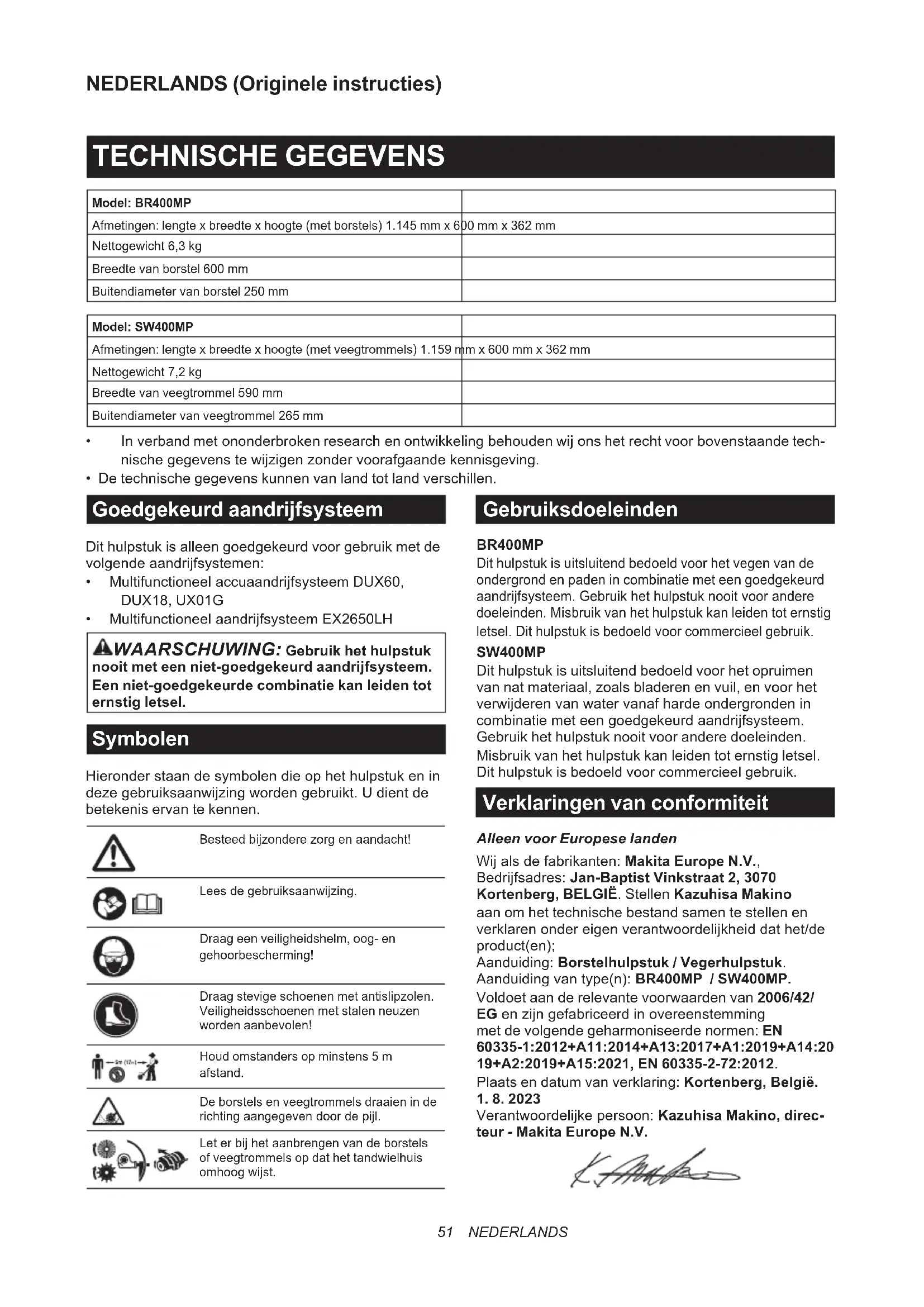 - MultifunctioneelaandrijfsysteemEX2650LH WAARSCHUWING: Gebruik het hulpstuk nooit met een niet-goedgekeurd aandrijfsysteem. Een niet-goedgekeurde combinatie kan leiden tot ernstig letsel. Symbolen Hieronderstaandesymbolendieophethulpstukenin dezegebruiksaanwijzingwordengebruikt.Udientde betekenis ervan te kennen. Besteedbijzonderezorgenaandacht! Leesdegebruiksaanwijzing. Draag een veiligheidshelm, oog- en gehoorbescherming! Draag stevige schoenen met antislipzolen. Veiligheidsschoenen met stalen neuzen worden aanbevolen! Houd omstanders op minstens 5 m afstand. De borstels en veegtrommels draaien in de richtingaangegevendoordepijl. Leterbijhetaanbrengenvandeborstels of veegtrommels op dat het tandwielhuis omhoogwijst. Gebruiksdoeleinden BR400MP Dit hulpstuk is uitsluitend bedoeld voor het vegen van de ondergrond en paden in combinatie met een goedgekeurd aandrijfsysteem.Gebruikhethulpstuknooitvoorandere doeleinden. Misbruik van het hulpstuk kan leiden tot ernstig letsel. Dit hulpstuk is bedoeld voor commercieel gebruik. SW400MP Dit hulpstuk is uitsluitend bedoeld voor het opruimen van nat materiaal, zoals bladeren en vuil, en voor het verwijderenvanwatervanafhardeondergrondenin combinatiemeteengoedgekeurdaandrijfsysteem. Gebruik het hulpstuk nooit voor andere doeleinden. Misbruik van het hulpstuk kan leiden tot ernstig letsel. Dit hulpstuk is bedoeld voor commercieel gebruik. Verklaringen van conformiteit Alleen voor Europese landen Wijalsdefabrikanten:Makita Europe N.V., Bedrijfsadres:Jan-Baptist Vinkstraat 2, 3070 Kortenberg, BELGIË. Stellen Kazuhisa Makino aan om het technische bestand samen te stellen en verklarenondereigenverantwoordelijkheiddathet/de product(en); Aanduiding: Borstelhulpstuk / Vegerhulpstuk. Aanduidingvantype(n):BR400MP / SW400MP. Voldoet aan de relevante voorwaarden van 2006/42/ EGenzijngefabriceerdinovereenstemming met de volgende geharmoniseerde normen: EN 60335-1:2012+A11:2014+A13:2017+A1:2019+A14:20 19+A2:2019+A15:2021, EN 60335-2-72:2012. Plaats en datum van verklaring: Kortenberg, België.