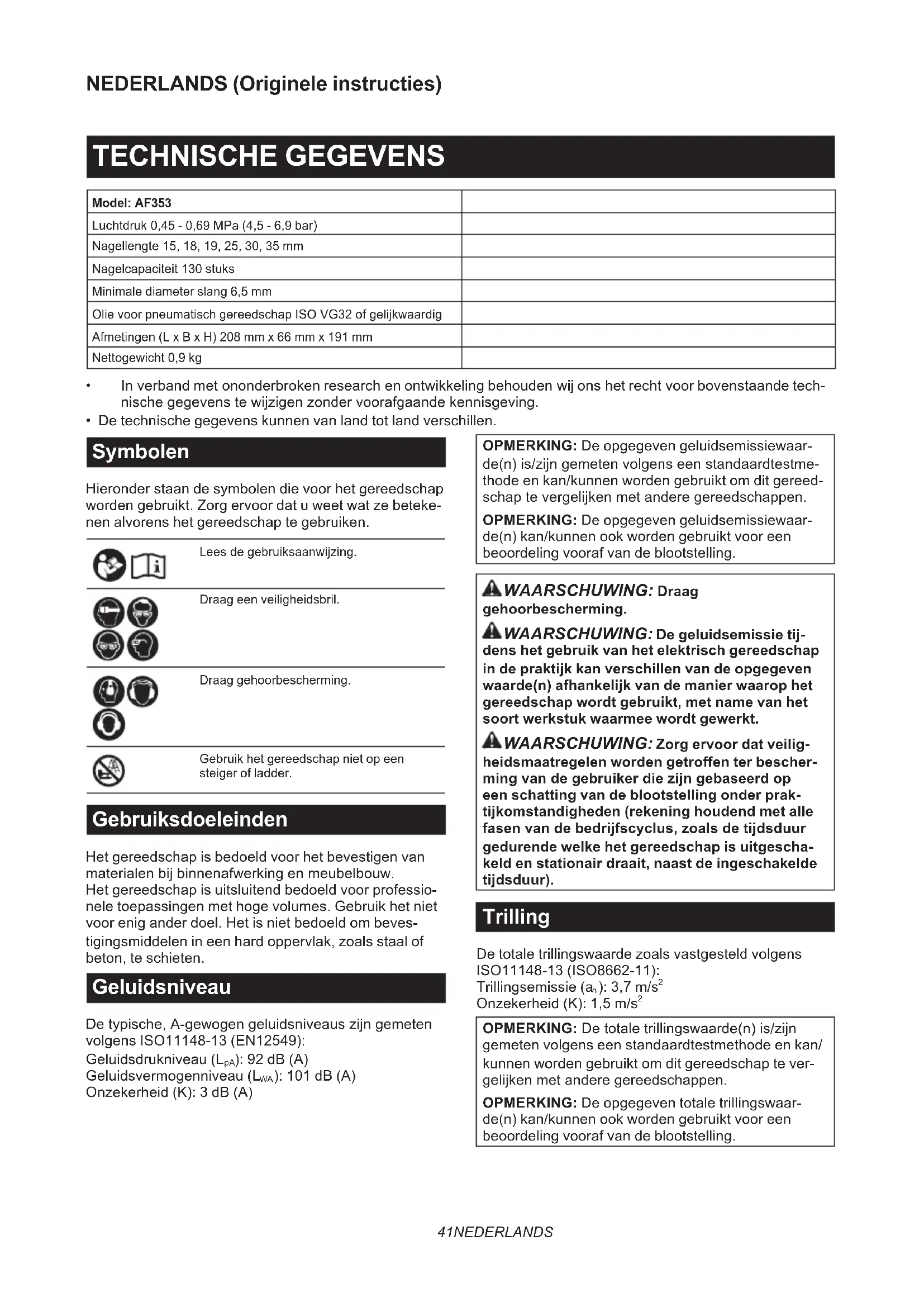 - De technische gegevens kunnen van land tot land verschillen. Symbolen Hieronder staan de symbolen die voor het gereedschap worden gebruikt. Zorg ervoor dat u weet wat ze beteke- nen alvorens het gereedschap te gebruiken. Lees de gebruiksaanwijzing. Draag een veiligheidsbril. Draag gehoorbescherming. Gebruik het gereedschap niet op een steiger of ladder. Gebruiksdoeleinden Het gereedschap is bedoeld voor het bevestigen van materialen bij binnenafwerking en meubelbouw. Het gereedschap is uitsluitend bedoeld voor professio- nele toepassingen met hoge volumes. Gebruik het niet voor enig ander doel. Het is niet bedoeld om beves- tigingsmiddelen in een hard oppervlak, zoals staal of beton, te schieten. Geluidsniveau De typische, A-gewogen geluidsniveaus zijn gemeten volgens ISO11148-13 (EN12549): Geluidsdrukniveau (L