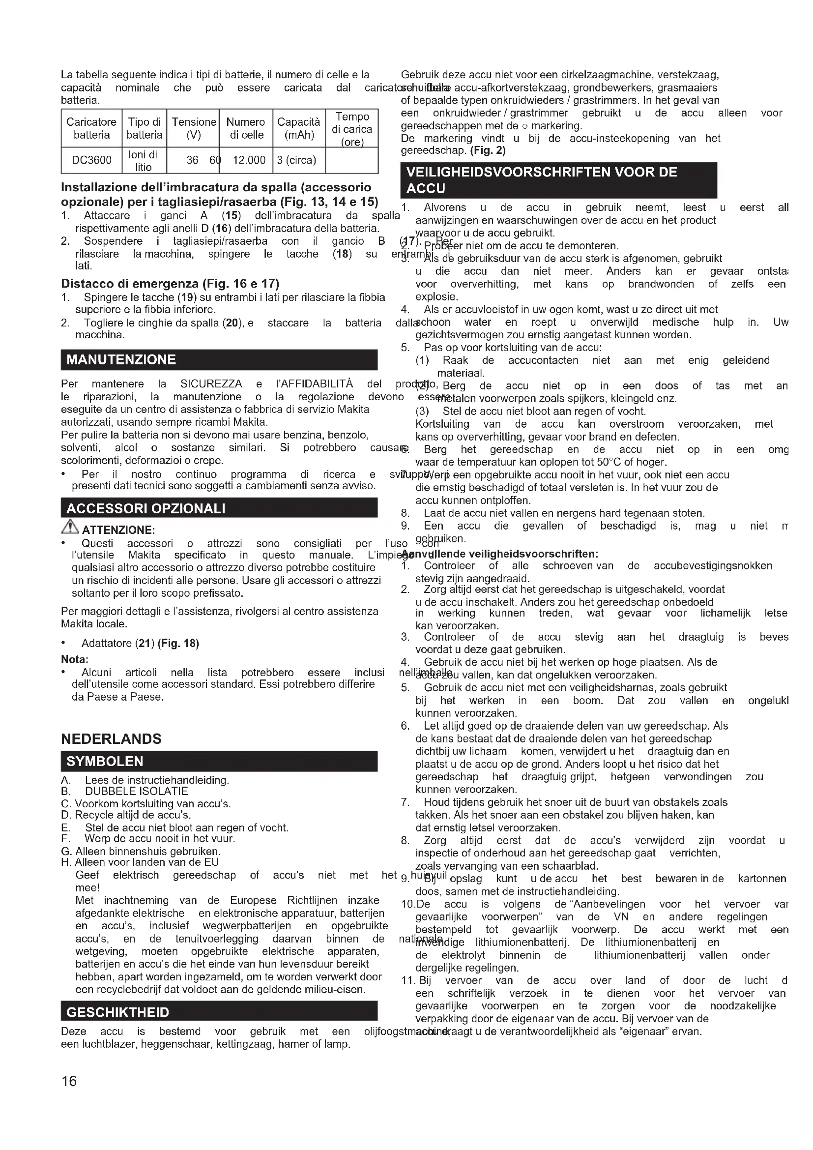 - Alcuni articoli nella lista potrebbero essere inclusi nell’imballo dell’utensilecomeaccessoristandard.Essipotrebberodifferire daPaeseaPaese. NEDERLANDS SYMBOLEN A. Leesdeinstructiehandleiding. B. DUBBELEISOLATIE C.Voorkomkortsluitingvanaccu’s. D.Recyclealtijddeaccu’s. E. Steldeaccunietblootaanregenofvocht. F. Werpdeaccunooitinhetvuur. G.Alleenbinnenshuisgebruiken. H.AlleenvoorlandenvandeEU Geef elektrisch gereedschap of accu’s niet met het huisvuil mee! Met inachtneming van de Europese Richtlijnen inzake afgedankteelektrische enelektronischeapparatuur,batterijen en accu’s, inclusief wegwerpbatterijen en opgebruikte accu’s, en de tenuitvoerlegging daarvan binnen de nationale wetgeving, moeten opgebruikte elektrische apparaten, batterijenenaccu’sdieheteindevanhunlevensduurbereikt hebben,apartwordeningezameld,omtewordenverwerktdoor eenrecyclebedrijfdatvoldoetaandegeldendemilieu-eisen. GESCHIKTHEID Deze accu is bestemd voor gebruik met een olijfoogstmachine, eenluchtblazer,heggenschaar,kettingzaag,hameroflamp. Gebruikdezeaccunietvooreencirkelzaagmachine,verstekzaag, schuifbareaccu-afkortverstekzaag,grondbewerkers,grasmaaiers ofbepaaldetypenonkruidwieders/grastrimmers.Inhetgevalvan een onkruidwieder/grastrimmer gebruikt u de accu alleen voor gereedschappenmetde○markering. De markering vindt u bij de accu-insteekopening van het gereedschap.(Fig. 2)