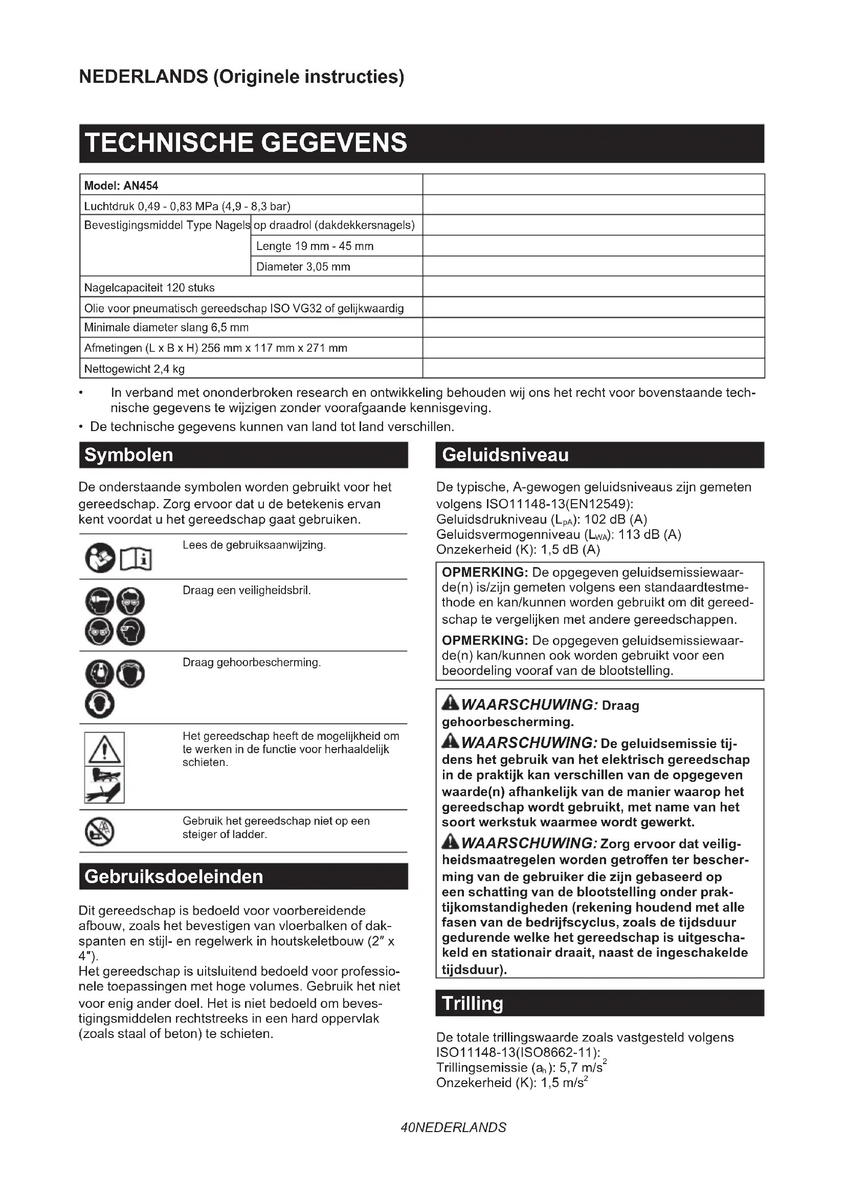 - De technische gegevens kunnen van land tot land verschillen. Symbolen De onderstaande symbolen worden gebruikt voor het gereedschap. Zorg ervoor dat u de betekenis ervan kent voordat u het gereedschap gaat gebruiken. Lees de gebruiksaanwijzing. Draag een veiligheidsbril. Draag gehoorbescherming. Het gereedschap heeft de mogelijkheid om te werken in de functie voor herhaaldelijk schieten. Gebruik het gereedschap niet op een steiger of ladder. Gebruiksdoeleinden Dit gereedschap is bedoeld voor voorbereidende afbouw, zoals het bevestigen van vloerbalken of dak- spanten en stijl- en regelwerk in houtskeletbouw (2″ x 4″). Het gereedschap is uitsluitend bedoeld voor professio- nele toepassingen met hoge volumes. Gebruik het niet voor enig ander doel. Het is niet bedoeld om beves- tigingsmiddelen rechtstreeks in een hard oppervlak (zoals staal of beton) te schieten. Geluidsniveau De typische, A-gewogen geluidsniveaus zijn gemeten volgens ISO11148-13(EN12549): Geluidsdrukniveau (L