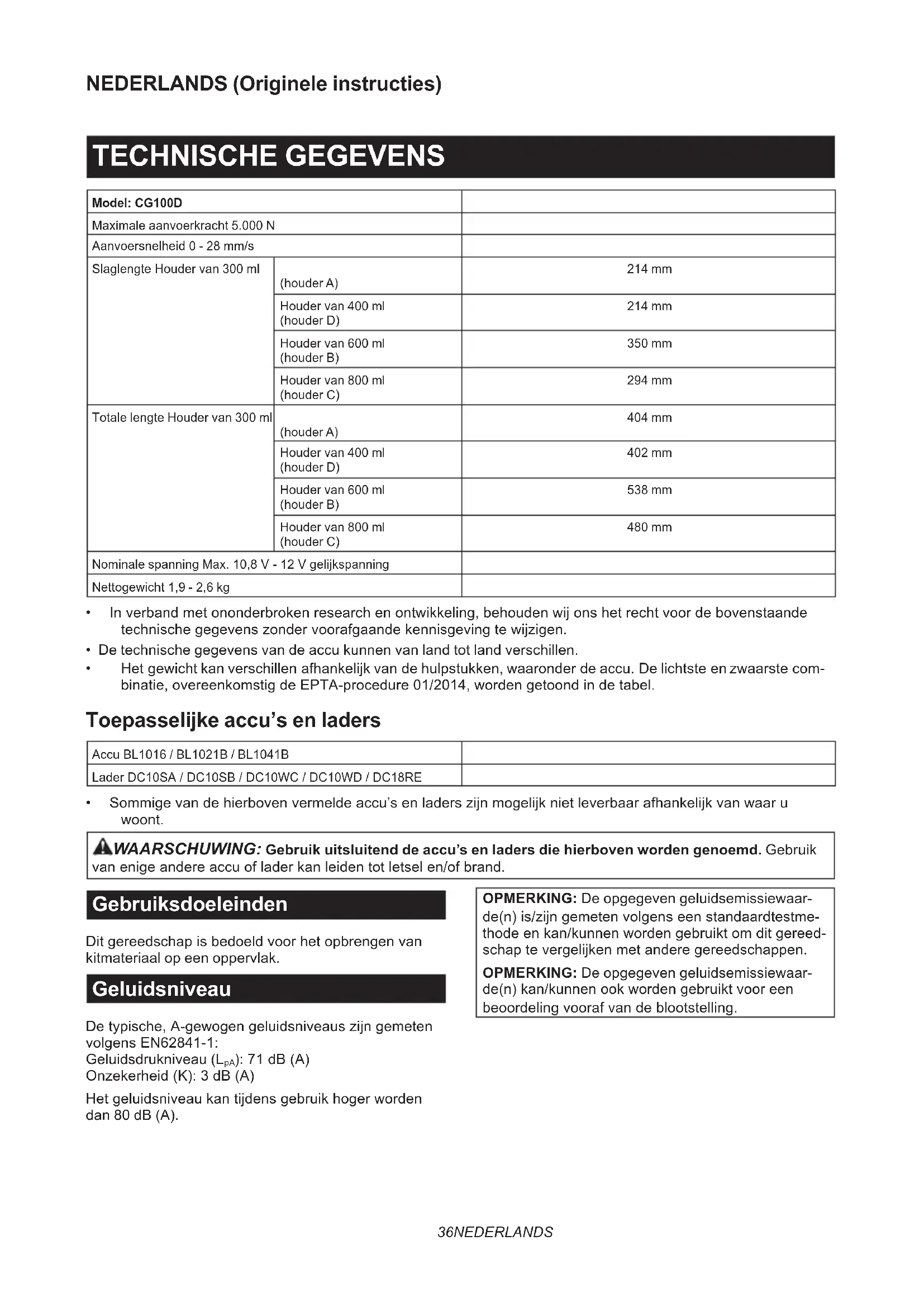 - BatteriaecaricabatterieoriginaliMakita NOTA:Alcuniarticolinell’elencopotrebberoessere inclusinell’imballaggiodell’utensilecomeaccessori standard.Taliarticolipotrebberovariaredanazione a nazione.36 NEDERLANDS NEDERLANDS (Originele instructies) TECHNISCHE GEGEVENS Model: CG100D Maximale aanvoerkracht 5.000 N Aanvoersnelheid 0 - 28 mm/s Slaglengte Houder van 300 ml (houder A) 214 mm Houder van 400 ml (houder D) 214 mm Houder van 600 ml (houder B) 350 mm Houder van 800 ml (houder C) 294 mm Totale lengte Houder van 300 ml (houder A) 404 mm Houder van 400 ml (houder D) 402 mm Houder van 600 ml (houder B) 538 mm Houder van 800 ml (houder C) 480 mm Nominale spanning Max.10,8V-12Vgelijkspanning Nettogewicht 1,9 - 2,6 kg