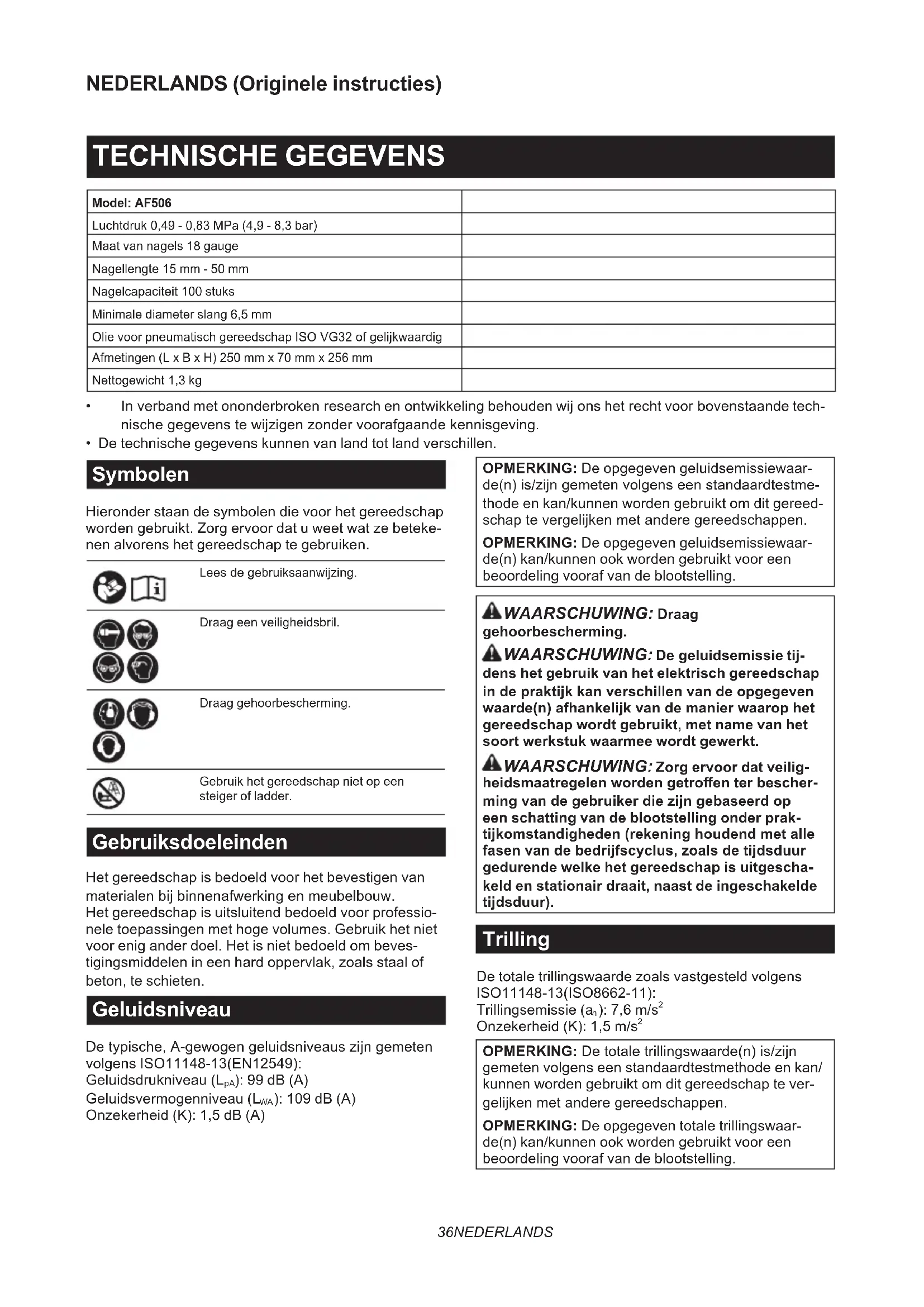 OPMERKING:Detotaletrillingswaarde(n)is/zijn gemeten volgens een standaardtestmethode en kan/ kunnen worden gebruikt om dit gereedschap te ver- gelijkenmetanderegereedschappen. OPMERKING: De opgegeven totale trillingswaar- de(n) kan/kunnen ook worden gebruikt voor een beoordeling vooraf van de blootstelling.37 NEDERLANDS WAARSCHUWING: De trillingsemissie tij- dens het gebruik van het elektrisch gereedschap in de praktijk kan verschillen van de opgegeven waarde(n) afhankelijk van de manier waarop het gereedschap wordt gebruikt, met name van het soort werkstuk waarmee wordt gewerkt. WAARSCHUWING: Zorg ervoor dat veilig- heidsmaatregelen worden getroen ter bescher- ming van de gebruiker die zijn gebaseerd op een schatting van de blootstelling onder prak- tijkomstandigheden (rekening houdend met alle fasen van de bedrijfscyclus, zoals de tijdsduur gedurende welke het gereedschap is uitgescha- keld en stationair draait, naast de ingeschakelde tijdsduur). EG-verklaring van conformiteit Alleen voor Europese landen DeEG-verklaringvanconformiteitisbijgevoegdals BijlageAbijdezegebruiksaanwijzing. VEILIGHEIDSWAARSCHUWINGEN Waarschuwingen voor pneumatisch nagelpistool/nietpistool WAARSCHUWING: Lees alle veiligheids- waarschuwingen en alle instructies. Het niet vol- gen van de waarschuwingen en instructies kan leiden tot elektrische schokken, brand en/of ernstig letsel. Bewaar alle waarschuwingen en instructies om in de toekomst te kunnen raadplegen. Omwillevanuwpersoonlijkeveiligheidendejuistewerkingen onderhoud van het gereedschap, leest u deze gebruiksaan- wijzingalvorenshetgereedschaptegebruiken. Algemene veiligheidswaarschuwingen