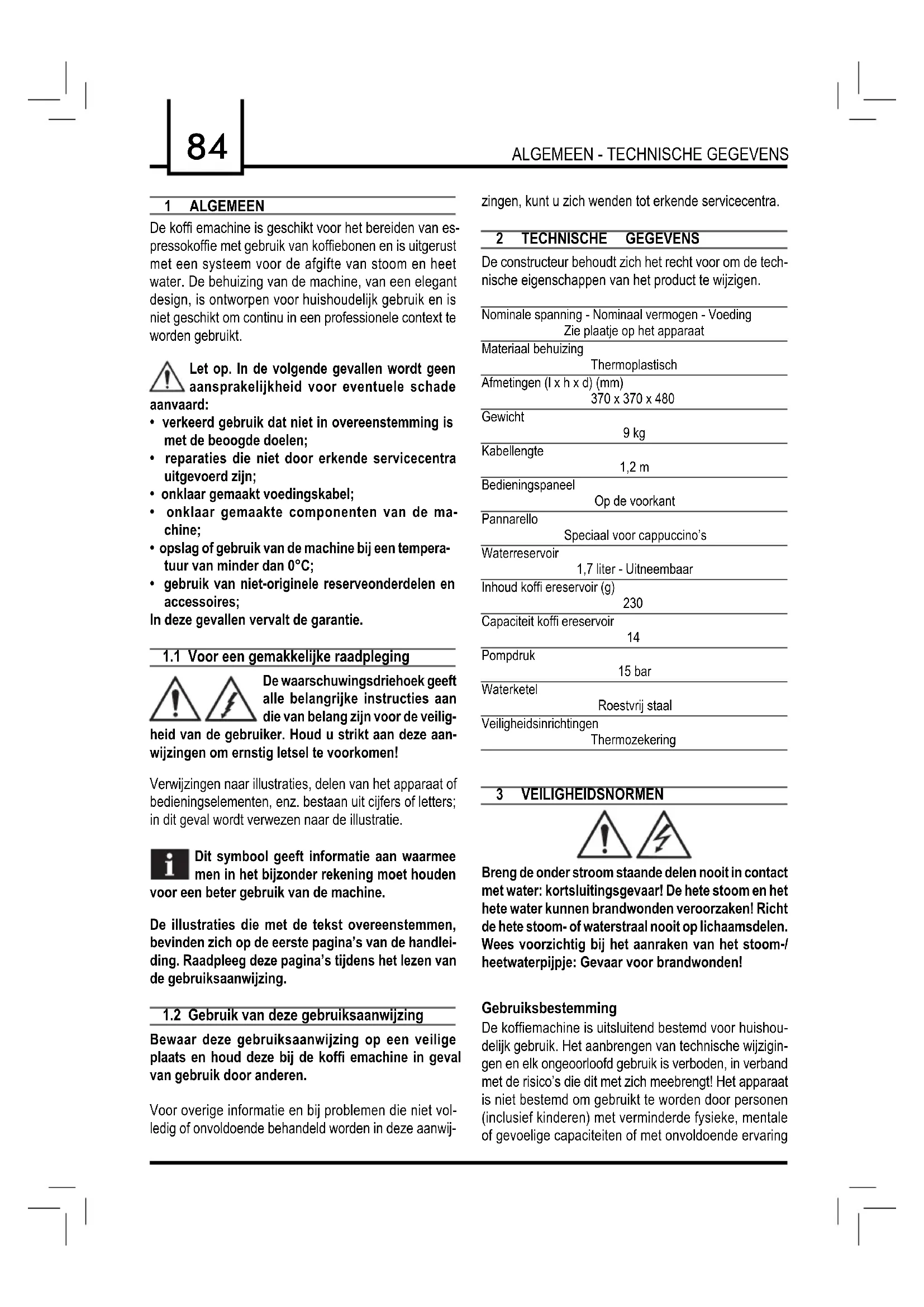 Pompdruk 15 bar Waterketel Roestvrij staal Veiligheidsinrichtingen Thermozekering 3 VEILIGHEIDSNORMEN Breng de onder stroom staande delen nooit in contact met water: kortsluitingsgevaar! De hete stoom en het hete water kunnen brandwonden veroorzaken! Richt de hete stoom- of waterstraal nooit op lichaamsdelen. Wees voorzichtig bij het aanraken van het stoom-/ heetwaterpijpje: Gevaar voor brandwonden! Gebruiksbestemming De koffi emachine is uitsluitend bestemd voor huishou- delijk gebruik. Het aanbrengen van technische wijzigin- gen en elk ongeoorloofd gebruik is verboden, in verband met de risico’s die dit met zich meebrengt! Het apparaat is niet bestemd om gebruikt te worden door personen (inclusief kinderen) met verminderde fysieke, mentale of gevoelige capaciteiten of met onvoldoende ervaring85 Nederlands VEILIGHEIDSNORMEN en/of bekwaamheid, tenzij ze onder het toezicht staan van een persoon die verantwoordelijk is voor hun veilig- heid en van wie ze instructies verkrijgen aangaande het gebruik van het apparaat. Stroomtoevoer Sluit de koffi emachine uitsluitend aan op een geschikt stopcontact. De spanning moet overeenstemmen met de spanning die op het plaatje van het apparaat staat vermeld. Voedingskabel Gebruik de koffi emachine nooit als de voedingskabel defect is. Indien de voedingskabel beschadigd is, moet deze door de fabrikant of door zijn klantenservice ver- vangen worden. Laat de voedingskabel niet over hoe- ken en scherpe randen of hete voorwerpen lopen, en bescherm het tegen olie. Draag de koffi emachine niet aan de kabel en trek er niet aan. Haal de stekker niet uit het stopcontact door aan de ka- bel te trekken en raak het niet met natte handen aan. Voorkom dat de voedingskabel los van tafels of planken afhangt. Bescherming van andere personen Houd kinderen onder toezicht om te vermijden dat ze met het apparaat spelen. Kinderen realiseren zich de gevaren die aan elektrische apparaten verbonden zijn niet. Laat het verpakkingsma- teriaal van de machine niet binnen bereik van kinderen. Verbrandingsgevaar! Richt de hete stoom- en/of waterstraal nooit op uzelf of op anderen: gevaar voor brandwonden! Gebruik altijd de handgrepen of knoppen. Plaatsing Zet de koffi emachine op een veilige plek waar niemand het kan omstoten of zich eraan kan verwonden. Er kan heet water of oververhitte stoom uitkomen: ge- vaar voor brandwonden! Bewaar de machine niet bij een temperatuur van minder dan 0°C; het apparaat kan door bevriezing worden be- schadigd. Gebruik de koffi emachine niet buiten. Zet de machine niet op erg warme oppervlakken en in de buurt van open vuur om te voorkomen dat de behui- zing smelt of anderszins beschadigd raakt. Reiniging Alvorens het apparaat te reinigen, moet het apparaat worden uitgeschakeld met de ON/OFF toets en vervol- gens moet de stekker uit het stopcontact worden ge- haald. Wacht dan tot de machine is afgekoeld. Dompel het apparaat nooit onder in water! Pogingen tot reparaties aan de binnenkant van de ma- chine zijn ten strengste verboden. Gebruik het water dat enkele dagen in het waterreser- voir heeft gestaan niet voor voedingsdoeleinden, was en vul het reservoir met vers drinkwater. Ruimte voor gebruik en onderhoud Voor een correcte en goede werking van de koffi ema- chine wordt het volgende aanbevolen: