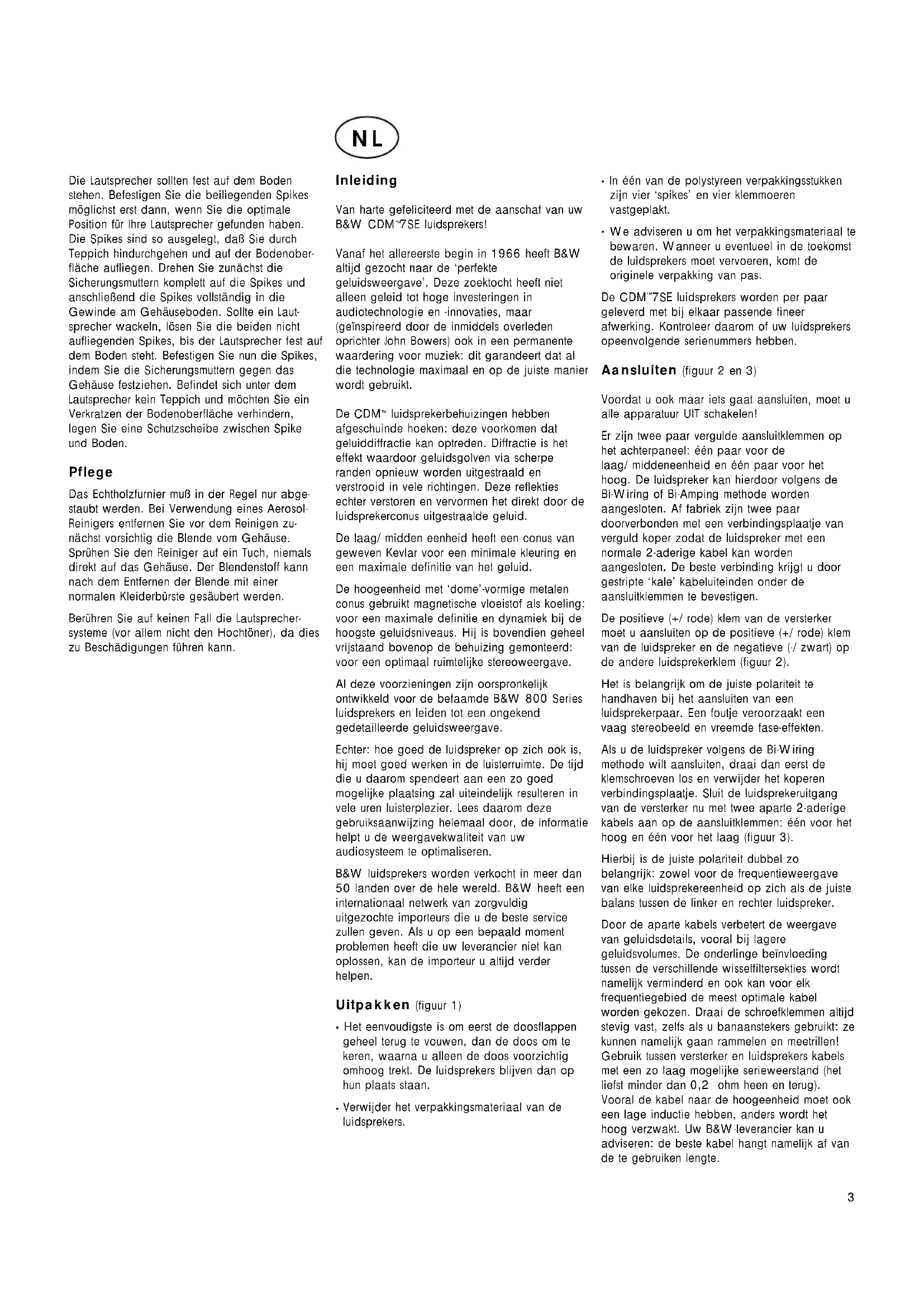 luidsprekerbehuizingen hebben afgeschuinde hoeken: deze voorkomen dat geluiddiffractie kan optreden. Diffractie is het effekt waardoor geluidsgolven via scherpe randen opnieuw worden uitgestraald en verstrooid in vele richtingen. Deze reflekties echter verstoren en vervormen het direkt door de luidsprekerconus uitgestraalde geluid. De laag/midden eenheid heeft een conus van geweven Kevlar voor een minimale kleuring en een maximale definitie van het geluid. De hoogeenheid met ‘dome’-vormige metalen conus gebruikt magnetische vloeistof als koeling: voor een maximale definitie en dynamiek bij de hoogste geluidsniveaus. Hij is bovendien geheel vrijstaand bovenop de behuizing gemonteerd: voor een optimaal ruimtelijke stereoweergave. Al deze voorzieningen zijn oorspronkelijk ontwikkeld voor de befaamde B&W 800 Series luidsprekers en leiden tot een ongekend gedetailleerde geluidsweergave. Echter: hoe goed de luidspreker op zich ook is, hij moet goed werken in de luisterruimte. De tijd die u daarom spendeert aan een zo goed mogelijke plaatsing zal uiteindelijk resulteren in vele uren luisterplezier. Lees daarom deze gebruiksaanwijzing helemaal door, de informatie helpt u de weergavekwaliteit van uw audiosysteem te optimaliseren. B&W luidsprekers worden verkocht in meer dan 50 landen over de hele wereld. B&W heeft een internationaal netwerk van zorgvuldig uitgezochte importeurs die u de beste service zullen geven. Als u op een bepaald moment problemen heeft die uw leverancier niet kan oplossen, kan de importeur u altijd verder helpen. Uitpakken (figuur 1)