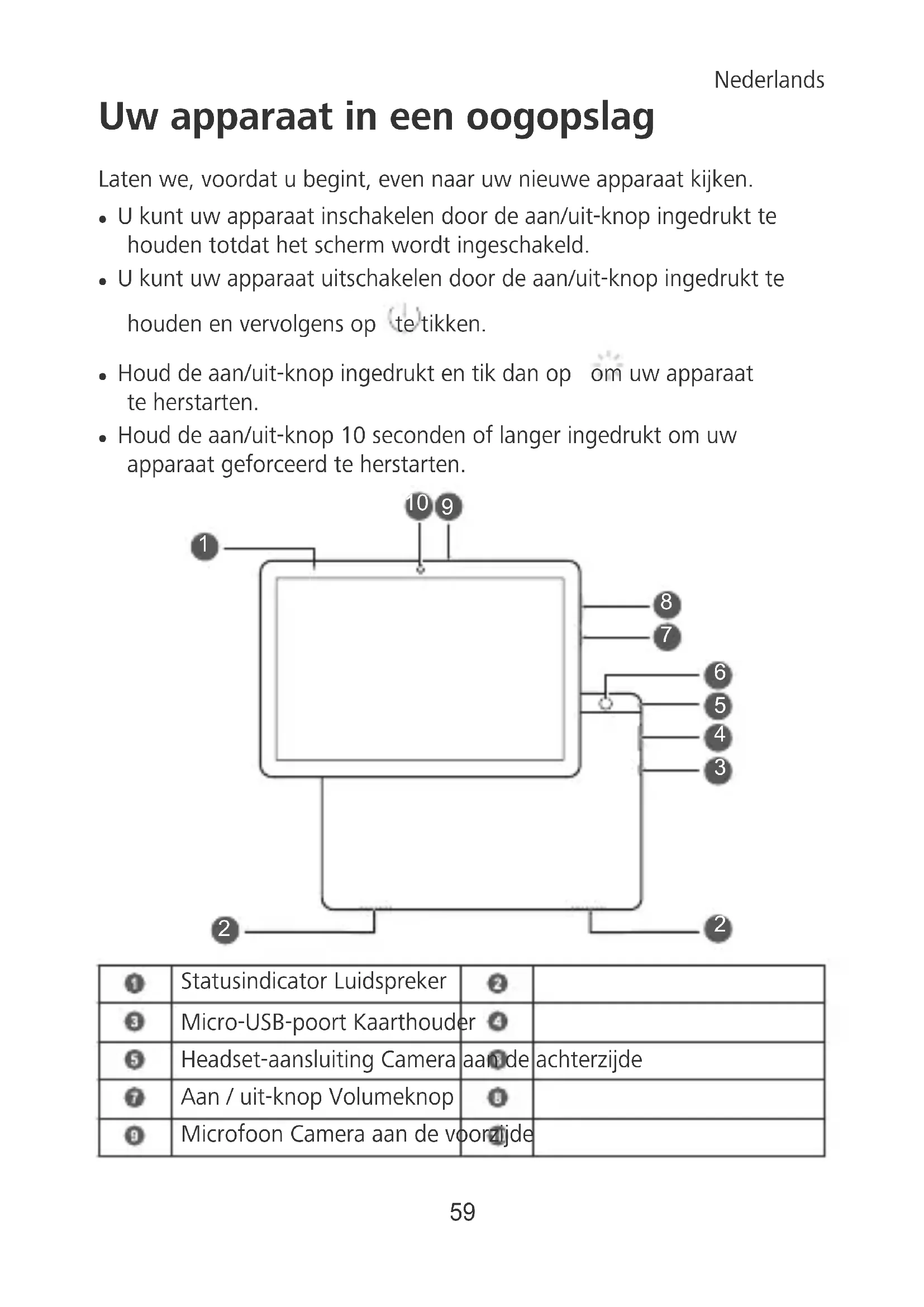 INFORMATIVOS E NÃO CONSTITUI QUALQUER TIPO DE GARANTIA. 58Uw apparaat in een oogopslag Laten we, voordat u begint, even naar uw nieuwe apparaat kijken. l U kunt uw apparaat inschakelen door de aan/uit-knop ingedrukt te houden totdat het scherm wordt ingeschakeld. l U kunt uw apparaat uitschakelen door de aan/uit-knop ingedrukt te houden en vervolgens op te tikken. l Houd de aan/uit-knop ingedrukt en tik dan op om uw apparaat te herstarten. l Houd de aan/uit-knop 10 seconden of langer ingedrukt om uw apparaat geforceerd te herstarten.