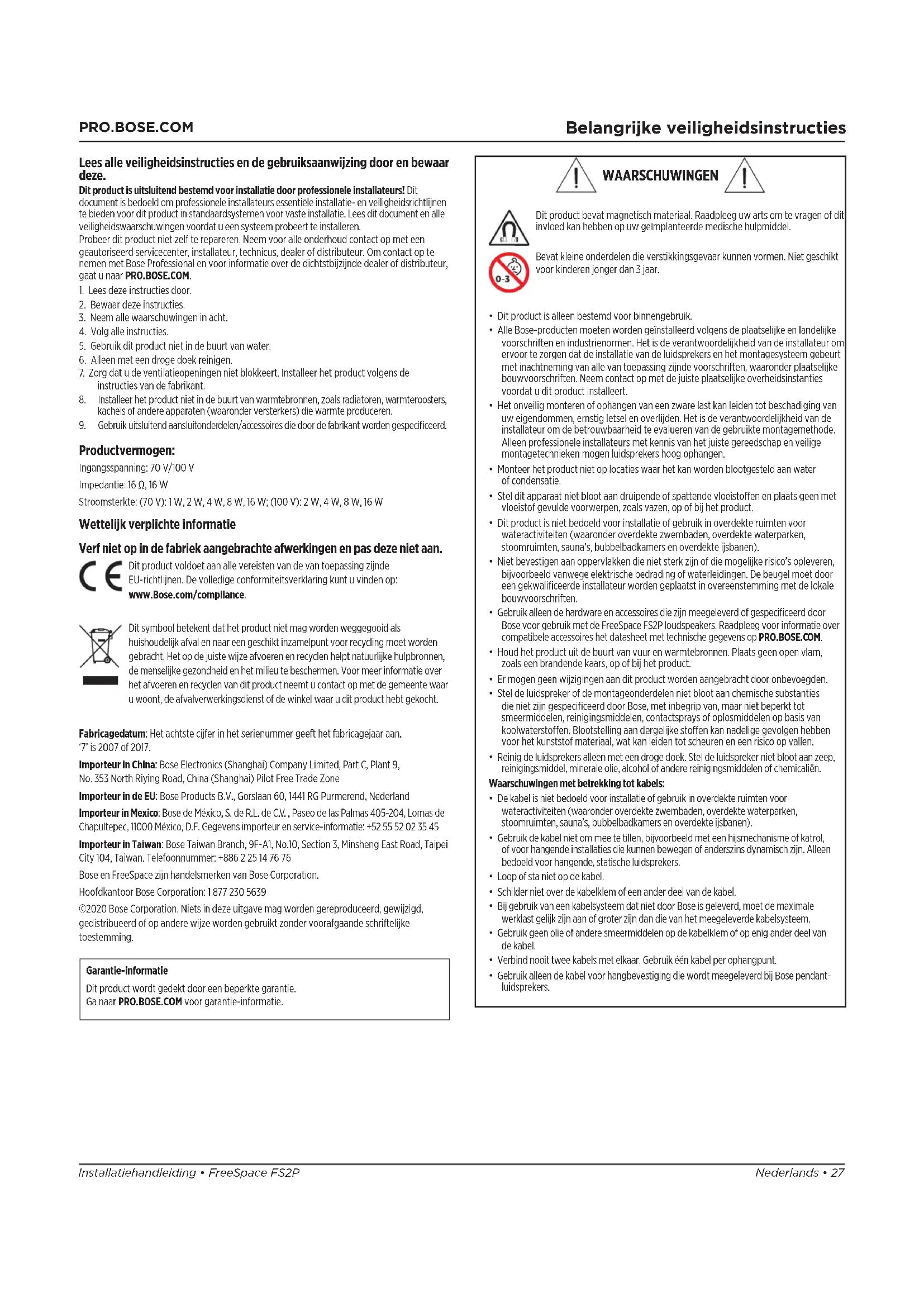 Productvermogen: Ingangsspanning: 70 V/100 V Impedantie: 16 Ω, 16 W Stroomsterkte: (70 V): 1 W, 2 W, 4 W, 8 W, 16 W; (100 V): 2 W, 4 W, 8 W, 16 W Wettelijk verplichte informatie Verf niet op in de fabriek aangebrachte afwerkingen en pas deze niet aan. Dit product voldoet aan alle vereisten van de van toepassing zijnde EU-richtlijnen. De volledige conformiteitsverklaring kunt u vinden op: www.Bose.com/compliance. Dit symbool betekent dat het product niet mag worden weggegooid als huishoudelijk afval en naar een geschikt inzamelpunt voor recycling moet worden gebracht. Het op de juiste wijze afvoeren en recyclen helpt natuurlijke hulpbronnen, de menselijke gezondheid en het milieu te beschermen. Voor meer informatie over het afvoeren en recyclen van dit product neemt u contact op met de gemeente waar u woont, de afvalverwerkingsdienst of de winkel waar u dit product hebt gekocht. Fabricagedatum: Het achtste cijfer in het serienummer geeft het fabricagejaar aan. ‘7’ is 2007 of 2017. Importeur in China: Bose Electronics (Shanghai) Company Limited, Part C, Plant 9, No. 353 North Riying Road, China (Shanghai) Pilot Free Trade Zone Importeur in de EU: Bose Products B.V., Gorslaan 60, 1441 RG Purmerend, Nederland Importeur in Mexico: Bose de México, S. de R.L. de C.V. , Paseo de las Palmas 405-204, Lomas de Chapultepec, 11000 México, D.F. Gegevens importeur en service-informatie: +52 55 52 02 35 45 Importeur in Taiwan: Bose Taiwan Branch, 9F-A1, No.10, Section 3, Minsheng East Road, Taipei City 104, Taiwan. Telefoonnummer: +886 2 25 14 76 76 Bose en FreeSpace zijn handelsmerken van Bose Corporation. Hoofdkantoor Bose Corporation: 1 877 230 5639 ©2020 Bose Corporation. Niets in deze uitgave mag worden gereproduceerd, gewijzigd, gedistribueerd of op andere wijze worden gebruikt zonder voorafgaande schriftelijke toestemming. Garantie-informatie Dit product wordt gedekt door een beperkte garantie. Ga naar PRO.BOSE.COM voor garantie-informatie. WAARSCHUWINGEN Dit product bevat magnetisch materiaal. Raadpleeg uw arts om te vragen ofdit invloed kan hebben op uw geïmplanteerde medische hulpmiddel. Bevat kleine onderdelen die verstikkingsgevaar kunnen vormen. Niet geschikt voor kinderen jonger dan 3 jaar.