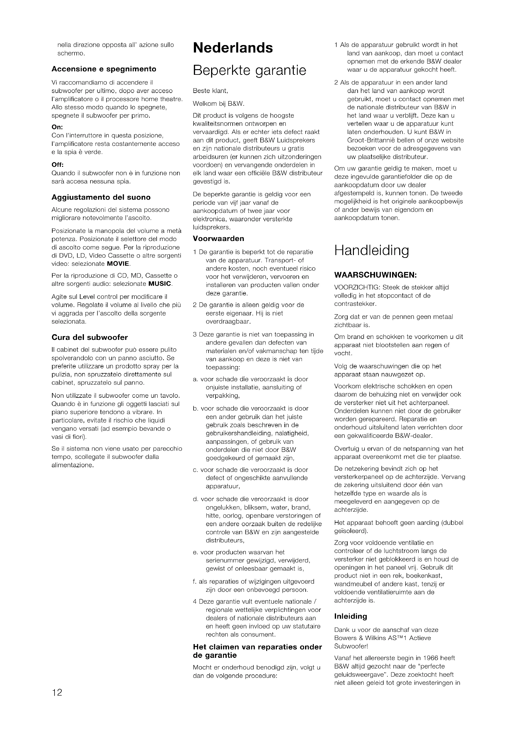 - Il canale destro e quello sinistro non siano invertiti – questo può produrre come risultato, per esempio, che l’orchestra si trovi nella posizione opposta o, ancor peggio, che i suoni nel vostro sistema home theater vadano 11nella direzione opposta all’ azione sullo schermo. Accensione e spegnimento Vi raccomandiamo di accendere il subwoofer per ultimo, dopo aver acceso l’amplificatore o il processore home theatre. Allo stesso modo quando lo spegnete, spegnete il subwoofer per primo. On: Con l’interruttore in questa posizione, l’amplificatore resta costantemente acceso e la spia è verde. Off: Quando il subwoofer non è in funzione non sarà accesa nessuna spia. Aggiustamento del suono Alcune regolazioni del sistema possono migliorare notevolmente l’ascolto. Posizionate la manopola del volume a metà potenza. Posizionate il selettore del modo di ascolto come segue. Per la riproduzione di DVD, LD, Video Cassette o altre sorgenti video: selezionate MOVIE. Per la riproduzione di CD, MD, Cassette o altre sorgenti audio: selezionate MUSIC. Agite sul Level control per modificare il volume. Regolate il volume al livello che più vi aggrada per l’ascolto della sorgente selezionata. Cura del subwoofer Il cabinet del subwoofer può essere pulito spolverandolo con un panno asciutto. Se preferite utilizzare un prodotto spray per la pulizia, non spruzzatelo direttamente sul cabinet, spruzzatelo sul panno. Non utilizzate il subwoofer come un tavolo. Quando è in funzione gli oggetti lasciati sul piano superiore tendono a vibrare. In particolare, evitate il rischio che liquidi vengano versati (ad esempio bevande o vasi di fiori). Se il sistema non viene usato per parecchio tempo, scollegate il subwoofer dalla alimentazione. Nederlands Beperkte garantie Beste klant, Welkom bij B&W. Dit product is volgens de hoogste kwaliteitsnormen ontworpen en vervaardigd. Als er echter iets defect raakt aan dit product, geeft B&W Luidsprekers en zijn nationale distributeurs u gratis arbeidsuren (er kunnen zich uitzonderingen voordoen) en vervangende onderdelen in elk land waar een officiële B&W distributeur gevestigd is. De beperkte garantie is geldig voor een periode van vijf jaar vanaf de aankoopdatum of twee jaar voor elektronica, waaronder versterkte luidsprekers. Voorwaarden 1 De garantie is beperkt tot de reparatie van de apparatuur. Transport- of andere kosten, noch eventueel risico voor het verwijderen, vervoeren en installeren van producten vallen onder deze garantie. 2 De garantie is alleen geldig voor de eerste eigenaar. Hij is niet overdraagbaar. 3 Deze garantie is niet van toepassing in andere gevallen dan defecten van materialen en/of vakmanschap ten tijde van aankoop en deze is niet van toepassing: a. voor schade die veroorzaakt is door onjuiste installatie, aansluiting of verpakking, b. voor schade die veroorzaakt is door een ander gebruik dan het juiste gebruik zoals beschreven in de gebruikershandleiding, nalatigheid, aanpassingen, of gebruik van onderdelen die niet door B&W goedgekeurd of gemaakt zijn, c. voor schade die veroorzaakt is door defect of ongeschikte aanvullende apparatuur, d. voor schade die veroorzaakt is door ongelukken, bliksem, water, brand, hitte, oorlog, openbare verstoringen of een andere oorzaak buiten de redelijke controle van B&W en zijn aangestelde distributeurs, e. voor producten waarvan het serienummer gewijzigd, verwijderd, gewist of onleesbaar gemaakt is, f. als reparaties of wijzigingen uitgevoerd zijn door een onbevoegd persoon. 4 Deze garantie vult eventuele nationale / regionale wettelijke verplichtingen voor dealers of nationale distributeurs aan en heeft geen invloed op uw statutaire rechten als consument. Het claimen van reparaties onder de garantie Mocht er onderhoud benodigd zijn, volgt u dan de volgende procedure: 1 Als de apparatuur gebruikt wordt in het land van aankoop, dan moet u contact opnemen met de erkende B&W dealer waar u de apparatuur gekocht heeft. 2 Als de apparatuur in een ander land dan het land van aankoop wordt gebruikt, moet u contact opnemen met de nationale distributeur van B&W in het land waar u verblijft. Deze kan u vertellen waar u de apparatuur kunt laten onderhouden. U kunt B&W in Groot-Brittannië bellen of onze website bezoeken voor de adresgegevens van uw plaatselijke distributeur. Om uw garantie geldig te maken, moet u deze ingevulde garantiefolder die op de aankoopdatum door uw dealer afgestempeld is, kunnen tonen. De tweede mogelijkheid is het originele aankoopbewijs of ander bewijs van eigendom en aankoopdatum tonen. Handleiding WAARSCHUWINGEN: VOORZICHTIG: Steek de stekker altijd volledig in het stopcontact of de contrastekker. Zorg dat er van de pennen geen metaal zichtbaar is. Om brand en schokken te voorkomen u dit apparaat niet blootstellen aan regen of vocht. Volg de waarschuwingen die op het apparaat staan nauwgezet op. Voorkom elektrische schokken en open daarom de behuizing niet en verwijder ook de versterker niet uit het achterpaneel. Onderdelen kunnen niet door de gebruiker worden gerepareerd. Reparatie en onderhoud uitsluitend laten verrichten door een gekwalificeerde B&W-dealer. Overtuig u ervan of de netspanning van het apparaat overeenkomt met die ter plaatse. De netzekering bevindt zich op het versterkerpaneel op de achterzijde. Vervang de zekering uitsluitend door één van hetzelfde type en waarde als is meegeleverd en aangegeven op de achterzijde. Het apparaat behoeft geen aarding (dubbel geïsoleerd). Zorg voor voldoende ventilatie en controleer of de luchtstroom langs de versterker niet geblokkeerd is en houd de openingen in het paneel vrij. Gebruik dit product niet in een rek, boekenkast, wandmeubel of andere kast, tenzij er voldoende ventilatieruimte aan de achterzijde is. Inleiding Dank u voor de aanschaf van deze Bowers & Wilkins AS™1 Actieve Subwoofer! Vanaf het allereerste begin in 1966 heeft B&W altijd gezocht naar de “perfecte geluidsweergave”. Deze zoektocht heeft niet alleen