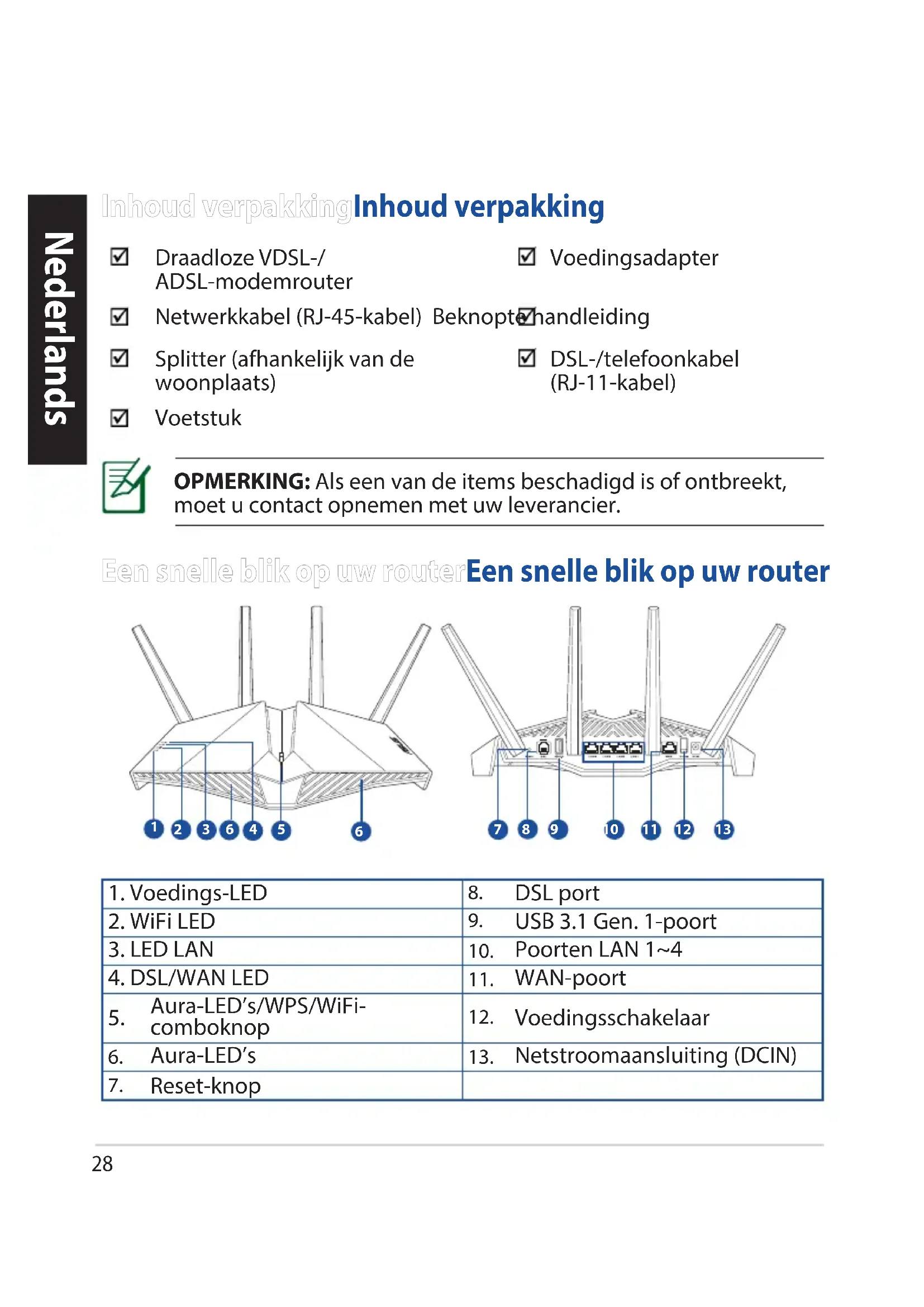 - Brugervejledningen kan hentes online på https://www.asus.com/support28 Nederlands Een snelle blik op uw routerEen snelle blik op uw router OPMERKING: Als een van de items beschadigd is of ontbreekt, moet u contact opnemen met uw leverancier. Inhoud verpakkingInhoud verpakking Draadloze VDSL-/ ADSL-modemrouter Voedingsadapter Netwerkkabel (RJ-45-kabel) Beknopte handleiding Splitter (afhankelijk van de woonplaats) DSL-/telefoonkabel (RJ-11-kabel) Voetstuk