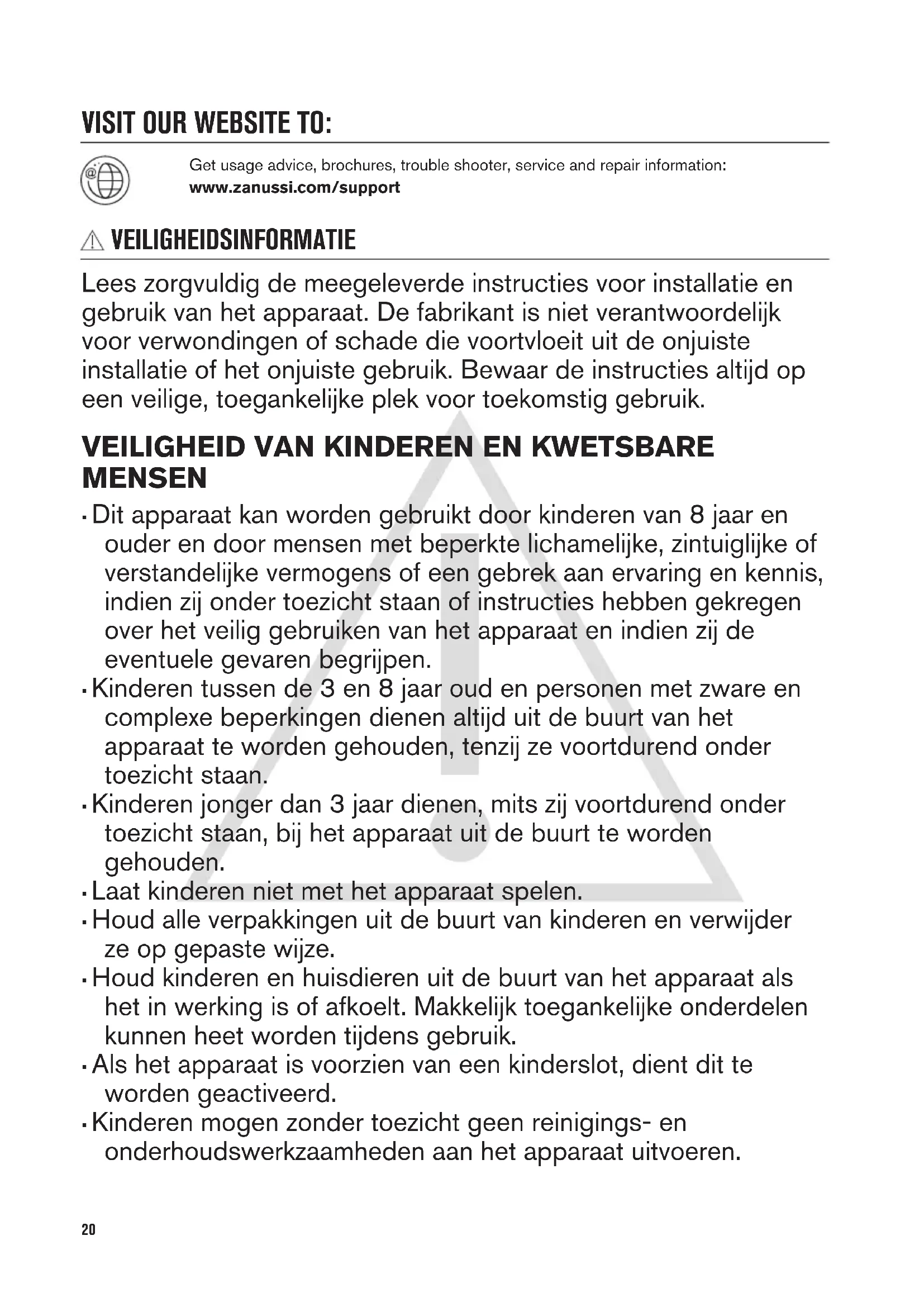 - Kinderen mogen zonder toezicht geen reinigings- en onderhoudswerkzaamheden aan het apparaat uitvoeren. 20ALGEMENE VEILIGHEID
