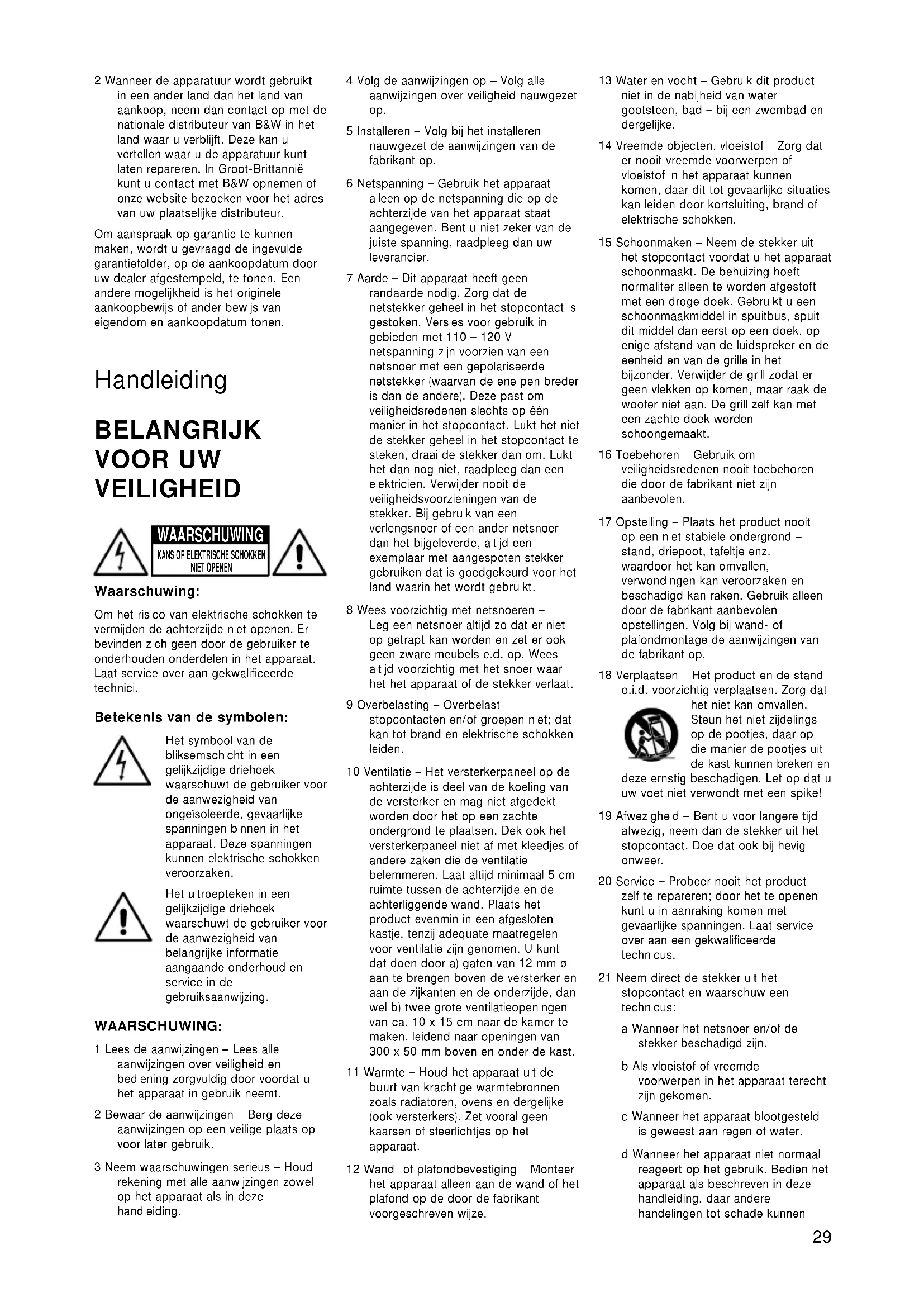 NIET OPENENleiden die door een gekwalificeerde technicus moet worden hersteld. e Wanneer het product is gevallen. f Wanneer het gedrag plotseling geheel anders dan gebruikelijk is – dit geeft aan dat er iets mis is. 22 Vervangende onderdelen – Wanneer vervangende onderdelen nodig zijn overtuig u er dan van dat deze van dezelfde soort en kwaliteit zijn als de originele. Niet originele vervangingen kunnen later problemen geven en tot gevaarlijke situaties leiden. 23 Netzekeringen – Voor een afdoende beveiliging tegen brand e.d., uitsluitend zekeringen van het juiste type en de juiste waarde gebruiken. De versterker is bedoeld voor gebruik op een 100 – 230 V wisselspanningsnet, waarvoor verschillende zekeringen worden gebruikt, afhankelijk van de netspanning. De juiste waarde voor elke netspanning is op het product aangegeven. 24 Veiligheidscontrole – Laat een technicus na reparatie of onderhoud altijd een veiligheidscontrole uitvoeren. 25 Magnetisch veld – Het product heeft een magnetisch strooiveld dat binnen een straal van 0,5 meter invloed kan hebben op andere objecten (TV, monitoren, banden, cassettes, credit cards). Het TV-beeld kan ook buiten deze straal nog beïnvloed worden door het magnetisch strooiveld. Inleiding Dank u voor de aanschaf van deze Bowers & Wilkins ASW Actieve Subwoofer! Vanaf het allereerste begin in 1966 heeft B&W altijd gezocht naar de perfecte geluidsweergave. Deze zoektocht heeft niet alleen geleid tot grote investeringen in audiotechnologie en ontwikkeling; maar geïnspireerd door de inmiddels overleden oprichter John Bowers ook in een voortdurende muzikale betrokkenheid: alleen op die manier namelijk kan alle technologie optimaal wordt gebruikt. Deze subwoofer is speciaal ontworpen voor Home Theater systemen en ook om het laag van stereosystemen extra te versterken. De subwoofer doet echter veel meer dan de laagweergave van uw audiosysteem uitbreiden. Doordat namelijk de gewone luidsprekers in het laag nu veel minder belast worden, verbetert ook de weergave van het erg belangrijke middengebied. Wij raden u aan voor in gebruik name deze handleiding in zijn geheel aandachtig door te lezen. Hoe goed de luidspreker op zich ook is, elke luidspreker is afhankelijk van de ruimte waarin hij staat. De tijd die u daarom spendeert aan een zo goed mogelijke opstelling zal uiteindelijk resulteren in vele uren luisterplezier. Daar de actieve luidspreker direct is verbonden met het lichtnet is het zeer belangrijk de veiligheidsinstructies en waarschuwingen goed te lezen en nauwgezet op te volgen. Bewaar deze handleiding op een veilige plaats als referentie voor later. Bowers & Wilkins luidsprekers worden verkocht in meer dan 60 landen over de hele wereld. B&W heeft een internationaal netwerk van zorgvuldig geselecteerde importeurs die u optimale service zullen geven. Heeft u problemen heeft die uw leverancier niet kan oplossen, neem dan contact op met de importeur. Uitpakken (afbeelding 1) Dit is de eenvoudigste manier om de luidsprekers uit te pakken: