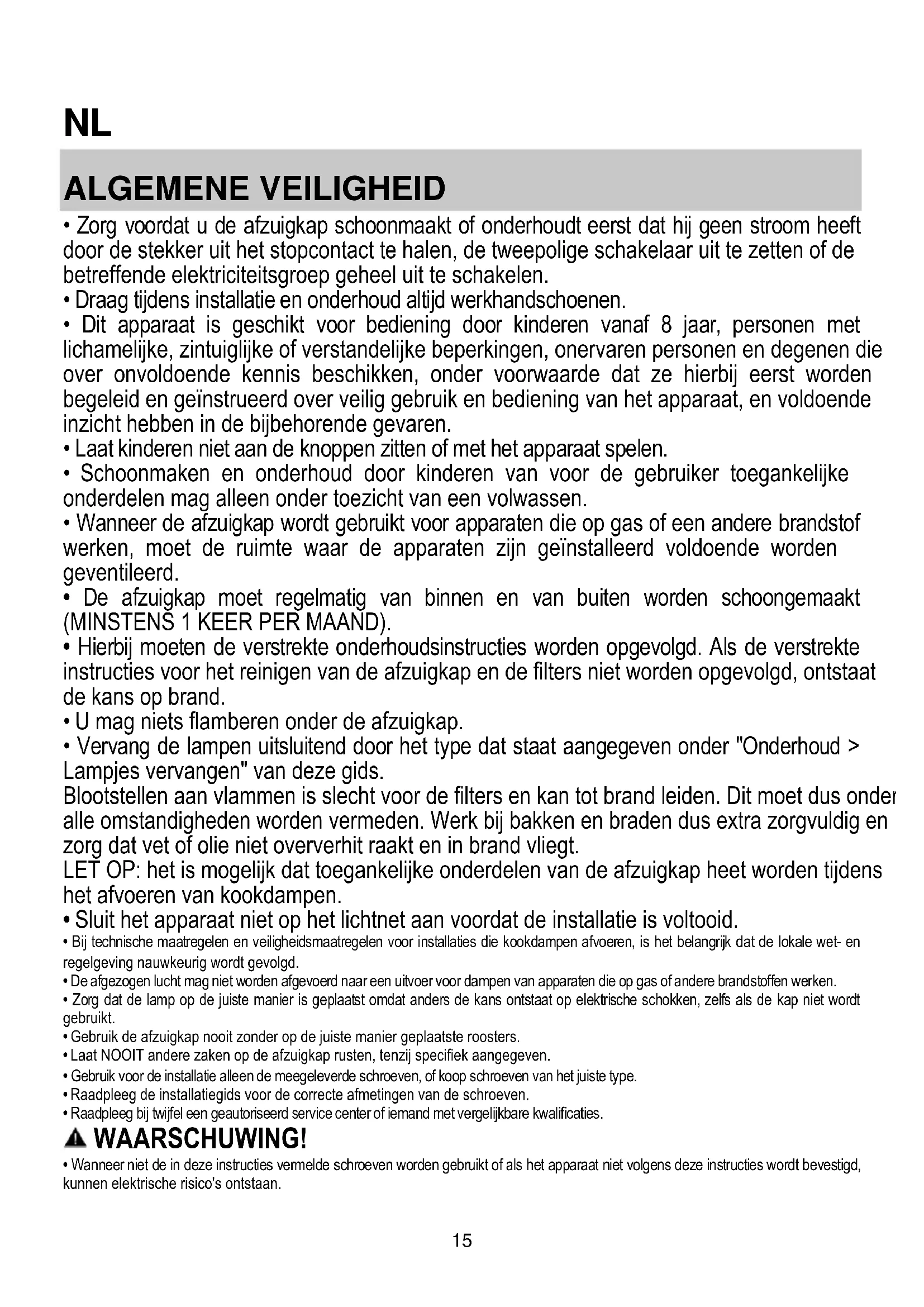 - Wanneer de afzuigkap wordt gebruikt voor apparaten die op gas of een andere brandstof werken, moet de ruimte waar de apparaten zijn geïnstalleerd voldoende worden geventileerd.