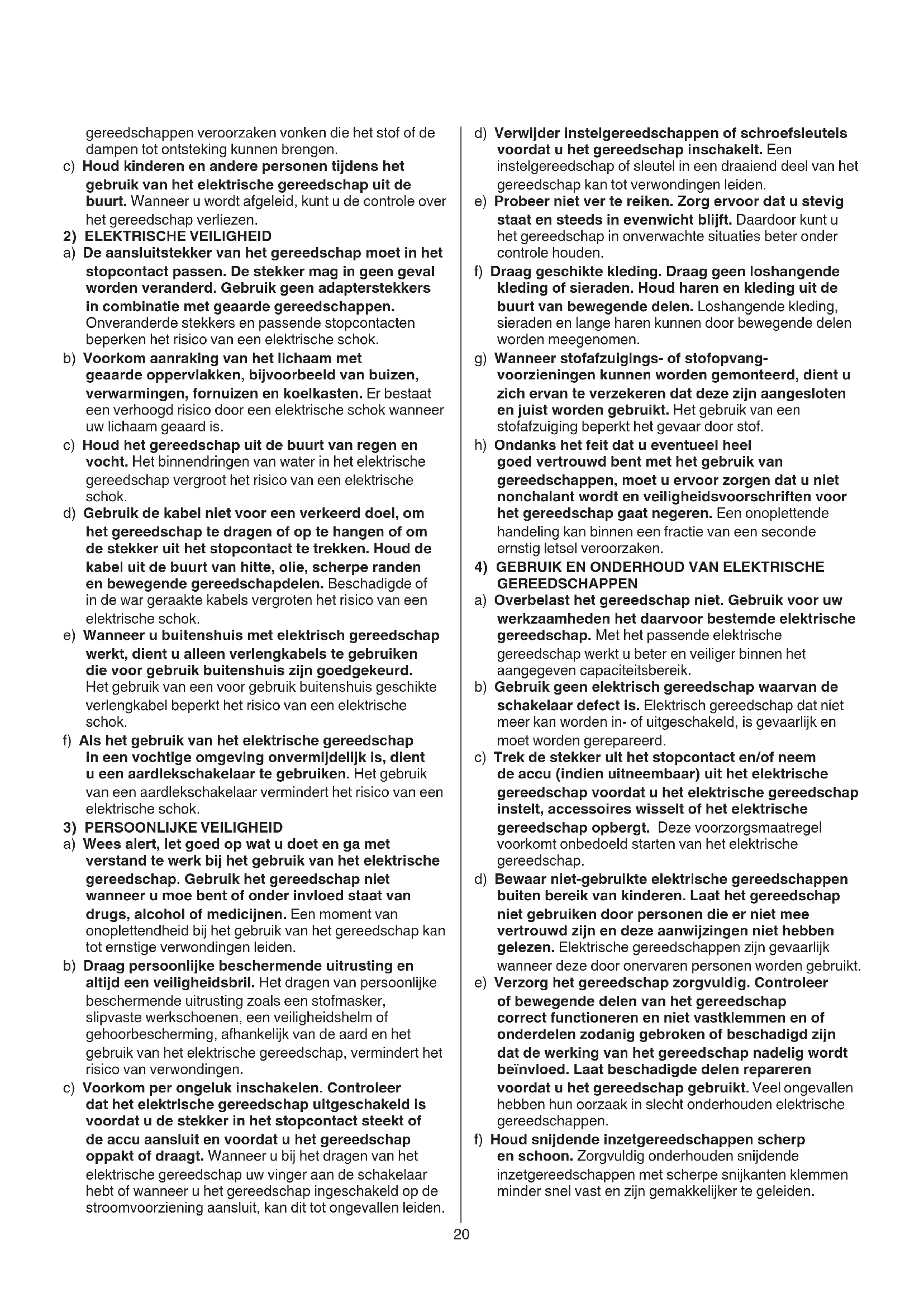 a) Wees alert, let goed op wat u doet en ga met verstand te werk bij het gebruik van het elektrische gereedschap. Gebruik het gereedschap niet wanneer u moe bent of onder invloed staat van drugs, alcohol of medicijnen. Een moment van onoplettendheid bij het gebruik van het gereedschap kan tot ernstige verwondingen leiden. b) Draag persoonlijke beschermende uitrusting en altijd een veiligheidsbril. Het dragen van persoonlijke beschermende uitrusting zoals een stofmasker, slipvaste werkschoenen, een veiligheidshelm of gehoorbescherming, afhankelijk van de aard en het gebruik van het elektrische gereedschap, vermindert het risico van verwondingen. c) Voorkom per ongeluk inschakelen. Controleer dat het elektrische gereedschap uitgeschakeld is voordat u de stekker in het stopcontact steekt of de accu aansluit en voordat u het gereedschap oppakt of draagt. Wanneer u bij het dragen van het elektrische gereedschap uw vinger aan de schakelaar hebt of wanneer u het gereedschap ingeschakeld op de stroomvoorziening aansluit, kan dit tot ongevallen leiden.21