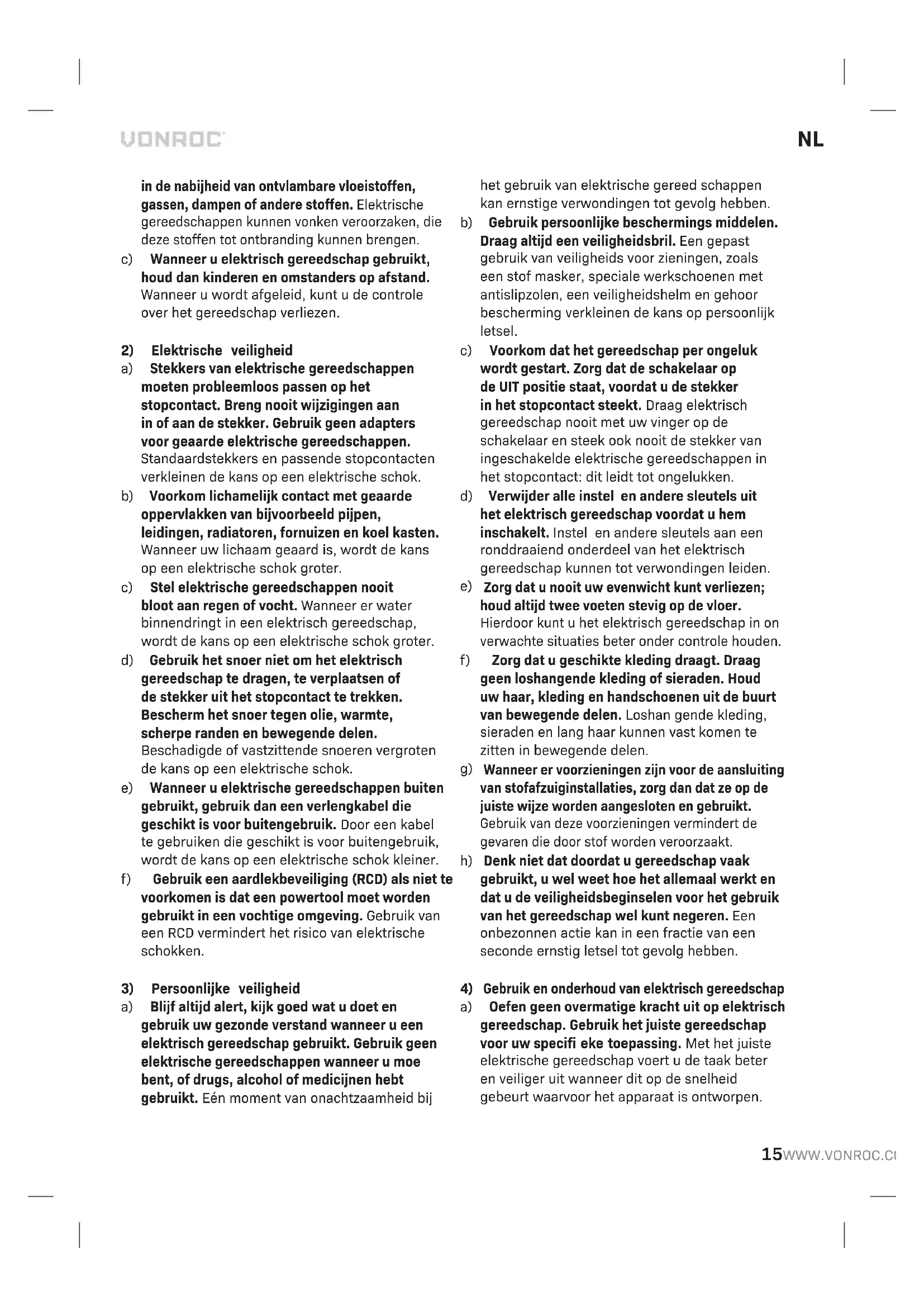Zorg dat de machine niet onder spanning staat wanneer onderhoudswerkzaamheden aan het mechaniek worden uitgevoerd. Reinig de machinebehuizing regelmatig met een zachte doek, bij voorkeur iedere keer na gebruik. Zorg dat de ventilatiesleuven vrij van stof en vuil zijn. Gebruik bij hardnekkig vuil een zachte doek bevochtigd met zeepwater. Gebruik geen oplosmid- delen als benzine, alcohol, ammonia, etc. Dergelij- ke stoffen beschadigen de kunststof onderdelen. MILIEU Defecte en/of afgedankte elektrische of elektronische gereedschappen dienen ter verwerking te worden aangeboden aan een daarvoor verantwoordelijke instantie. Uitsluitend voor EG-landen Werp elektrisch gereedschap niet weg bij het huisvuil. Conform de Europese Richtlijn 2012/19/ EG voor Afgedankte Elektrische en Elektronische Apparatuur en de implementatie ervan in nationaal recht moet niet langer te gebruiken elektrisch gereedschap gescheiden worden verzameld en op een milieuvriendelijke wijze worden verwerkt. GARANTIE VONROC producten zijn ontworpen volgens de hoogste kwaliteitsstandaarden en gegarandeerd vrij van defecten, zowel materieel als fabrieksfouten, tijdens de wettelijk vastgestelde garantieperiode vanaf de eerste aankoopdatum. Mocht het product tijdens deze periode gebreken vertonen veroorzaakt door defecte materialen en/of fabrieksfouten, neem dan rechtstreeks contact op met VONROC. De volgende situaties vallen niet onder de garantie: