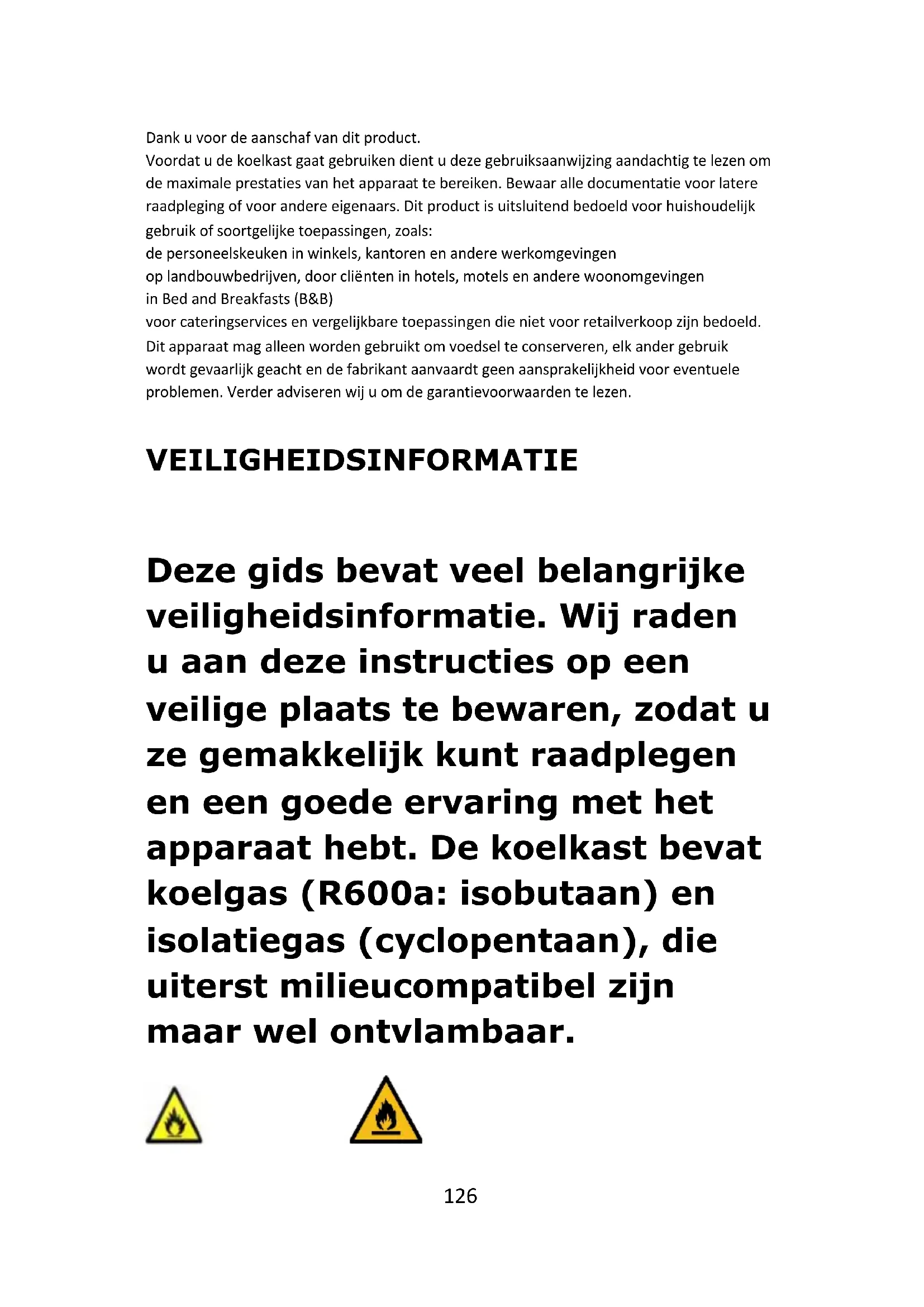 - Als het apparaat gedurende lange tijd leeg is, moet u het uitschakelen, ontdooien, reinigen, drogen en de deur open laten om schimmelvorming in het apparaat te voorkomen. WAARSCHUWING! Bij het gebruik, onderhoud en verwijdering van het apparaat141 dient u rekening te houden met het symbool links op de achterkant van het apparaat (achterwand of compressor). Dit is het waarschuwingssymbool voor brandgevaar. Er bevinden zich brandbare materialen in de koelmiddelleidingen en de compressor. Gelieve tijdens het gebruik, onderhoud en verwijdering uit de buurt van vuurbronnen te houden.142