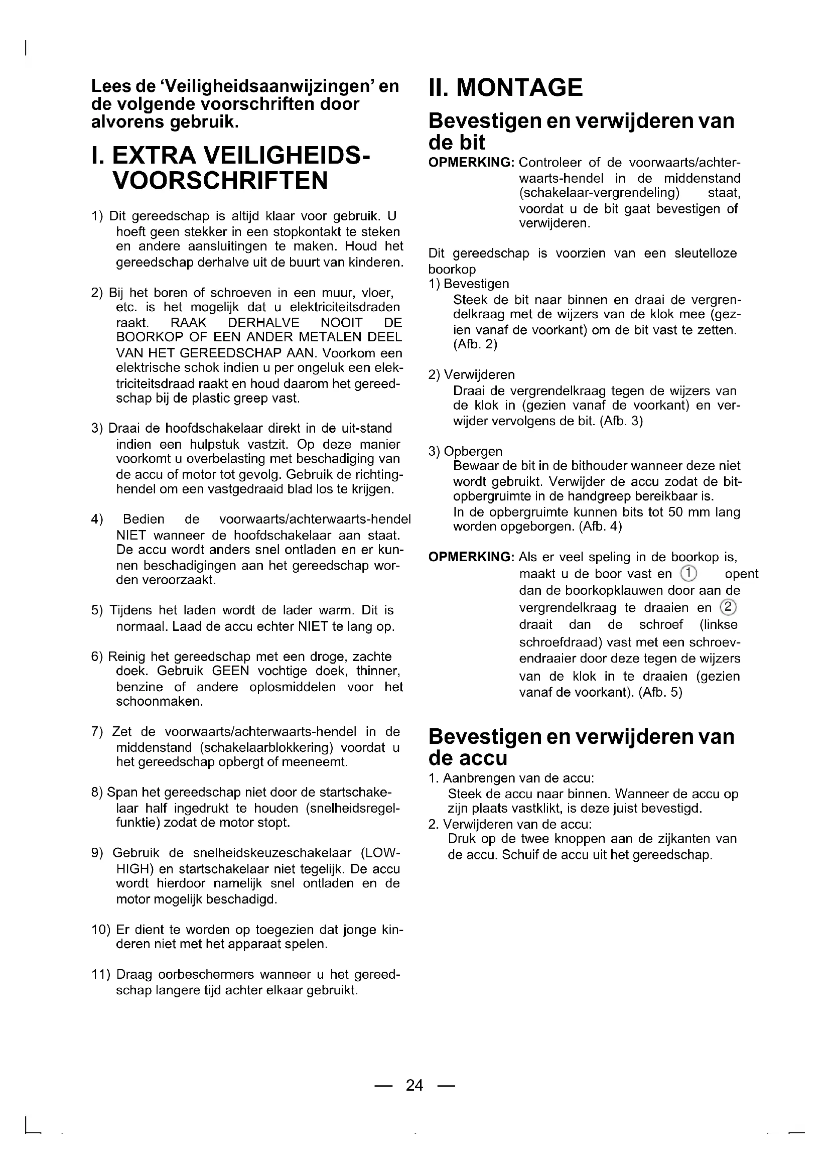 Bevestigen en verwijderen van de bit OPMERKING: Controleer of de voorwaarts/achter-waarts-hendel in de middenstand(schakelaar-vergrendeling) staat,voordat u de bit gaat bevestigen ofverwijderen.Dit gereedschap is voorzien van een sleutellozeboorkop1) BevestigenSteek de bit naar binnen en draai de vergren-delkraag met de wijzers van de klok mee (gez-ien vanaf de voorkant) om de bit vast te zetten.(Afb. 2)2) VerwijderenDraai de vergrendelkraag tegen de wijzers vande klok in (gezien vanaf de voorkant) en ver-wijder vervolgens de bit. (Afb. 3)3) OpbergenBewaar de bit in de bithouder wanneer deze nietwordt gebruikt. Verwijder de accu zodat de bit-opbergruimte in de handgreep bereikbaar is.In de opbergruimte kunnen bits tot 50 mm langworden opgeborgen. (Afb. 4)OPMERKING: Als er veel speling in de boorkop is,maakt u de boor vast en opentdan de boorkopklauwen door aan devergrendelkraag te draaien en draait dan de schroef (linkseschroefdraad) vast met een schroev-endraaier door deze tegen de wijzersvan de klok in te draaien (gezienvanaf de voorkant). (Afb. 5) Bevestigen en verwijderen van de accu 1. Aanbrengen van de accu:Steek de accu naar binnen. Wanneer de accu opzijn plaats vastklikt, is deze juist bevestigd.2. Verwijderen van de accu:Druk op de twee knoppen aan de zijkanten vande accu. Schuif de accu uit het gereedschap.