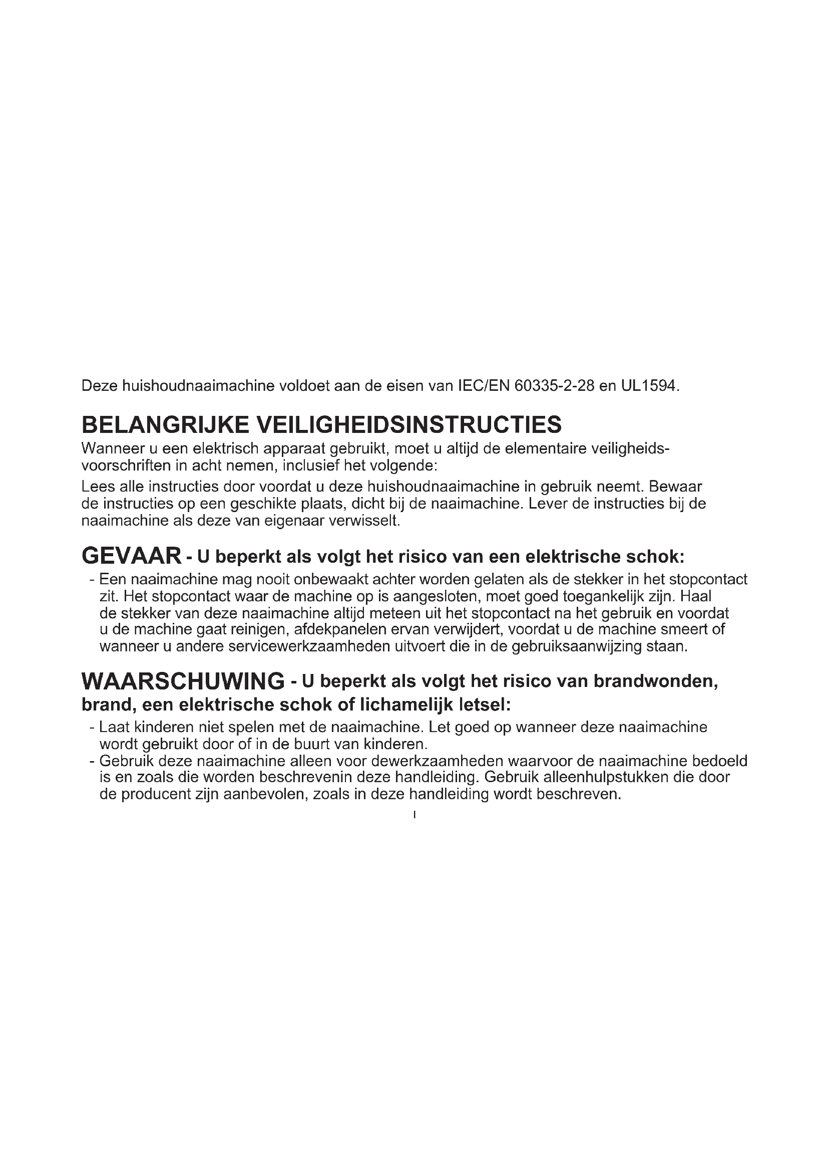 UITSLUITEND VOOR CENELEC-LANDEN: Dit apparaat mag worden gebruikt door kinderen vanaf 8 jaar en door personen met verminderde fysieke, sensorische of mentale capaciteiten of met een gebrek aan ervaring en kennis als ze supervisie of instructies hebben gekregen om het apparaat op een veilige manier te kunnen gebruiken en als ze begrijpen welke gevaren eraan verbonden zijn. Kinderen mogen niet met het apparaat spelen. Reiniging en gebruikersonderhoud mogen niet zonder supervisie door kinderen worden uitgevoerd. Bij normale gebruiksomstandigheden is het geluidsniveau minder dan 75dB(A). De machine mag alleen worden gebruikt met een voetpedaal van het type FC-2902D (220-240V) dat is vervaardigd door Zhejiang Founder Motor Corporation, LTD. (Vietnam) / 4C-326G (230V) / 4C-336G (240V) dat is vervaardigd door Wakaho Electric Ind. Co., Ltd. (Vietnam).IV VOOR NIET-CENELEC-LANDEN: Deze naaimachine is niet bedoeld om te worden gebruikt door personen (inclusief kinderen) met verminderde fysieke, sensorische of mentale capaciteiten, of met een gebrek aan ervaring en kennis, als ze geen supervisie of instructie voor het gebruik van de naaimachine hebben gekregen van een persoon die verantwoordelijk is voor hun veiligheid. Kinderen moeten in de gaten worden gehouden om te zorgen dat ze niet met de naaimachine spelen. Bij normale gebruiksomstandigheden is het geluidsniveau minder dan 75dB(A). De machine mag alleen worden gebruikt met een voetpedaal van het type FKD-1902, FC-1902 (110-120V)/ KD-2902, FC-2902A, FC-2902C, FC-2902D (220-240V) dat is vervaardigd door Zhejiang Founder Motor Corporation, LTD. (Vietnam) / 4C-316B (110-125V) / 4C-316C (127V) /4C-326C (220V) / 4C-326G (230V) / 4C-336G (240V) dat is vervaardigd door Wakaho Electric Ind. Co., Ltd. (Vietnam).