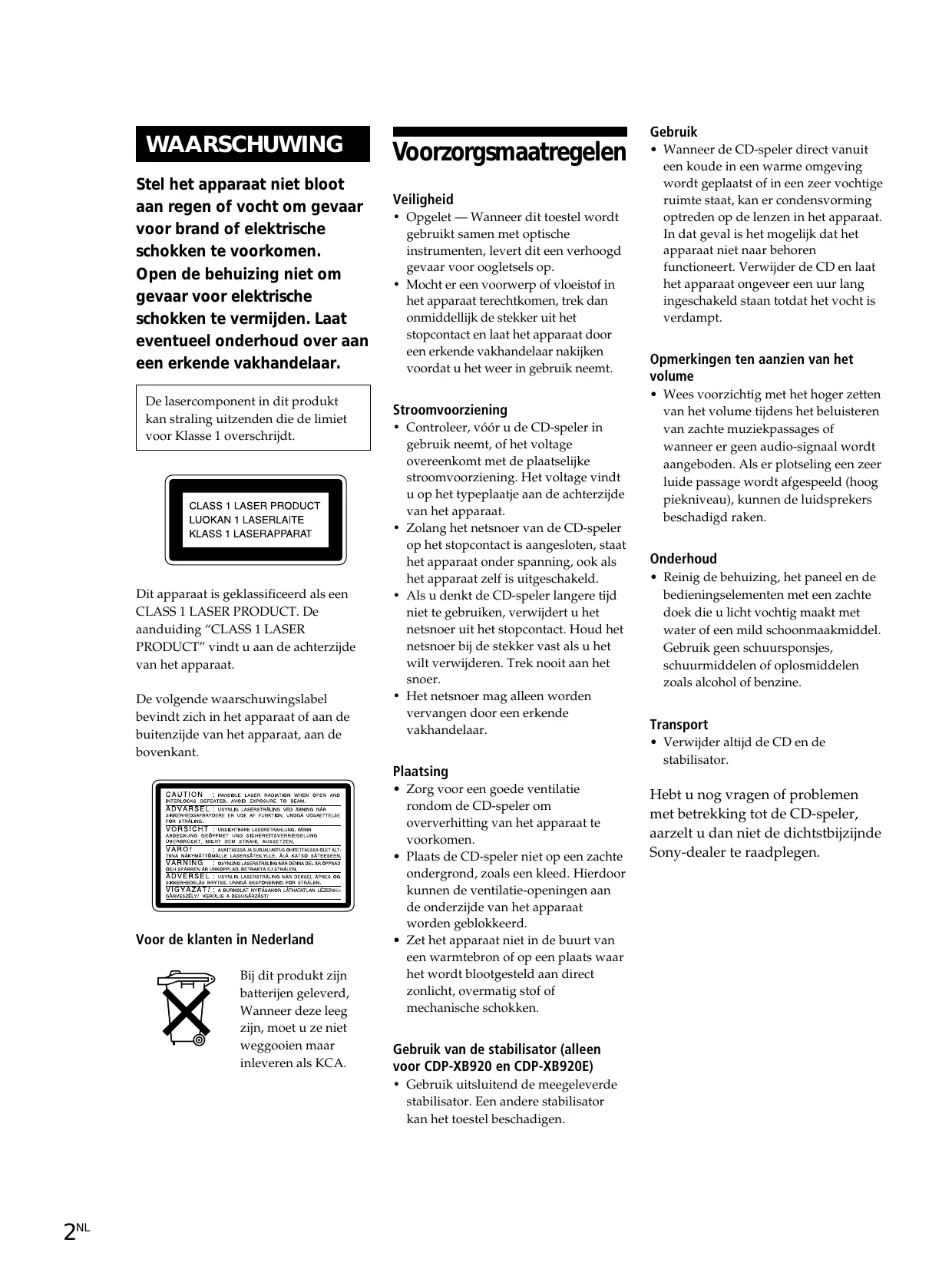 De CD-speler is nu klaar voor gebruik. Als u voor het eerst een CD gaat afspelen, leest u verder bij /Vervang alle batterijen van de afstandsbediening door nieuwe als de oude (bijna) leeg zijn. De CD-lade opent en sluit automatisch als u de speler aanzet (alleen CDP-XB820). /De speler doet dit als u de CD-lade hebt ingedrukt terwijl de speler af stond toen u hem voor de laatste maal gebruikte. /De speler opent en sluit de lade als de CD-lade tijdens transport of door een schok uit positie is gebracht.