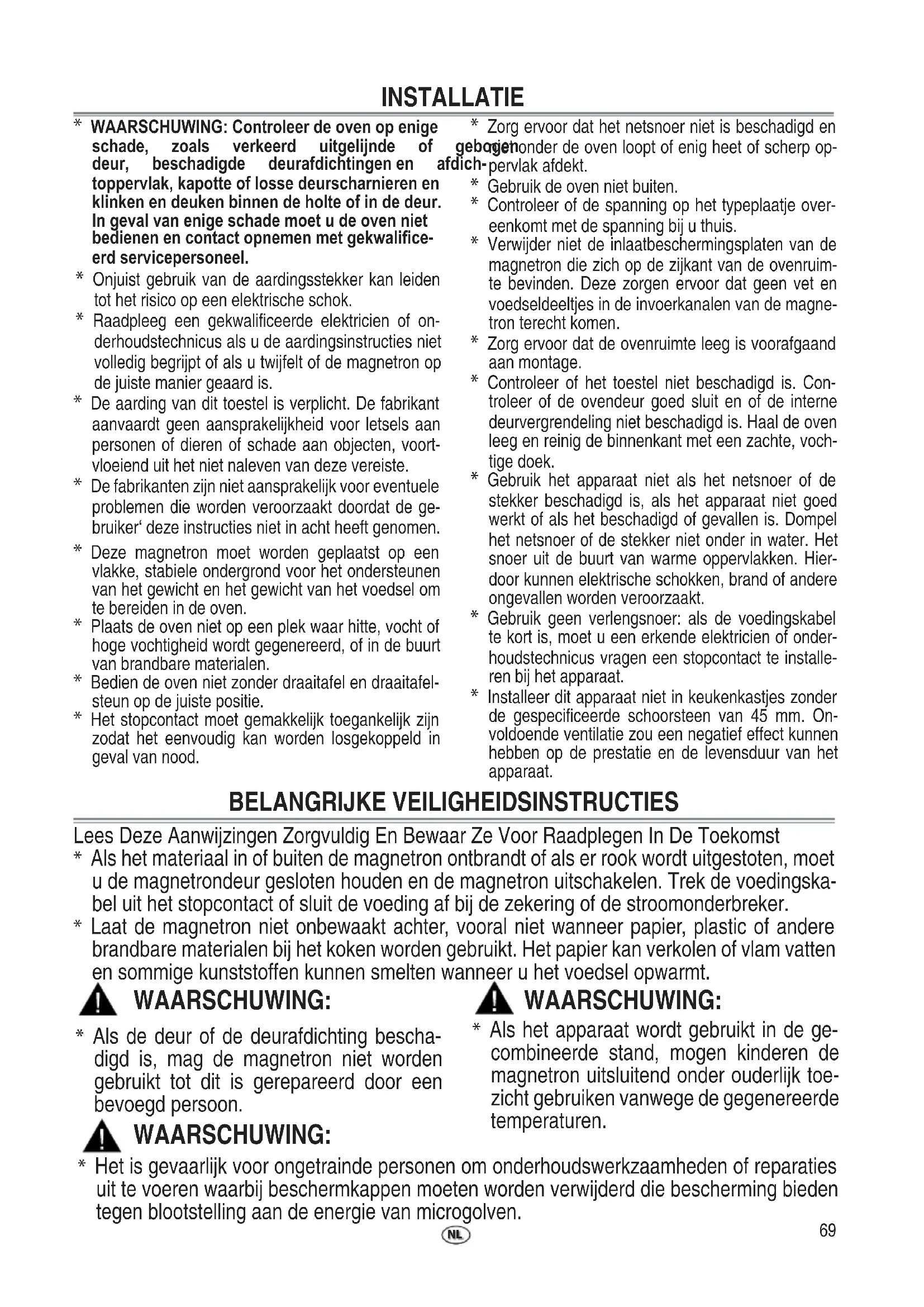 - Als de deur of de deurafdichting bescha- digd is, mag de magnetron niet worden gebruikt tot dit is gerepareerd door een bevoegd persoon. WAARSCHUWING: