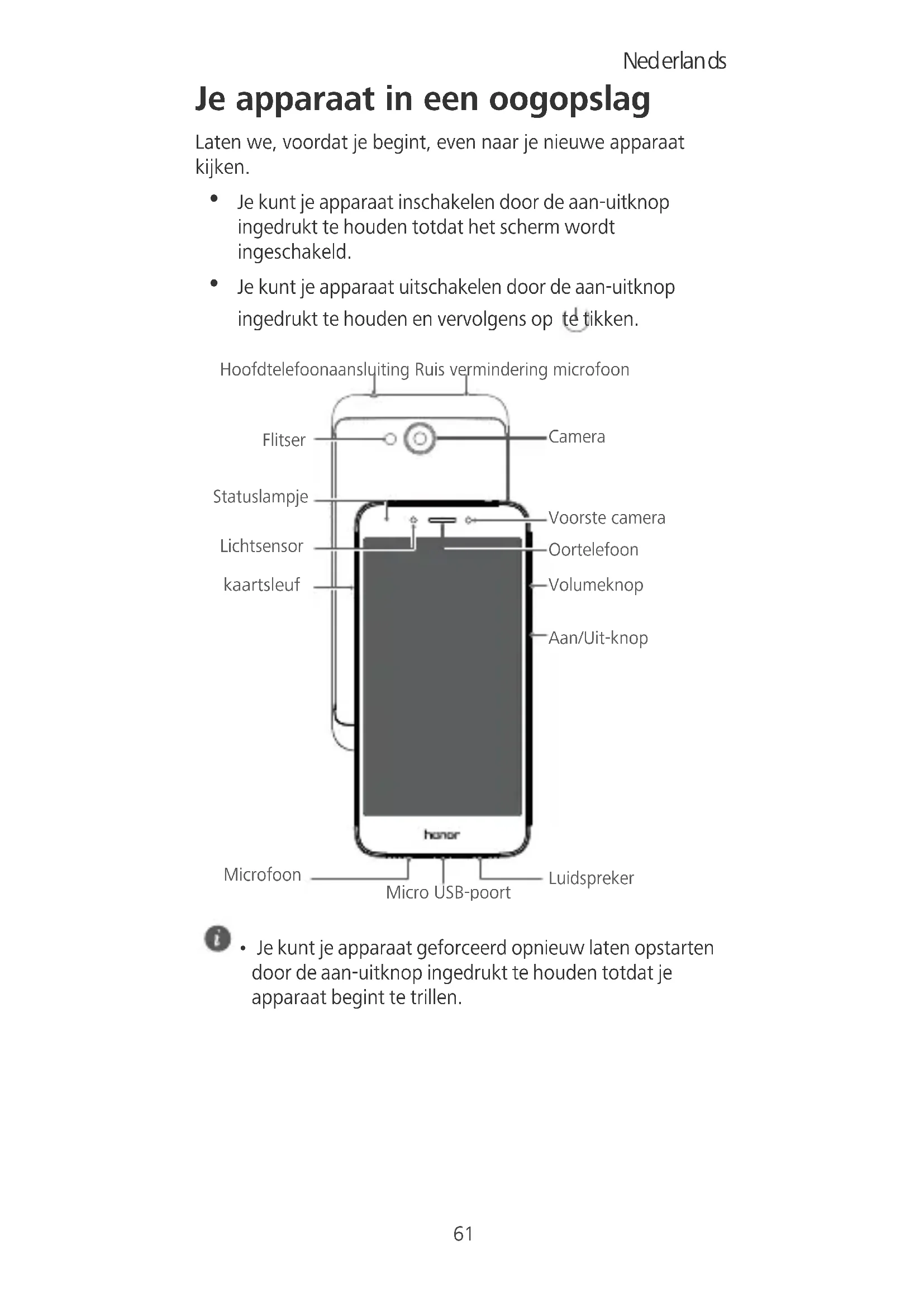 - Je kunt je apparaat geforceerd opnieuw laten opstarten door de aan-uitknop ingedrukt te houden totdat je apparaat begint te trillen. Hoofdtelefoonaansluiting Ruis vermindering microfoon Camera Oortelefoon Voorste camera Volumeknop Aan/Uit-knop Microfoon Micro USB-poort Luidspreker Statuslampje Lichtsensor Flitser kaartsleuf