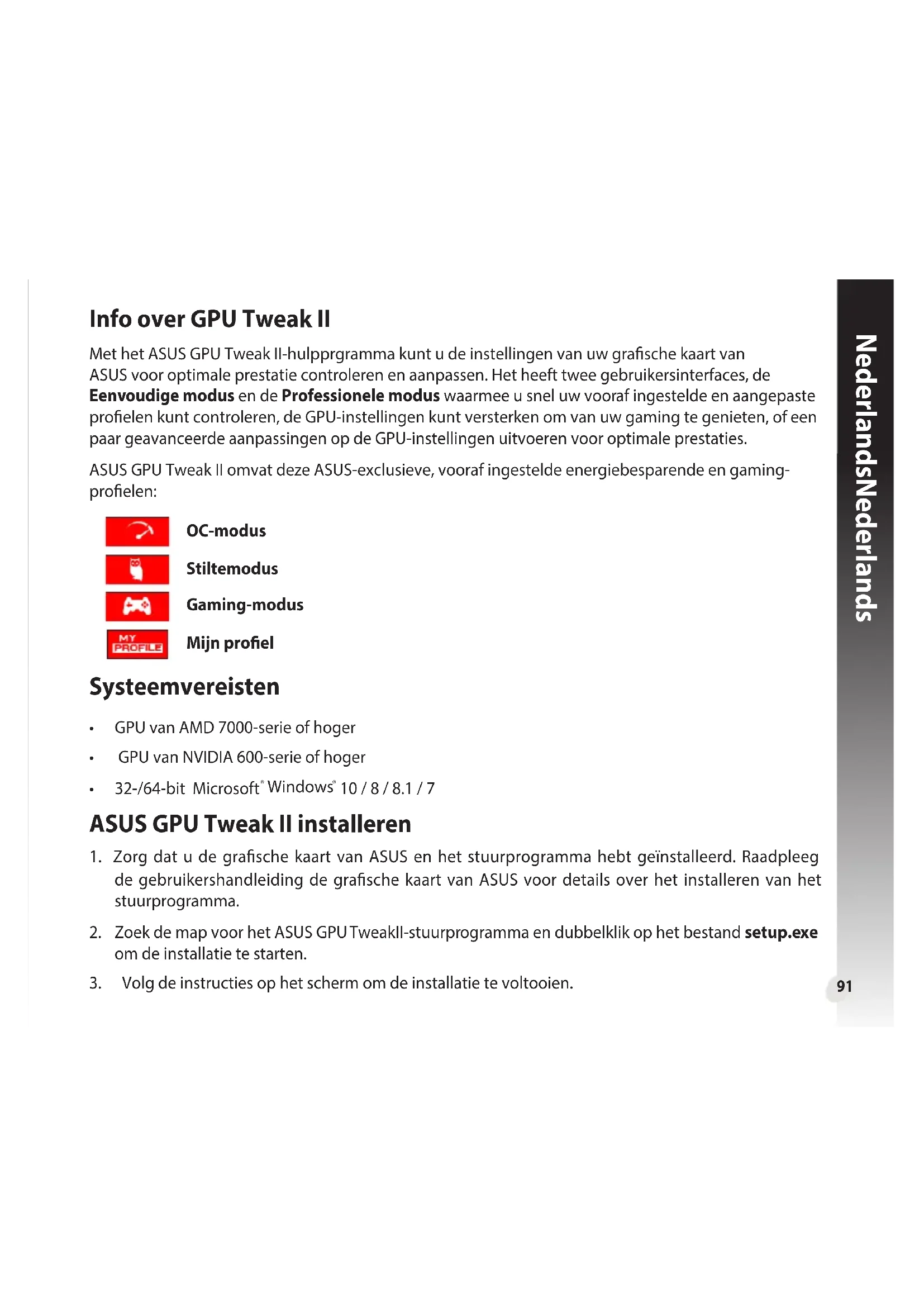 - KlikStarten > Alle programma's > ASUS > GPU Tweak II om het programma te lanceren. Vereenvoudigde modus DevereenvoudigdemodusbiedtueensnellemanieromuwGPU-instellingeninrealtimetecontroleren, enkele systeeminstellingen via Gaming Booster aan te passen om van uw gaming te genieten. Kenmerkenvaneen vooraf ingesteld proel Voorafingestel- de/aangepaste ASUS-proelen GPU-info en Live Update Instellingen Ventilatorsnelheidinschakelen/ uitschakelen(0dbventilator)* *VerschijntalleenopeengraschekaartvanASUSmetde0dbventilatorfunctie. Het statuspaneel koppelen/loskop- pelen Gaming Booster lanceren Professionele modus lanceren Statuspaneel XSplit lanceren93 NederlandsNederlands Gaming Booster KrijgmetGamingBoosterdevereisteprestatieomvanuwgamingtegenieten.Hethelptuwsysteem te optimaliseren om probleemloos en sneller uw computer-games te spelen. GamingBoosterbiedtudezedrie(3)functies: