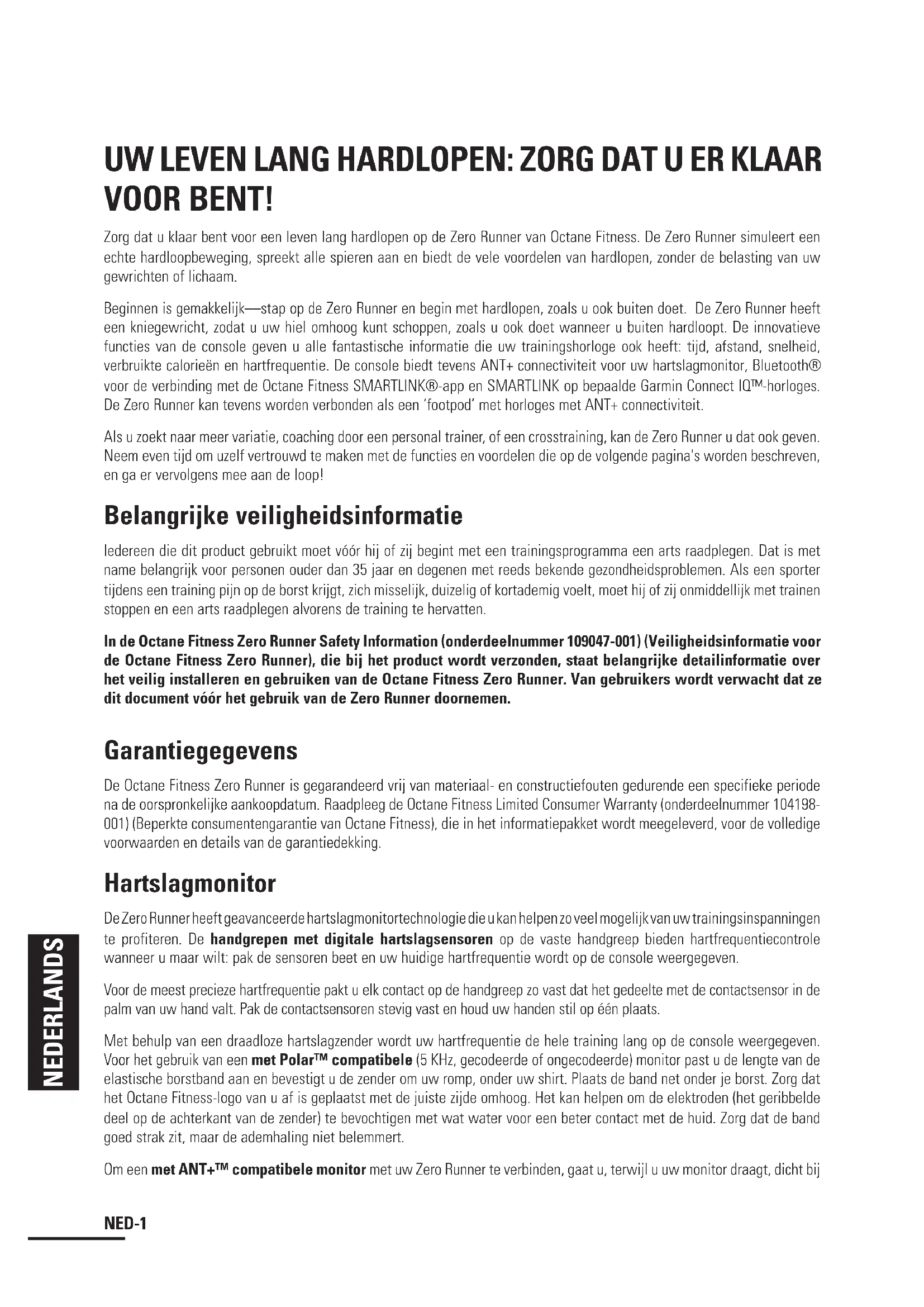 - PowerBlock™ rek ........................................................................................................... 10 TIPS EN TRUCS ............................................................................................................................ 11NED-1 NEDERLANDS UW LEVEN LANG HARDLOPEN: ZORG DAT U ER KLAAR VOOR BENT! Zorg dat u klaar bent voor een leven lang hardlopen op de Zero Runner van Octane Fitness. De Zero Runner simuleert een echte hardloopbeweging, spreekt alle spieren aan en biedt de vele voordelen van hardlopen, zonder de belasting van uw gewrichten of lichaam. Beginnen is gemakkelijk––stap op de Zero Runner en begin met hardlopen, zoals u ook buiten doet. De Zero Runner heeft een kniegewricht, zodat u uw hiel omhoog kunt schoppen, zoals u ook doet wanneer u buiten hardloopt. De innovatieve functies van de console geven u alle fantastische informatie die uw trainingshorloge ook heeft: tijd, afstand, snelheid, verbruikte calorieën en hartfrequentie. De console biedt tevens ANT+ connectiviteit voor uw hartslagmonitor, Bluetooth® voor de verbinding met de Octane Fitness SMARTLINK®-app en SMARTLINK op bepaalde Garmin Connect IQ™-horloges. De Zero Runner kan tevens worden verbonden als een ‘footpod’ met horloges met ANT+ connectiviteit. Als u zoekt naar meer variatie, coaching door een personal trainer, of een crosstraining, kan de Zero Runner u dat ook geven. Neem even tijd om uzelf vertrouwd te maken met de functies en voordelen die op de volgende pagina's worden beschreven, en ga er vervolgens mee aan de loop! Belangrijke veiligheidsinformatie Iedereen die dit product gebruikt moet vóór hij of zij begint met een trainingsprogramma een arts raadplegen. Dat is met name belangrijk voor personen ouder dan 35 jaar en degenen met reeds bekende gezondheidsproblemen. Als een sporter tijdens een training pijn op de borst krijgt, zich misselijk, duizelig of kortademig voelt, moet hij of zij onmiddellijk met trainen stoppen en een arts raadplegen alvorens de training te hervatten. In de Octane Fitness Zero Runner Safety Information (onderdeelnummer 109047-001) (Veiligheidsinformatie voor de Octane Fitness Zero Runner), die bij het product wordt verzonden, staat belangrijke detailinformatie over het veilig installeren en gebruiken van de Octane Fitness Zero Runner. Van gebruikers wordt verwacht dat ze dit document vóór het gebruik van de Zero Runner doornemen. Garantiegegevens De Octane Fitness Zero Runner is gegarandeerd vrij van materiaal- en constructiefouten gedurende een specifieke periode na de oorspronkelijke aankoopdatum. Raadpleeg de Octane Fitness Limited Consumer Warranty (onderdeelnummer 104198-