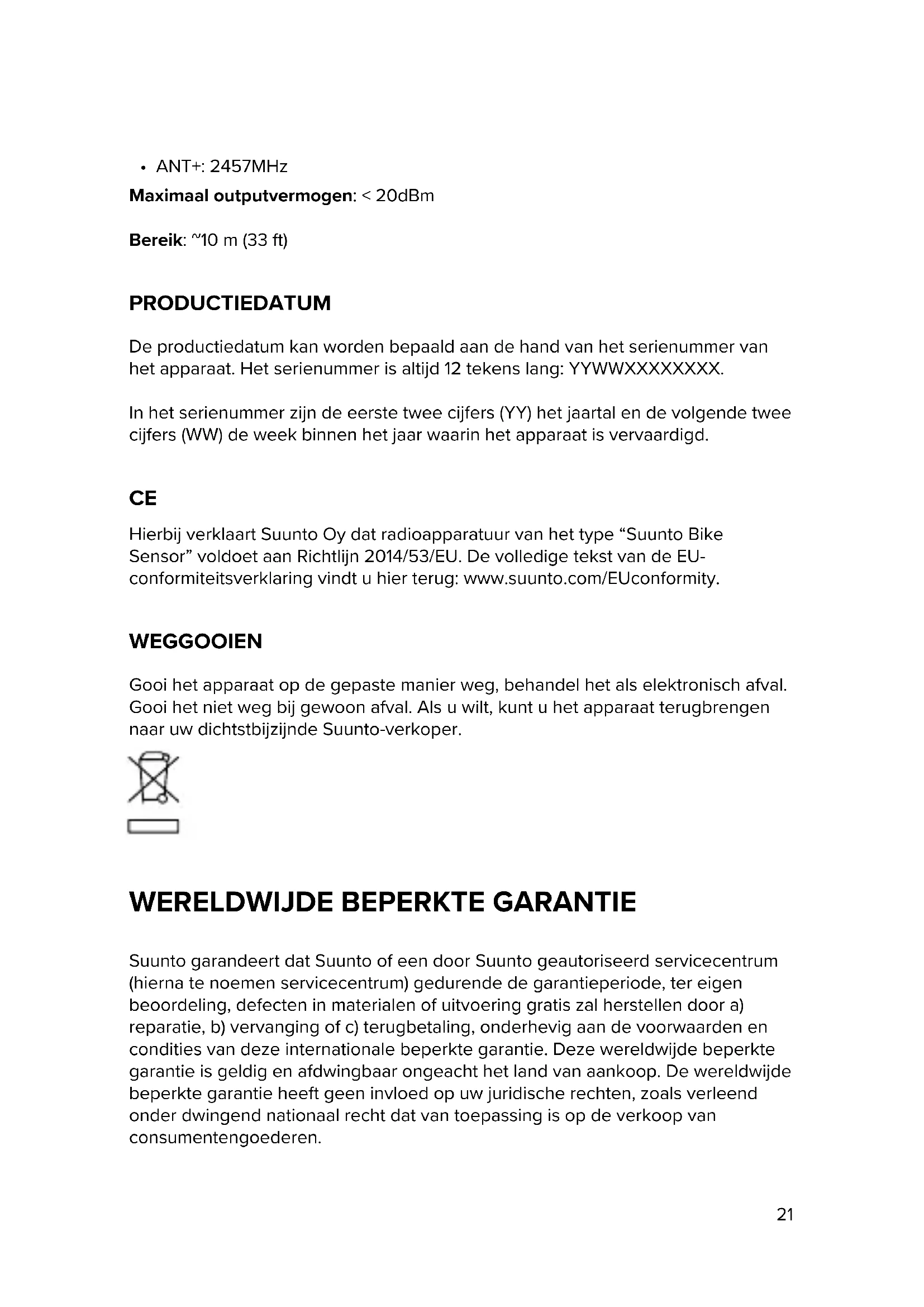 Hierbij verklaart Suunto Oy dat radioapparatuur van het type “Suunto Bike Sensor” voldoet aan Richtlijn 2014/53/EU. De volledige tekst van de EU- conformiteitsverklaring vindt u hier terug: www.suunto.com/EUconformity. WEGGOOIEN Gooi het apparaat op de gepaste manier weg, behandel het als elektronisch afval. Gooi het niet weg bij gewoon afval. Als u wilt, kunt u het apparaat terugbrengen naar uw dichtstbijzijnde Suunto-verkoper.