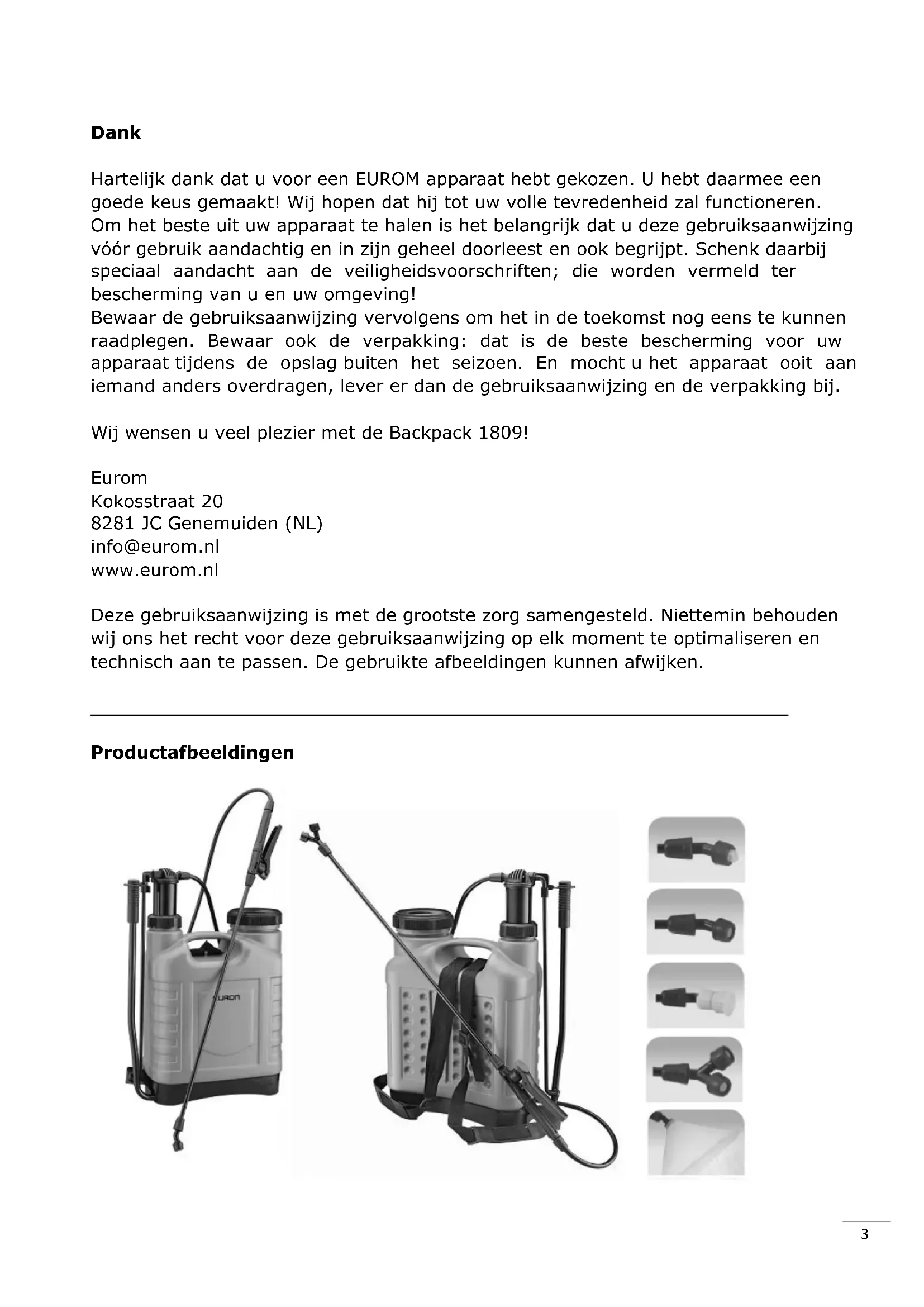 Productafbeeldingen4 Inleiding De EUROM BACKPACK 1809 is een nieuw ontwikkelde rugzaksproeier, veilig, economisch en efficiënt in het gebruik. Hij draagt comfortabel, werkt soepel en spuit gelijkmatig. De BACKPACK 1809 is speciaal geschikt voor het sproeien van vloeibare ongediertebestrijdingsmiddelen, onkruidverdelgers, bemestingsmiddelen en preventieve middelen tegen plantenziekten op gewassen, al of niet bloeiende planten, tuinen, sanitaire ruimtes van openbare gebouwen enz. en voor het uit voorzorg behandelen van vee- en pluimveestallen tegen epidemieën. Ook kan hij worden gebruikt voor huishoudelijke klussen als het wassen van ramen en auto enz. Het apparaat dient te worden gebruikt en onderhouden door volwassenen die ermee vertrouwd zijn en er veilig mee om weten te gaan. Ondeskundig gebruik van of onderhoud aan het apparaat als ook wijzigingen die aan het apparaat zijn aangebracht doen de aansprakelijkheid van de leverancier en de garantie vervallen. Het apparaat is niet geschikt voor dagelijks professioneel gebruik. Technische gegevens Werkdruk Max. 4 bar Tankinhoud 18 liter Diameter pomphuis 45 mm Materiaal tank Kunststof Afmetingen 42 x 19,5 x 57,5 cm Netto gewicht 3,2 kg