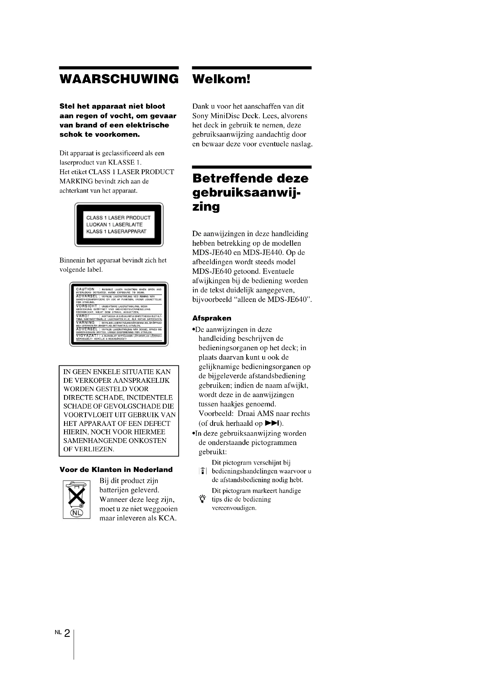 WAARSCHUWING Stel het apparaat niet bloot aan regen of vocht, om gevaar van brand of een elektrische schok te voorkomen. Dit apparaat is geclassificeerd als een laserproduct van KLASSE 1. Het etiket CLASS 1 LASER PRODUCT MARKING bevindt zich aan de achterkant van het apparaat. Binnenin het apparaat bevindt zich het volgende label. Voor de Klanten in Nederland Bij dit product zijn batterijen geleverd. Wanneer deze leeg zijn, moet u ze niet weggooien maar inleveren als KCA. Welkom! Dank u voor het aanschaffen van dit Sony MiniDisc Deck. Lees, alvorens het deck in gebruik te nemen, deze gebruiksaanwijzing aandachtig door en bewaar deze voor eventuele naslag. Betreffende deze gebruiksaanwij- zing De aanwijzingen in deze handleiding hebben betrekking op de modellen MDS-JE640 en MDS-JE440. Op de afbeeldingen wordt steeds model MDS-JE640 getoond. Eventuele afwijkingen bij de bediening worden in de tekst duidelijk aangegeven, bijvoorbeeld “alleen de MDS-JE640”. Afspraken