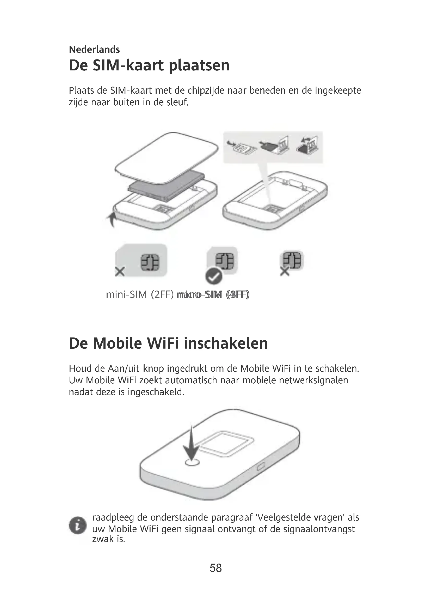 Aan/uit-knop De Mobile WiFi uitschakelen: houd de Aan/uit-knop ingedrukt totdat het LCD-scherm uitschakelt. De Mobile WiFi herstellen naar de fabrieksinstellingen: gebruik een speld om de Reset-knop ingedrukt te houden terwijl uw Mobile WiFi is ingeschakeld. Veelgestelde vragen Wat moet ik doen als mijn Mobile WiFi geen signaal kan ontvangen of geen verbinding kan maken met het internet?