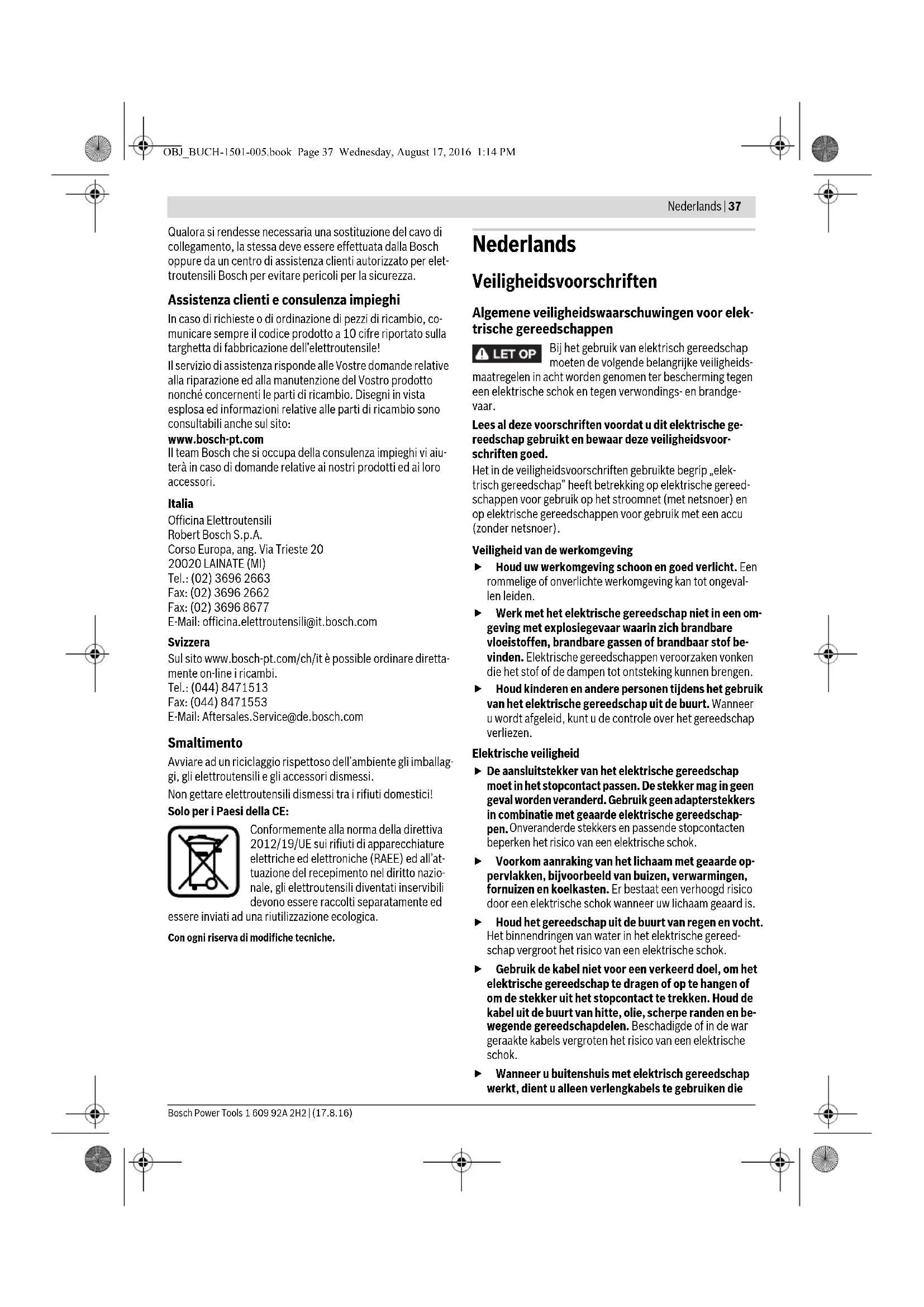 De aansluitstekker van het elektrische gereedschap moet in het stopcontact passen. De stekker mag in geen geval worden veranderd. Gebruik geen adapterstekkers in combinatie met geaarde elektrische gereedschap- pen. Onveranderde stekkers en passende stopcontacten beperken het risico van een elektrische schok. Voorkom aanraking van het lichaam met geaarde op- pervlakken, bijvoorbeeld van buizen, verwarmingen, fornuizen en koelkasten. Er bestaat een verhoogd risico door een elektrische schok wanneer uw lichaam geaard is. Houd het gereedschap uit de buurt van regen en vocht. Het binnendringen van water in het elektrische gereed- schap vergroot het risico van een elektrische schok. Gebruik de kabel niet voor een verkeerd doel, om het elektrische gereedschap te dragen of op te hangen of om de stekker uit het stopcontact te trekken. Houd de kabel uit de buurt van hitte, olie, scherpe randen en be- wegende gereedschapdelen. Beschadigde of in de war geraakte kabels vergroten het risico van een elektrische schok. Wanneer u buitenshuis met elektrisch gereedschap werkt, dient u alleen verlengkabels te gebruiken die OBJ_BUCH-1501-005.book Page 37 Wednesday, August 17, 2016 1:14 PM38 | Nederlands 1 609 92A 2H2 | (17.8.16) Bosch Power Tools voor gebruik buitenshuis zijn goedgekeurd. Het gebruik van een voor gebruik buitenshuis geschikte verlengkabel beperkt het risico van een elektrische schok. Als het gebruik van het elektrische gereedschap in een vochtige omgeving onvermijdelijk is, dient u een aard- lekschakelaar te gebruiken. Het gebruik van een aardlek- schakelaar vermindert het risico van een elektrische schok. Veiligheid van personen Wees alert, let goed op wat u doet en ga met verstand te werk bij het gebruik van het elektrische gereed- schap. Gebruik geen elektrisch gereedschap wanneer u moe bent of onder invloed staat van drugs, alcohol of medicijnen. Een moment van onoplettendheid bij het ge- bruik van het elektrische gereedschap kan tot ernstige ver- wondingen leiden.