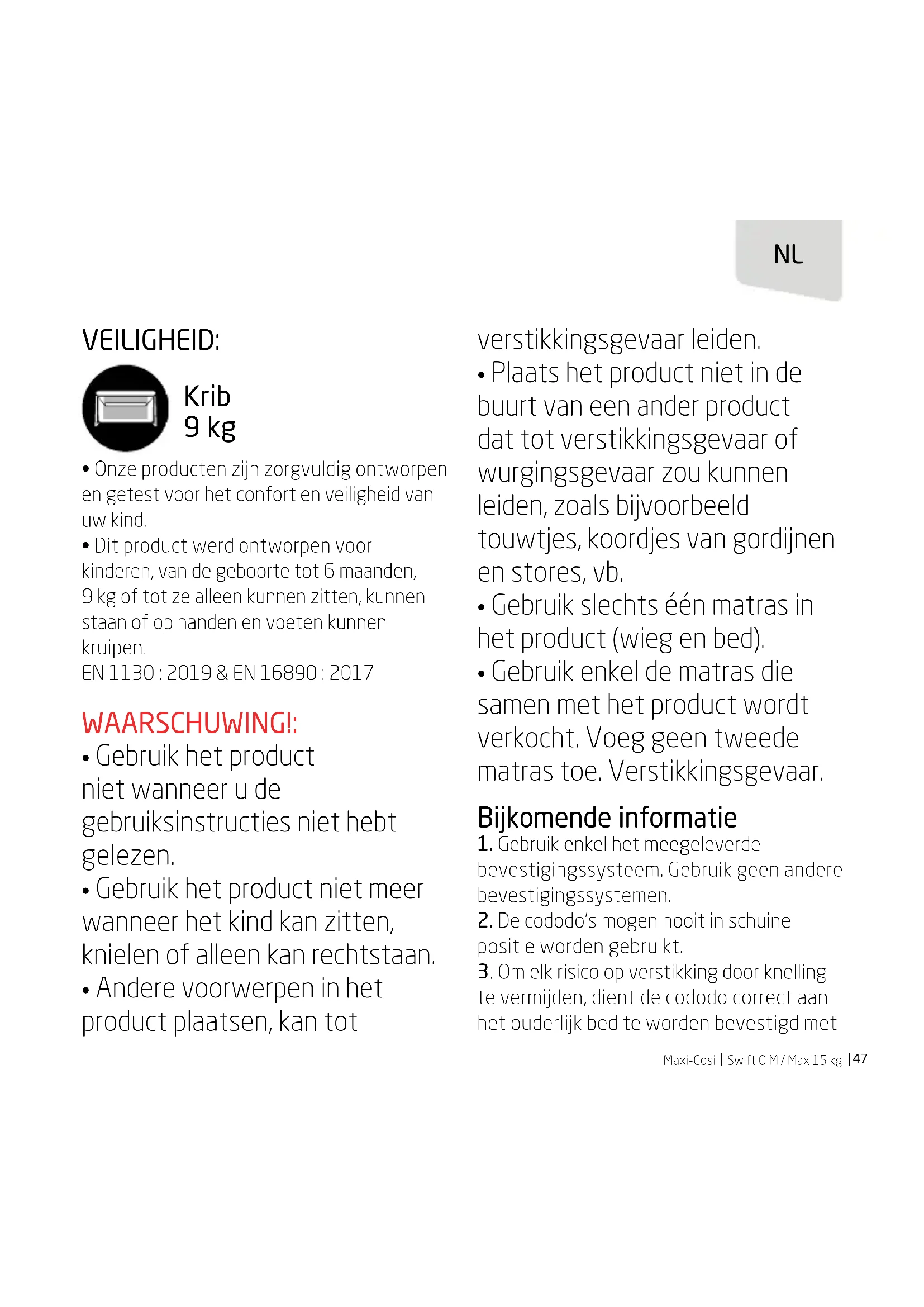 - Gebruik enkel de matras die samen met het product wordt verkocht. Voeg geen tweede matras toe. Verstikkingsgevaar. Bijkomende informatie