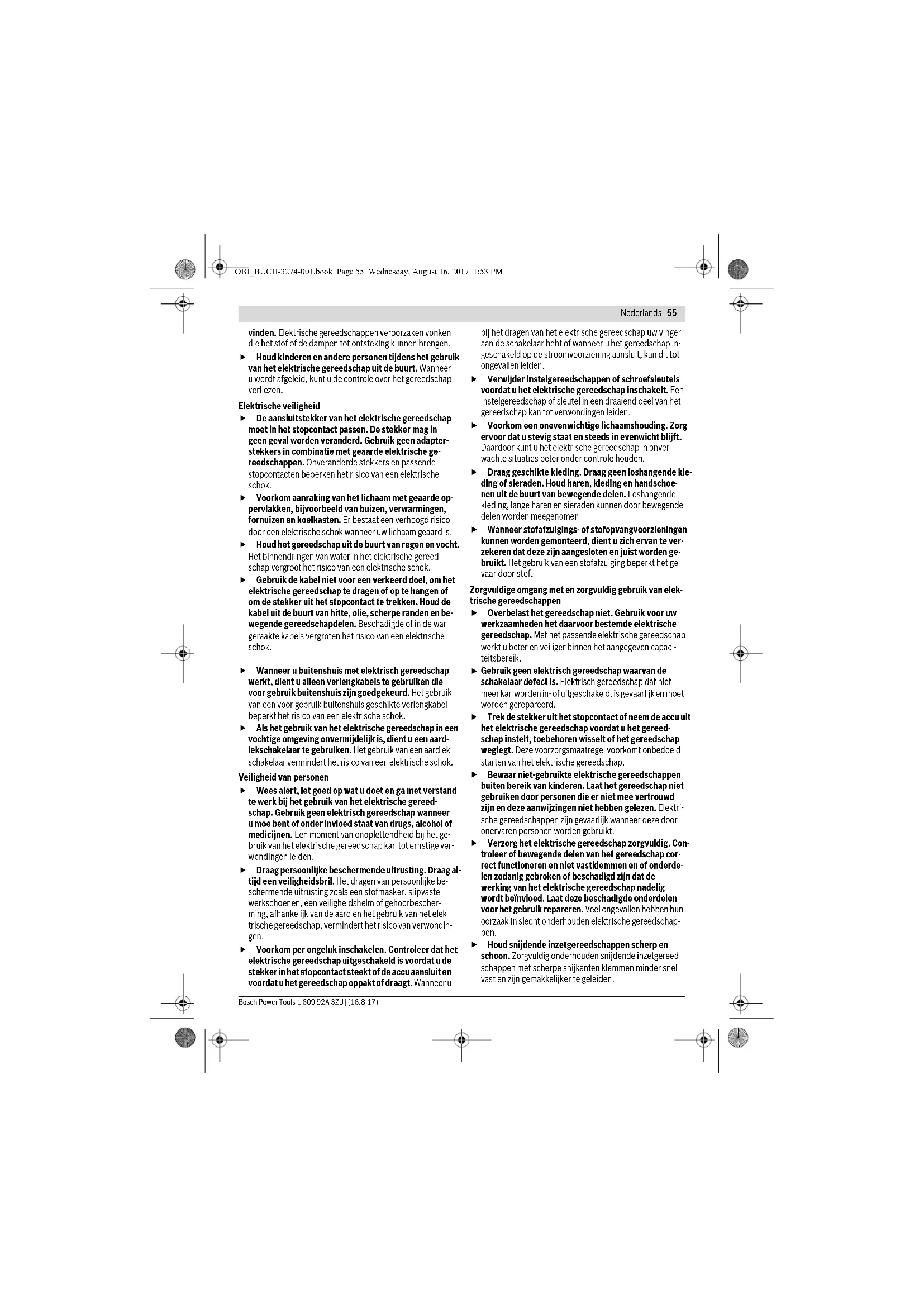 Gebruik geen elektrisch gereedschap waarvan de schakelaar defect is. Elektrisch gereedschap dat niet meer kan worden in- of uitgeschakeld, is gevaarlijk en moet worden gerepareerd. Trek de stekker uit het stopcontact of neem de accu uit het elektrische gereedschap voordat u het gereed- schap instelt, toebehoren wisselt of het gereedschap weglegt. Deze voorzorgsmaatregel voorkomt onbedoeld starten van het elektrische gereedschap. Bewaar niet-gebruikte elektrische gereedschappen buiten bereik van kinderen. Laat het gereedschap niet gebruiken door personen die er niet mee vertrouwd zijn en deze aanwijzingen niet hebben gelezen. Elektri- sche gereedschappen zijn gevaarlijk wanneer deze door onervaren personen worden gebruikt. Verzorg het elektrische gereedschap zorgvuldig. Con- troleer of bewegende delen van het gereedschap cor- rect functioneren en niet vastklemmen en of onderde- len zodanig gebroken of beschadigd zijn dat de werking van het elektrische gereedschap nadelig wordt beïnvloed. Laat deze beschadigde onderdelen voor het gebruik repareren. Veel ongevallen hebben hun oorzaak in slecht onderhouden elektrische gereedschap- pen. Houd snijdende inzetgereedschappen scherp en schoon. Zorgvuldig onderhouden snijdende inzetgereed- schappen met scherpe snijkanten klemmen minder snel vast en zijn gemakkelijker te geleiden. OBJ_BUCH-3274-001.book Page 55 Wednesday, August 16, 2017 1:53 PM56 | Nederlands 1 609 92A 3ZU | (16.8.17) Bosch Power Tools Gebruik elektrisch gereedschap, toebehoren, inzetge- reedschappen en dergelijke volgens deze aanwijzin- gen. Let daarbij op de arbeidsomstandigheden en de uit te voeren werkzaamheden. Het gebruik van elektri- sche gereedschappen voor andere dan de voorziene toe- passingen kan tot gevaarlijke situaties leiden. Gebruik en onderhoud van accugereedschappen Laad accu’s alleen op in oplaadapparaten die door de fabrikant worden geadviseerd. Voor een oplaadappa- raat dat voor een bepaald type accu geschikt is, bestaat brandgevaar wanneer het met andere accu’s wordt ge- bruikt. Gebruik alleen de daarvoor bedoelde accu’s in de elek- trische gereedschappen. Het gebruik van andere accu’s kan tot verwondingen en brandgevaar leiden. Voorkom aanraking van de niet-gebruikte accu met pa- perclips, munten, sleutels, spijkers, schroeven en an- dere kleine metalen voorwerpen die overbrugging van de contacten kunnen veroorzaken. Kortsluiting tussen de accucontacten kan brandwonden of brand tot gevolg hebben. Bij verkeerd gebruik kan vloeistof uit de accu lekken. Voorkom contact daarmee. Spoel bij onvoorzien con- tact met water af. Wanneer de vloeistof in de ogen komt, dient u bovendien een arts te raadplegen. Gelek- te accuvloeistof kan tot huidirritaties en verbrandingen lei- den. Service Laat het elektrische gereedschap alleen repareren door gekwalificeerd en vakkundig personeel en alleen met originele vervangingsonderdelen. Daarmee wordt gewaarborgd dat de veiligheid van het gereedschap in stand blijft. Veiligheidsvoorschriften voor cirkelzagen Zaagmethode GEVAAR: Houd uw handen uit de buurt van de zaagom- geving en het zaagblad. Houd met uw andere hand de extra handgreep of het motorhuis vast. Als u de zaagma- chine met beide handen vasthoudt, kunnen uw handen niet door het zaagblad verwond worden. Grijp niet onder het werkstuk. De beschermkap kan u onder het werkstuk niet tegen het zaagblad beschermen. Pas de zaagdiepte aan de dikte van het werkstuk aan. Er dient minder dan een volledige tandhoogte onder het werkstuk zichtbaar te zijn. Houdt het te zagen werkstuk nooit in uw hand of op uw been vast. Zet het werkstuk in een stabiele opname vast. Het is belangrijk om het werkstuk goed te bevesti- gen, om het gevaar van contact met het lichaam, vastklem- men van het zaagblad of verlies van de controle te minima- liseren. Raak het elektrische gereedschap alleen aan de geïso- leerde greepvlakken aan als u werkzaamheden uit- voert waarbij het inzetgereedschap verborgen stroom- leidingen kan raken. Contact met een spanningvoerende leiding zet ook de metalen delen van het elektrische ge- reedschap onder spanning en leidt tot een elektrische schok. Gebruik bij het schulpen altijd een aanslag of een rech- te randgeleiding. Dit verbetert de zaagnauwkeurigheid en verkleint de mogelijkheid dat het zaagblad vastklemt. Gebruik altijd zaagbladen met de juiste maat en vorm (ruitvormig of rond) van het opnameboorgat. Zaagbla- den die niet bij de montagedelen van de zaagmachine pas- sen, lopen niet rond en leiden tot het verliezen van de con- trole. Gebruik nooit beschadigde of verkeerde onderlegrin- gen of schroeven voor het zaagblad. De onderlegringen en schroeven voor het zaagblad zijn speciaal geconstru- eerd voor deze zaagmachine, voor optimaal vermogen en optimale bedrijfszekerheid. Terugslag – Oorzaken en bijbehorende veiligheids- voorschriften – Een terugslag is de plotselinge reactie als gevolg van een vasthakend, vastklemmend of verkeerd gericht zaagblad, die ertoe leidt dat een ongecontroleerde zaagmachine uit het werkstuk omhoogkomt en in de richting van de bedie- nende persoon beweegt; – Als het zaagblad in de zich sluitende zaaggroef vasthaakt of vastklemt, wordt het geblokkeerd en slaat de motor- kracht de zaagmachine in de richting van de bedienende persoon terug; – Als het zaagblad in de zaaggroef wordt gedraaid of ver- keerd wordt gericht, kunnen de tanden van de achterste zaagbladrand in het oppervlak van het werkstuk vastha- ken, waardoor het zaagblad uit de zaaggroef beweegt en de zaagmachine terugspringt in de richting van de bedie- nende persoon. Een terugslag is het gevolg van verkeerd gebruik of onjuiste gebruiksomstandigheden van de zaagmachine. Terugslag kan worden voorkomen door geschikte voorzorgsmaatre- gelen, zoals hieronder beschreven. Houd de zaagmachine met beide handen vast en breng uw armen in een stand waarin u de terugslagkrachten kunt opvangen. Blijf altijd opzij van het zaagblad en breng het zaagblad nooit op één lijn met uw 