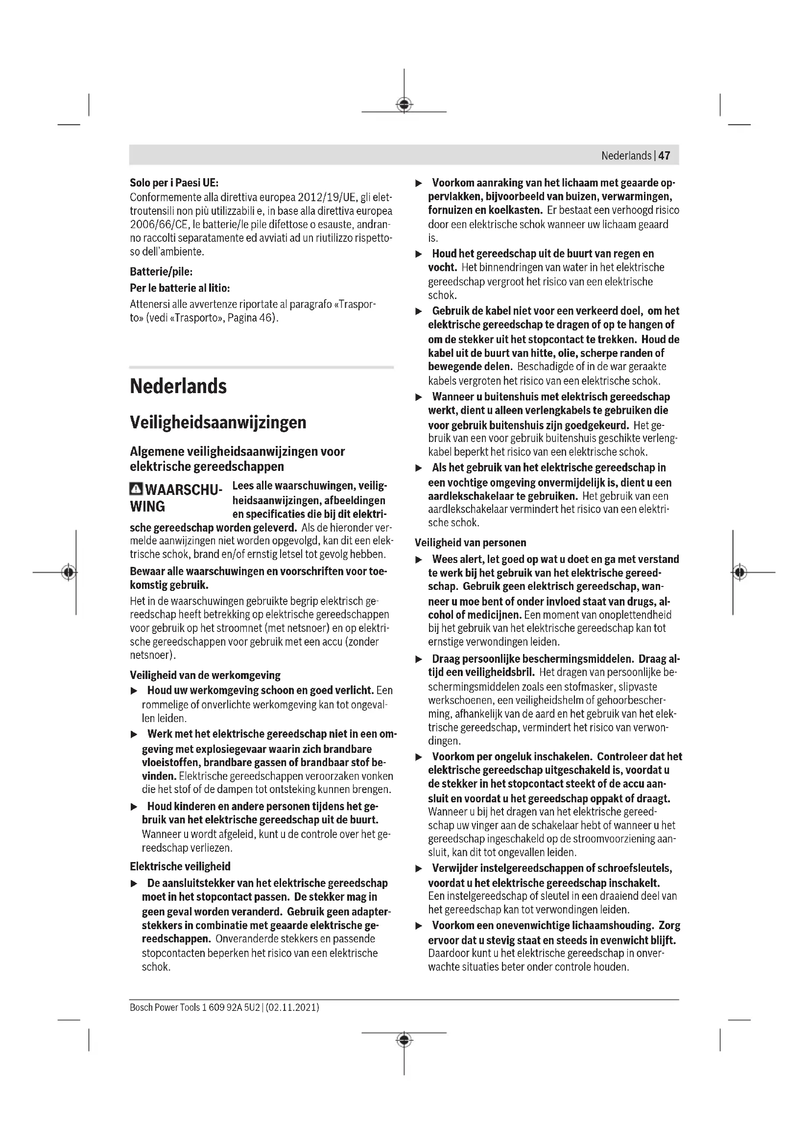 10,5 1,5 Bosch Power Tools 1 609 92A 5U2 | (02.11.2021)44 | Italiano Il livello di vibrazione ed il valore di emissione acustica indi- cati nelle presenti istruzioni sono stati rilevati conformemen- te ad una procedura di misurazione unificata e sono utilizza- bili per confrontare gli elettroutensili. Le stesse procedure sono idonee anche per una valutazione temporanea del livel- lo di vibrazione e dell’emissione acustica. Il livello di vibrazione ed il valore di emissione acustica sono riferiti agli impieghi principali dell’elettroutensile; qualora, tuttavia, l’elettroutensile venisse utilizzato per altre applica- zioni, oppure con accessori differenti o in caso di insufficien- te manutenzione, il livello di vibrazione ed il valore di emis- sione acustica potrebbero variare. Ciò potrebbe aumentare sensibilmente l’emissione di vibrazioni e l’emissione acustica sull’intero periodo di funzionamento. Per valutare con precisione i valori di vibrazione e di emissio- ne acustica, andranno considerati anche i periodi nei quali l’utensile sia spento, oppure acceso, ma non utilizzato. Ciò potrebbe ridurre sensibilmente l’emissione di vibrazioni e l’emissione acustica sull’intero periodo di funzionamento. Adottare misure di sicurezza supplementari per proteggere l’operatore dall’effetto delle vibrazioni: ad esempio, sottopo- nendo a manutenzione l’elettroutensile e gli utensili accesso- ri, mantenendo calde le mani e organizzando i vari processi di lavoro. Montaggio u Prima di qualsiasi intervento sull’elettroutensile (ad es. interventi di manutenzione, sostituzione dell’ac- cessorio ecc.), prelevare la batteria, anche nel caso in cui occorra trasportarlo o conservarlo. In caso di azio- namento accidentale dell’interruttore di avvio/arresto sussiste pericolo di lesioni. Ricarica della batteria u Utilizzare esclusivamente i caricabatterie indicati nei dati tecnici. Soltanto questi caricabatterie sono adatti al- le batterie al litio utilizzate nell’elettroutensile. Avvertenza: La batteria viene fornita solo parzialmente cari- ca. Per garantire l’intera potenza della batteria, prima dell’impiego iniziale, ricaricare completamente la batteria nell’apposito caricabatteria. La batteria al litio può essere ricaricata in qualsiasi momento senza ridurne la durata. Un’interruzione dell’operazione di ri- carica non danneggia la batteria. La batteria al litio è protetta contro lo scaricamento comple- to dal sistema «Electronic Cell Protection (ECP)». In caso di batteria scarica l’elettroutensile si spegne attraverso un in- terruttore automatico: l’accessorio non si muove più. u Dopo lo spegnimento automatico dell’elettroutensile, non premere ulteriormente l’interruttore di avvio/ar- resto. La batteria potrebbe subire danni. Si prega di attenersi alle indicazioni relative allo smaltimen- to. Rimozione della batteria La batteria (8) è dotata di due inserti di bloccaggio che devo- no impedire che la batteria stessa cada all’esterno in caso di pressione accidentale del tasto di sbloccaggio batteria (9). Fintanto che la batteria ricaricabile è inserita nell’elettrou- tensile, la stessa è tenuta in posizione tramite una molla. Per rimuovere la batteria (8), premere il tasto di sbloccaggio (9) ed estrarre verso l’alto la batteria dall’elettroutensile. Durante tale operazione, non esercitare forza. Indicatore del livello di carica della batteria I LED verdi dell’apposito indicatore indicano il livello di cari- ca della batteria. Per ragioni di sicurezza, il livello di carica si può verificare esclusivamente ad elettroutensile fermo. Per visualizzare il livello di carica, premere il tasto dell’indi- catore livello di carica della batteria o . Ciò sarà possibi- le anche a batteria rimossa. Se premuto il tasto dell’indicatore livello di carica della batte- ria non si illumina alcun LED, ciò significa che la batteria è di- fettosa e che deve essere sostituita. Tipo di batteria GBA 18V... LED Autonomia Luce fissa, 3 LED verdi 60−100% Luce fissa, 2 LED verdi 30−60% Luce fissa, 1 LED verde 5−30% Luce lampeggiante, 1 LED verde 0−5% Tipo di batteria ProCORE18V... LED Autonomia Luce fissa, 5 LED verde 80−100 % Luce fissa, 4 LED verde 60−80 % Luce fissa, 3 LED verdi 40−60 % Luce fissa, 2 LED verdi 20−40 % Luce fissa, 1 LED verde 5−20 % Luce lampeggiante, 1 LED verde 0−5 % Cambio degli utensili (vedere Fig. A) u Prima di qualsiasi intervento sull’elettroutensile (ad es. interventi di manutenzione, sostituzione dell’ac- cessorio ecc.), prelevare la batteria, anche nel caso in cui occorra trasportarlo o conservarlo. In caso di azio- namento accidentale dell’interruttore di avvio/arresto sussiste pericolo di lesioni. Se l’interruttore di accensione/spegnimento (14) non viene azionato il mandrino di foratura si blocca. Ciò consente di eseguire una sostituzione veloce, comoda e semplice dell’utensile nel mandrino. 1 609 92A 5U2 | (02.11.2021) Bosch Power ToolsItaliano | 45 Aprire il mandrino autoserrante (2) ruotandolo nel senso di rotazione ➊, finché l’utensile non può essere inserito. Inseri- re l’utensile. Chiudere manualmente la bussola del mandrino autoserran- te (2), ruotando con forza nel senso di rotazione ➋. In que- sto modo il mandrino si blocca automaticamente. Aspirazione polvere/aspirazione trucioli Polveri e materiali come vernici contenenti piombo, alcuni ti- pi di legname, minerali e metalli possono essere dannosi per la salute. Il contatto oppure l’inalazione delle polveri possono causare reazioni allergiche e/o malattie delle vie respiratorie dell’utilizzatore, oppure delle persone che si trovano nelle vi- cinanze. Determinate polveri come polvere da legname di faggio o di quercia sono considerate cancerogene, in modo particolare insieme ad additivi per il trattamento del legname (cromato, protezione per legno). Eventuale materiale contenente amianto andrà lavorato esclusivamente da personal
