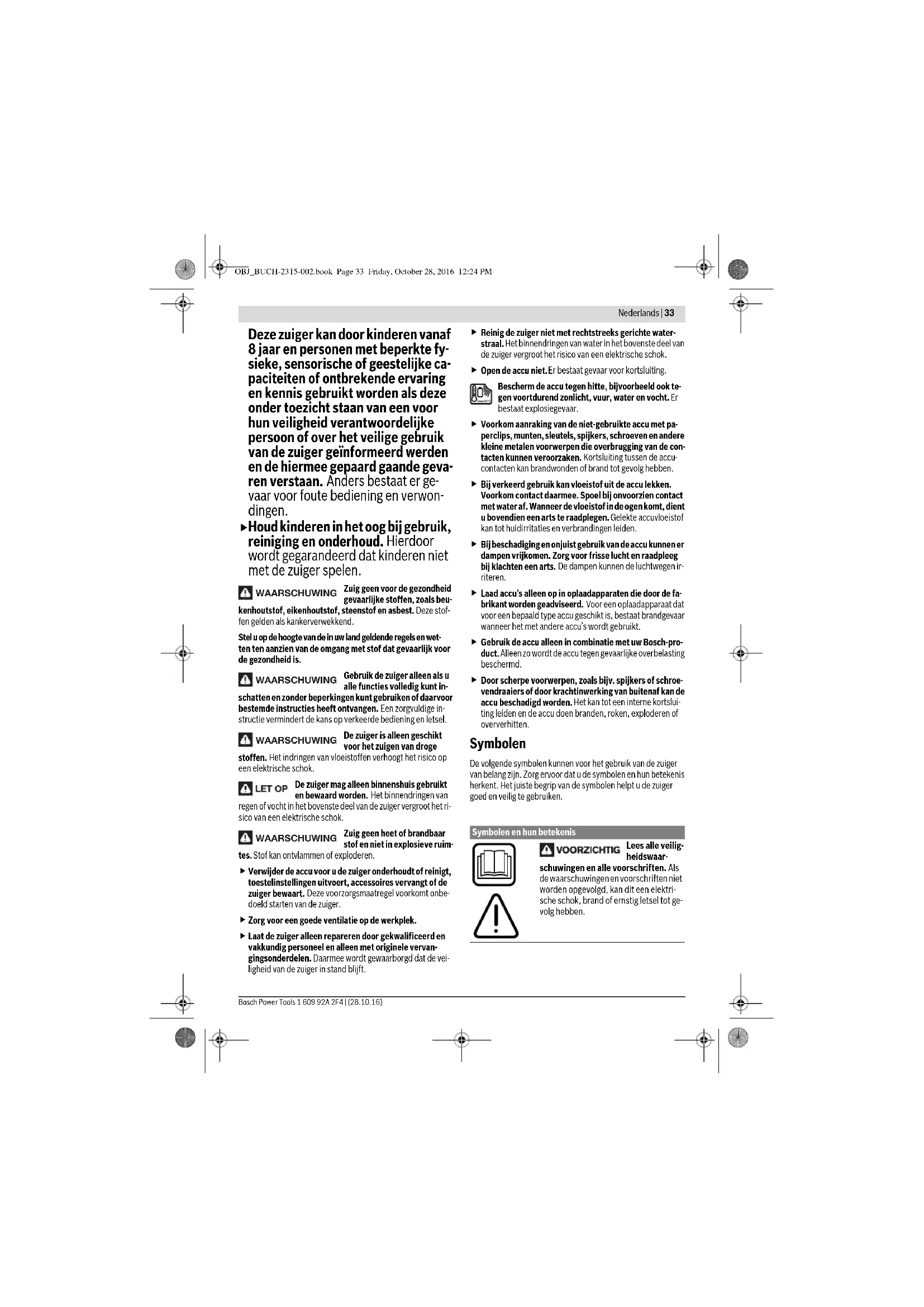 Deze zuiger is niet bestemd voor het gebruik door kinderen en personen met beperkte fysieke, sensorische of geestelijke capaciteiten of ge- brekkige ervaring en kennis. OBJ_BUCH-2315-002.book Page 32 Friday, October 28, 2016 12:24 PMNederlands | 33 Bosch Power Tools 1 609 92A 2F4 | (28.10.16) Deze zuiger kan door kinderen vanaf 8 jaar en personen met beperkte fy- sieke, sensorische of geestelijke ca- paciteiten of ontbrekende ervaring en kennis gebruikt worden als deze onder toezicht staan van een voor hun veiligheid verantwoordelijke persoon of over het veilige gebruik van de zuiger geïnformeerd werden en de hiermee gepaard gaande geva- ren verstaan. Anders bestaat er ge- vaar voor foute bediening en verwon- dingen.