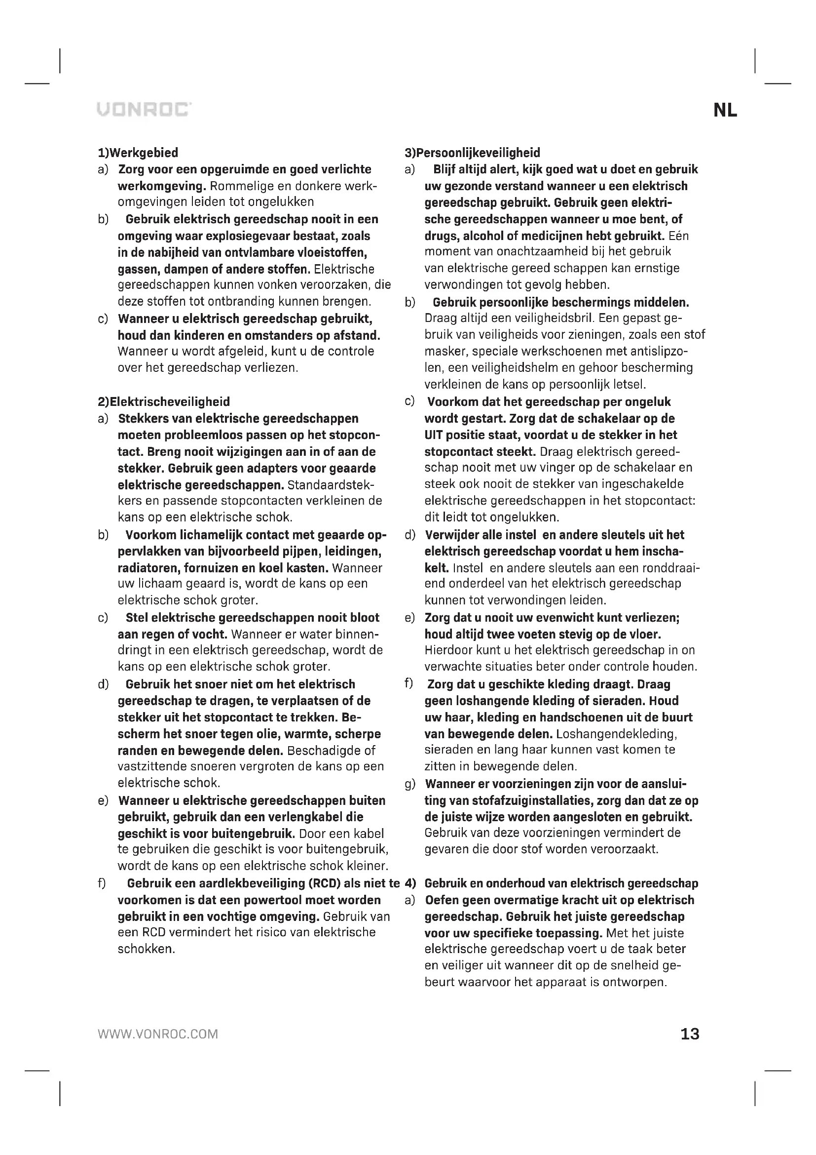 Zorg dat de machine niet onder spanning staat wanneer onderhoudswerkzaamheden aan het mechaniek worden uitgevoerd. Reinig de machinebehuizing regelmatig met een zachte doek, bij voorkeur iedere keer na gebruik. Zorg dat de ventilatiesleuven vrij van stof en vuil zijn. Gebruik bij hardnekkig vuil een zachte doek bevochtigd met zeepwater. Gebruik geen oplosmid- delen als benzine, alcohol, ammonia, etc. Dergelij- ke stoffen beschadigen de kunststof onderdelen. MILIEU Defecte en/of afgedankte elektrische of elektronische gereedschappen dienen ter verwerking te worden aangeboden aan een daarvoor verantwoordelijke instantie. Uitsluitend voor EG-landen Werp elektrisch gereedschap niet weg bij het huisvuil. Conform de Europese Richtlijn 2012/19/ EG voor Afgedankte Elektrische en Elektronische Apparatuur en de implementatie ervan in nationaal recht moet niet langer te gebruiken elektrisch gereedschap gescheiden worden verzameld en op een milieuvriendelijke wijze worden verwerkt. GARANTIE VONROC producten zijn ontworpen volgens de hoogste kwaliteitsstandaarden en gegarandeerd vrij van defecten, zowel materieel als fabrieksfouten, tijdens de wettelijk vastgestelde garantieperiode vanaf de eerste aankoopdatum. Mocht het product tijdens deze periode gebreken vertonen veroorzaakt door defecte materialen en/of fabrieksfouten, neem dan rechtstreeks contact op met VONROC. De volgende situaties vallen niet onder de garantie: